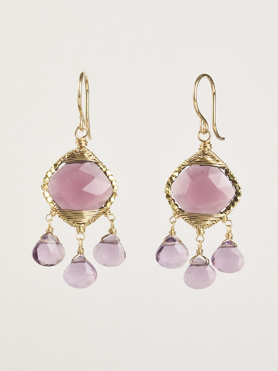 Square-shaped purple quartz drops in gold wire wrapped with gold beads and purple quartz drops