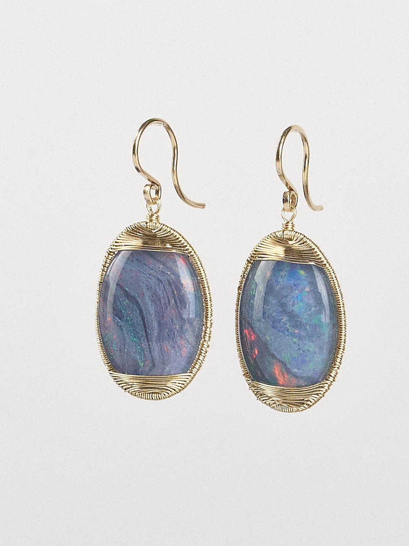 A pair of gold wire-wrapped opal drops