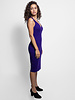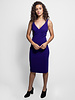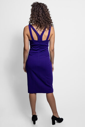 A sleeveless heavy matte jersey v-neck dress with criss-cross strap details and zip back closure.
