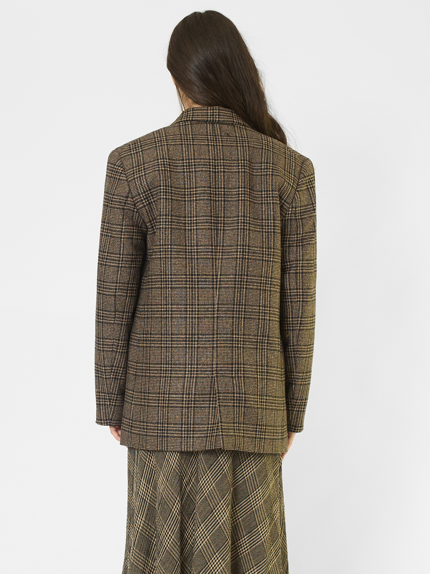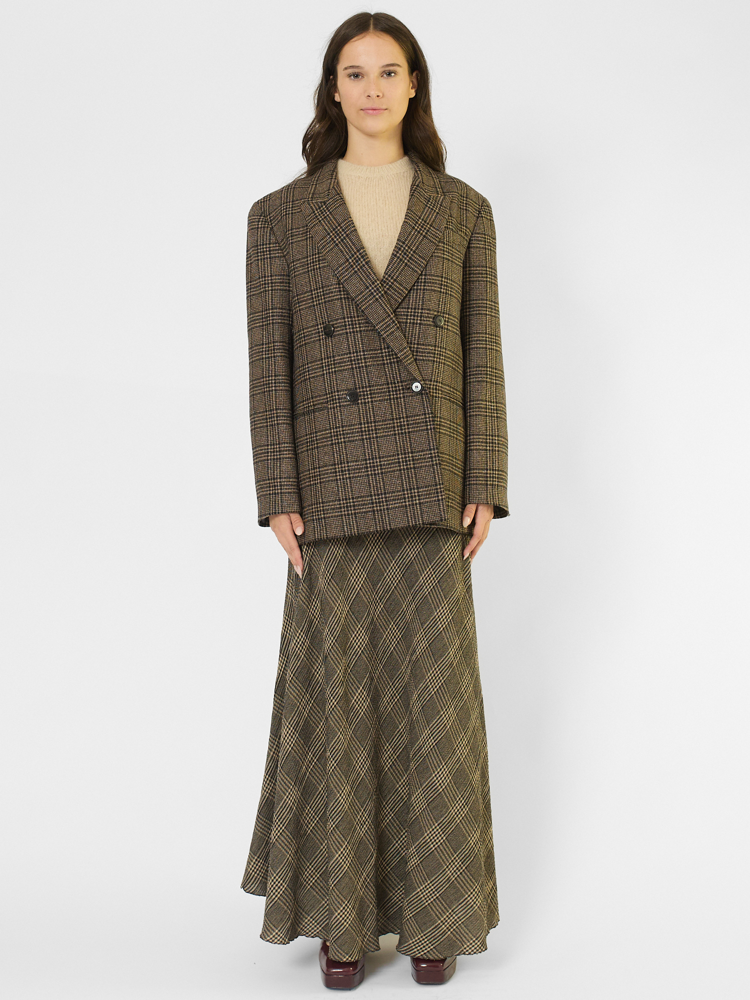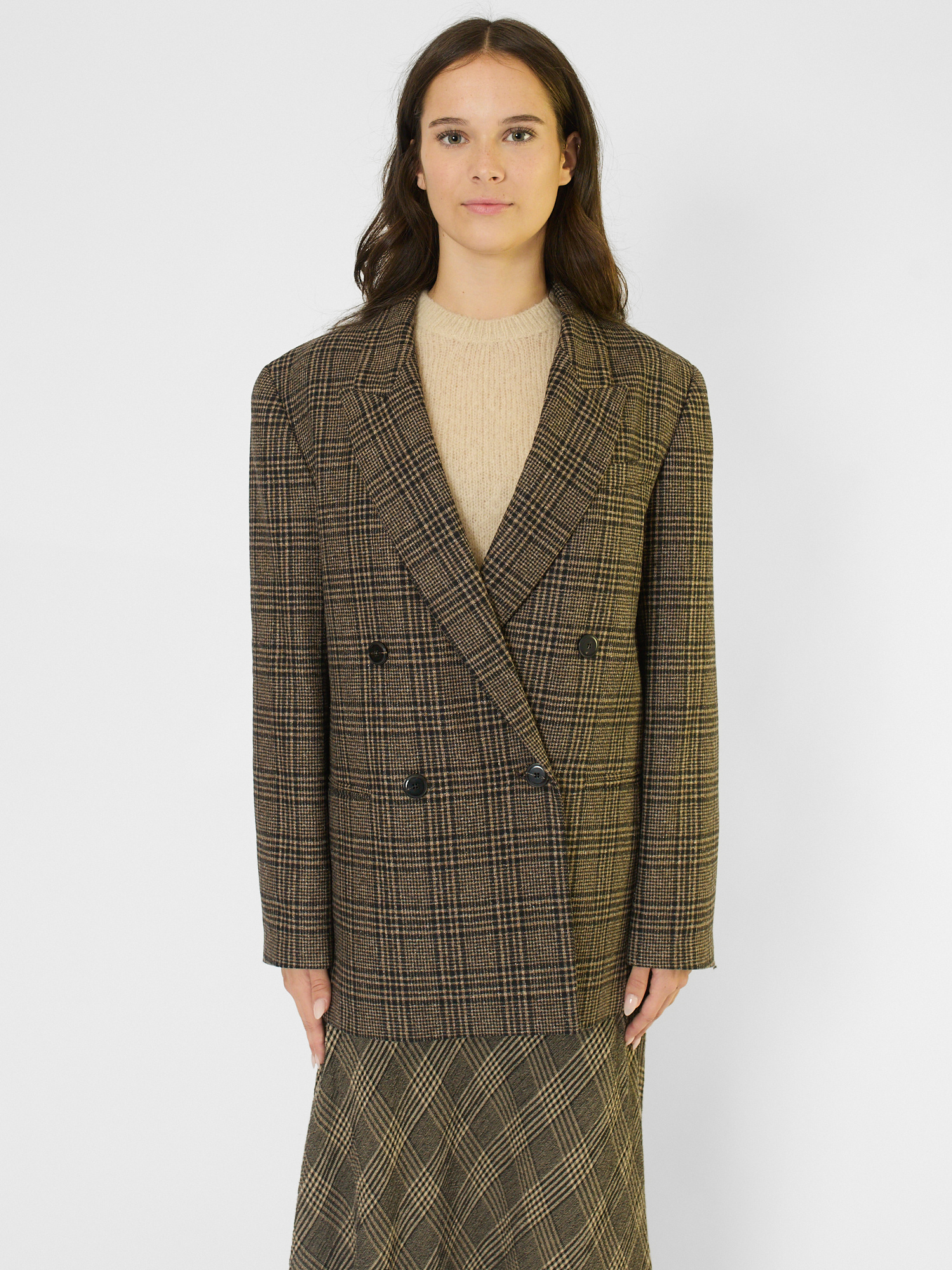 A wool and silk blend jacket features a slightly oversized fit and a double-breasted front.