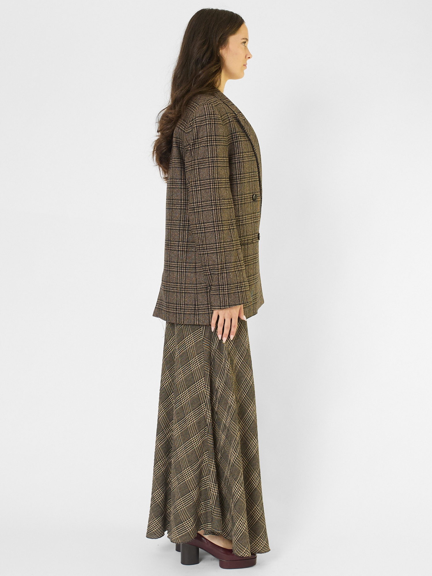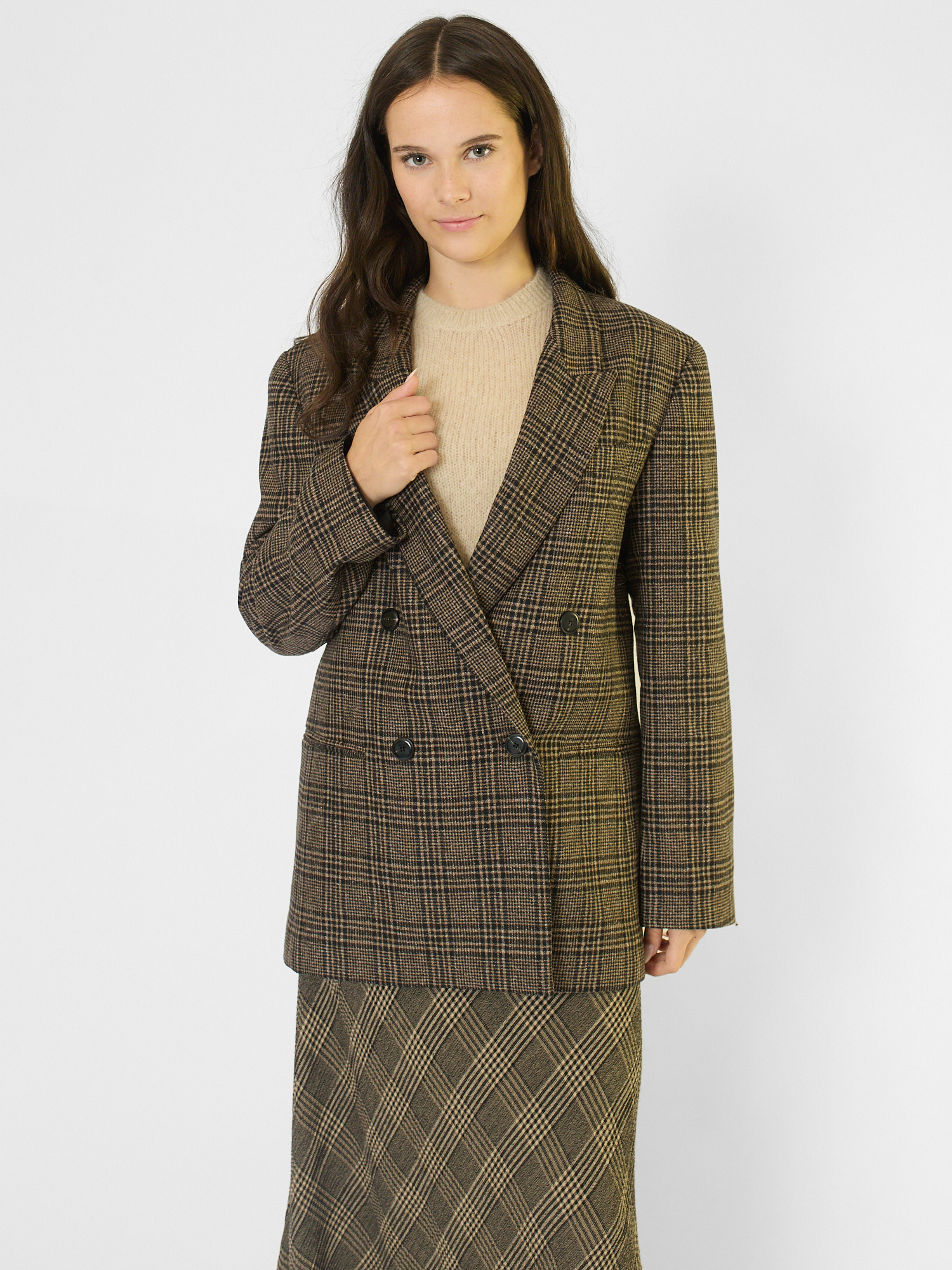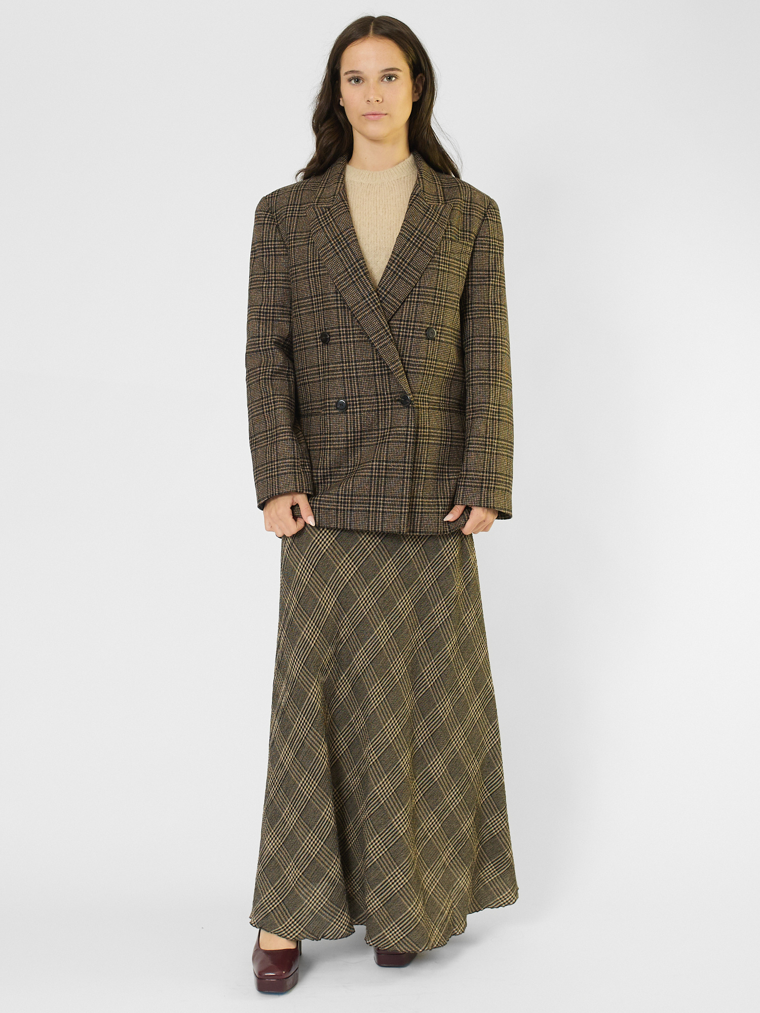 A wool and silk blend jacket features a slightly oversized fit and a double-breasted front.