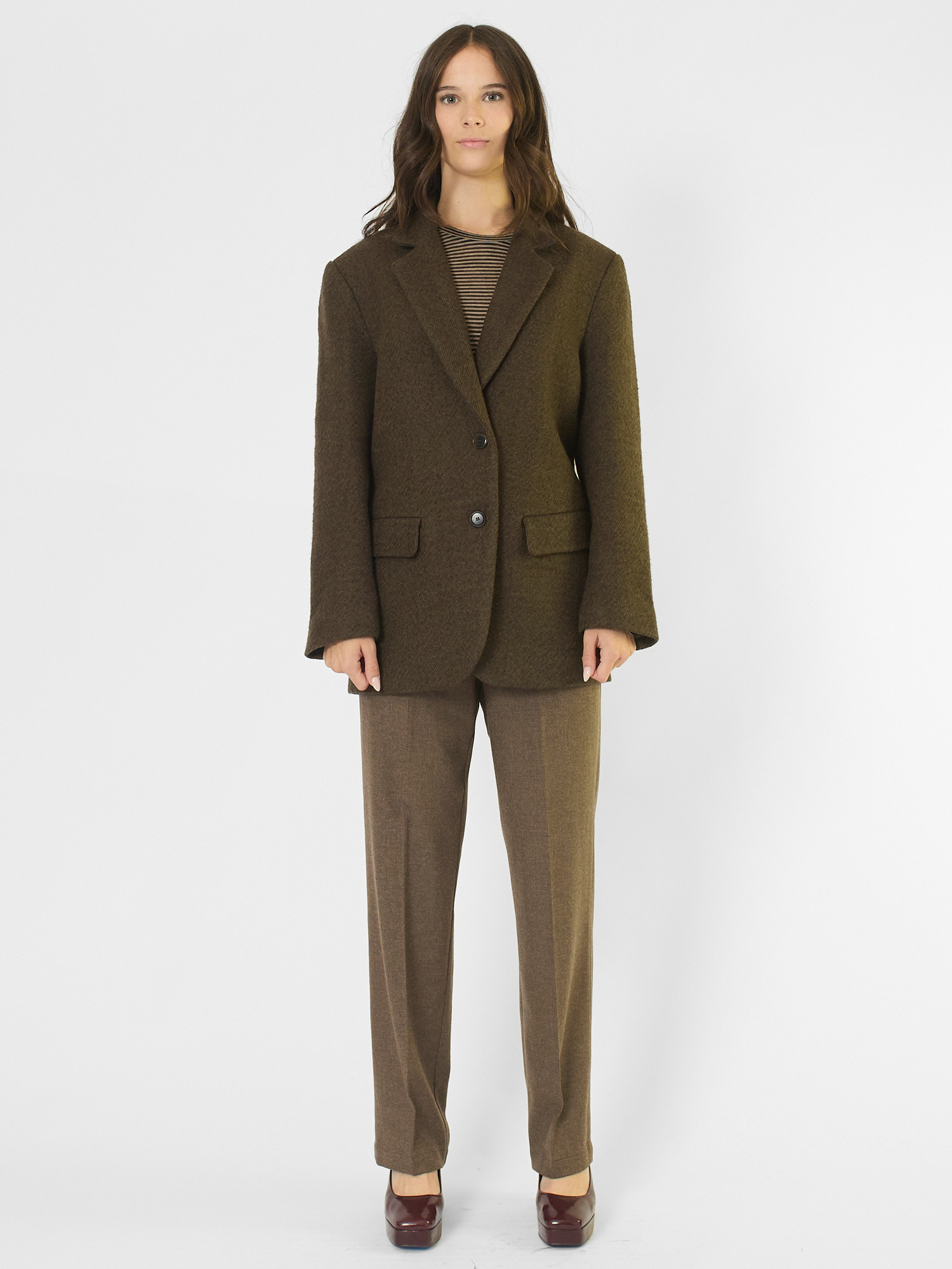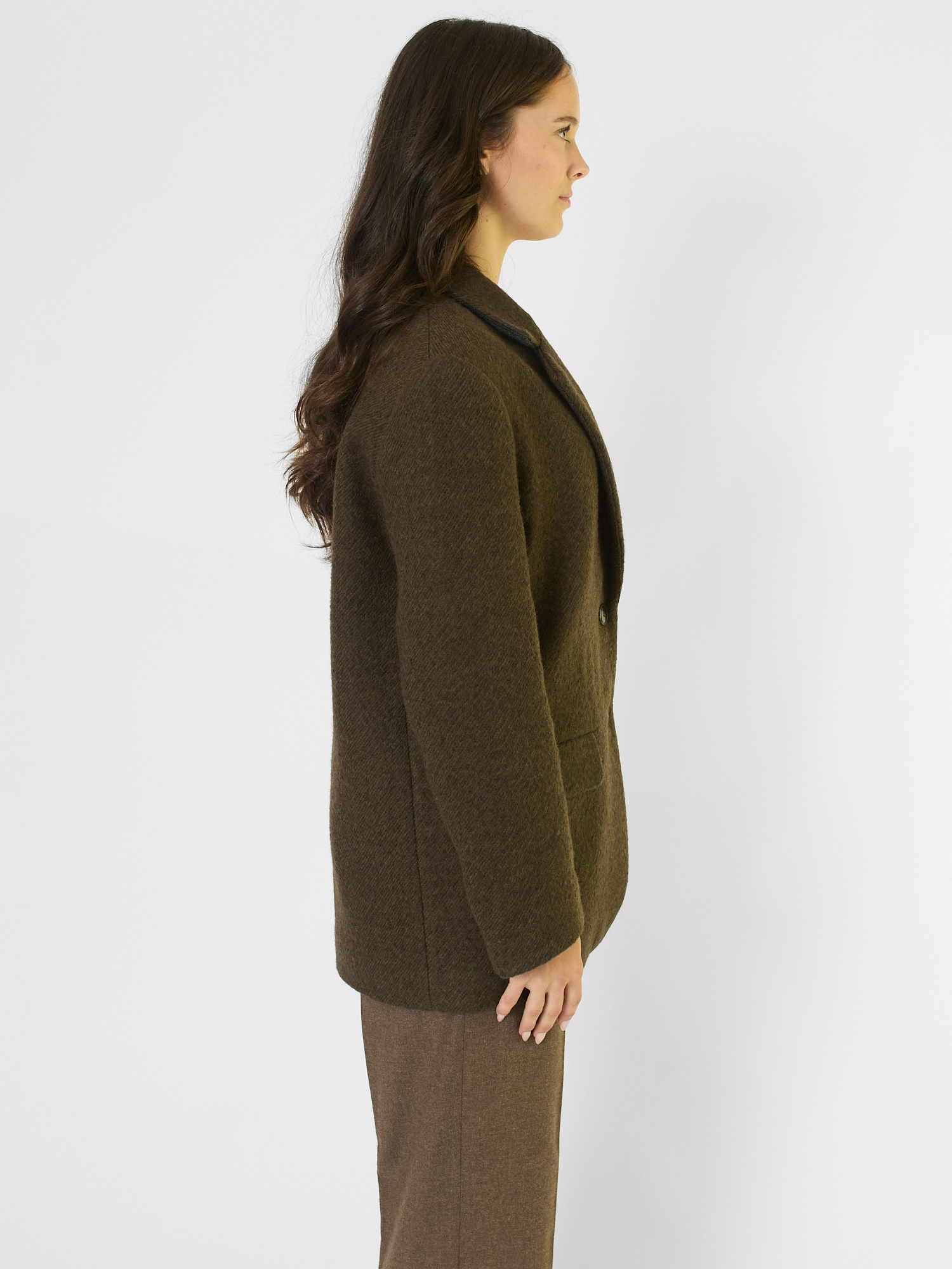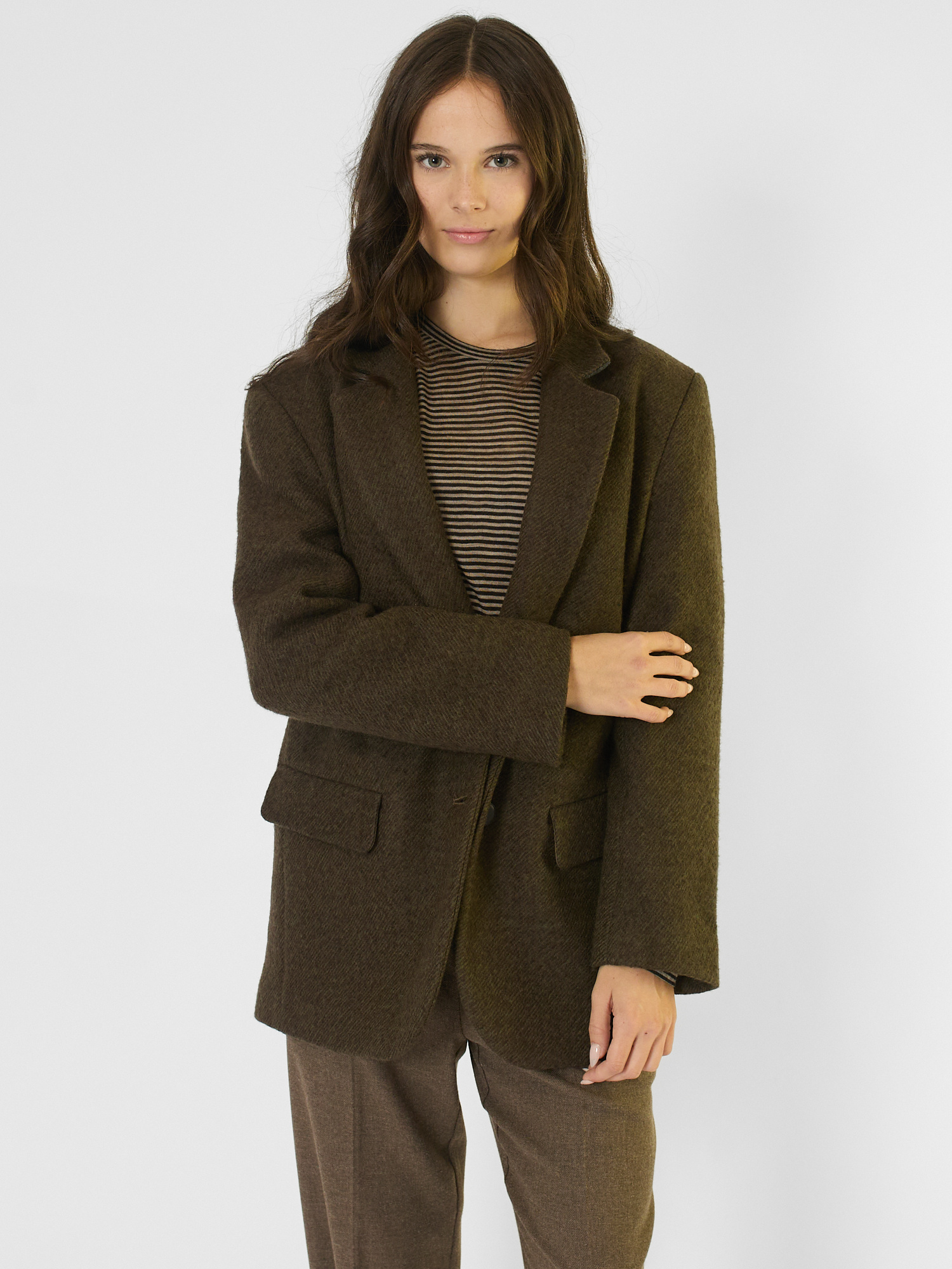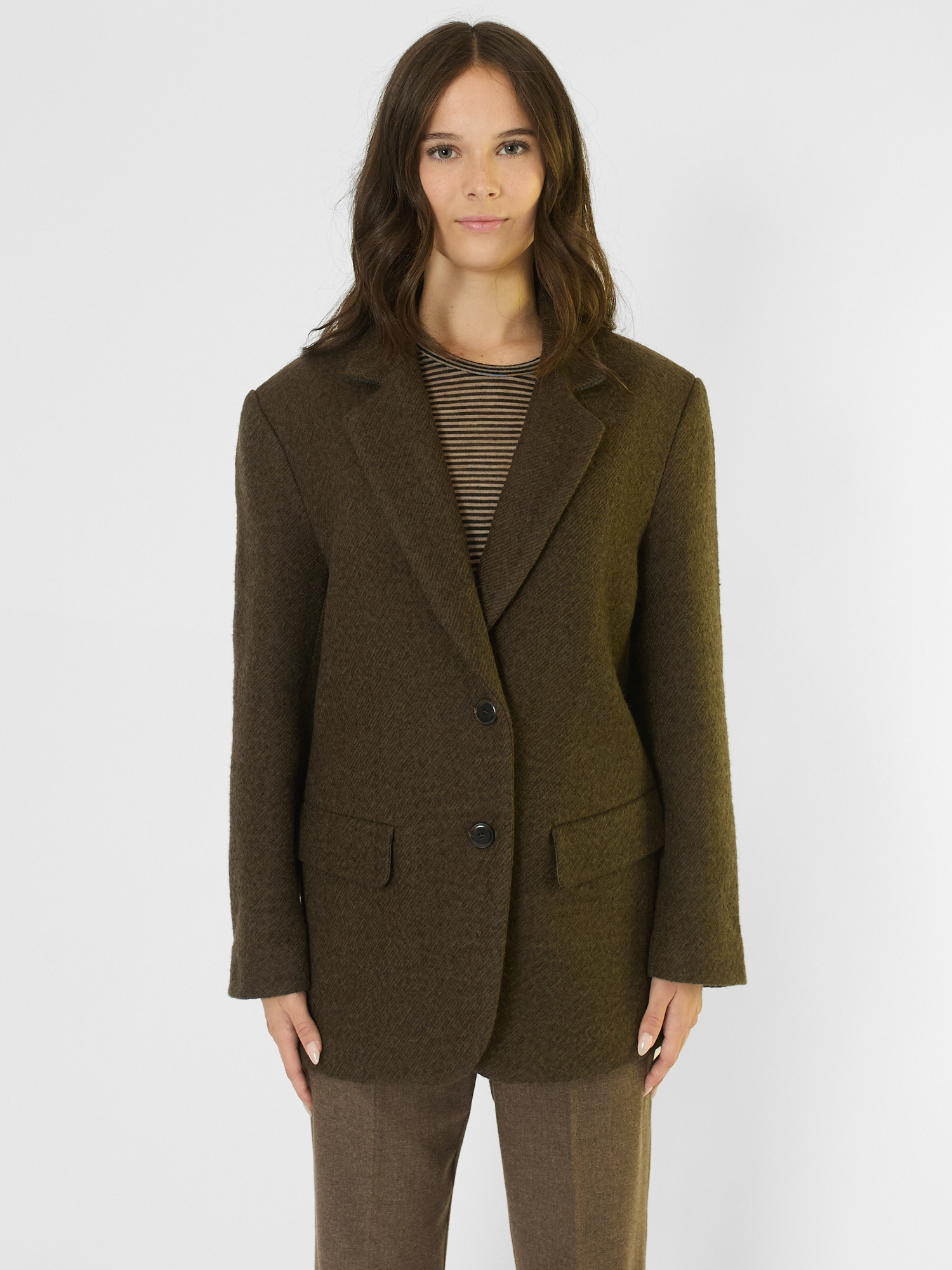 Single-breasted jacket with one button closure, collar with lapels, welt pocket on the chest, side flap pockets,