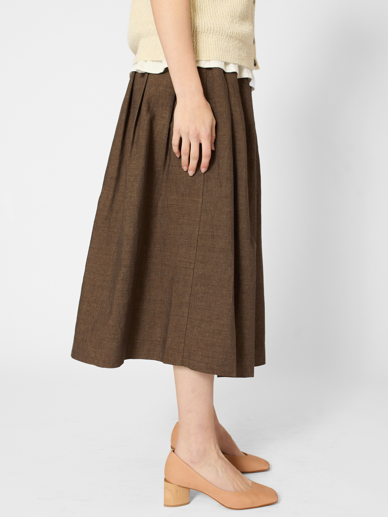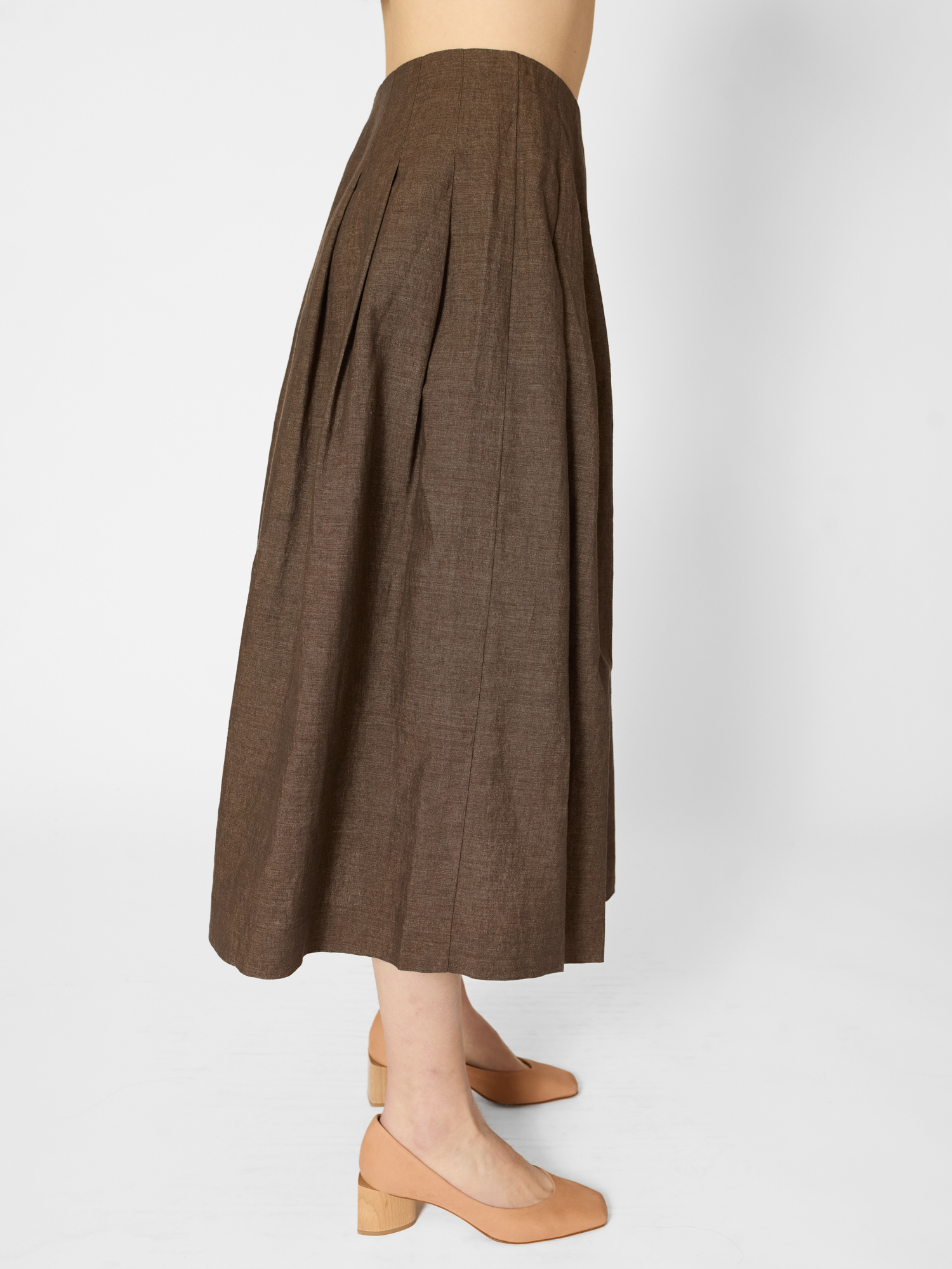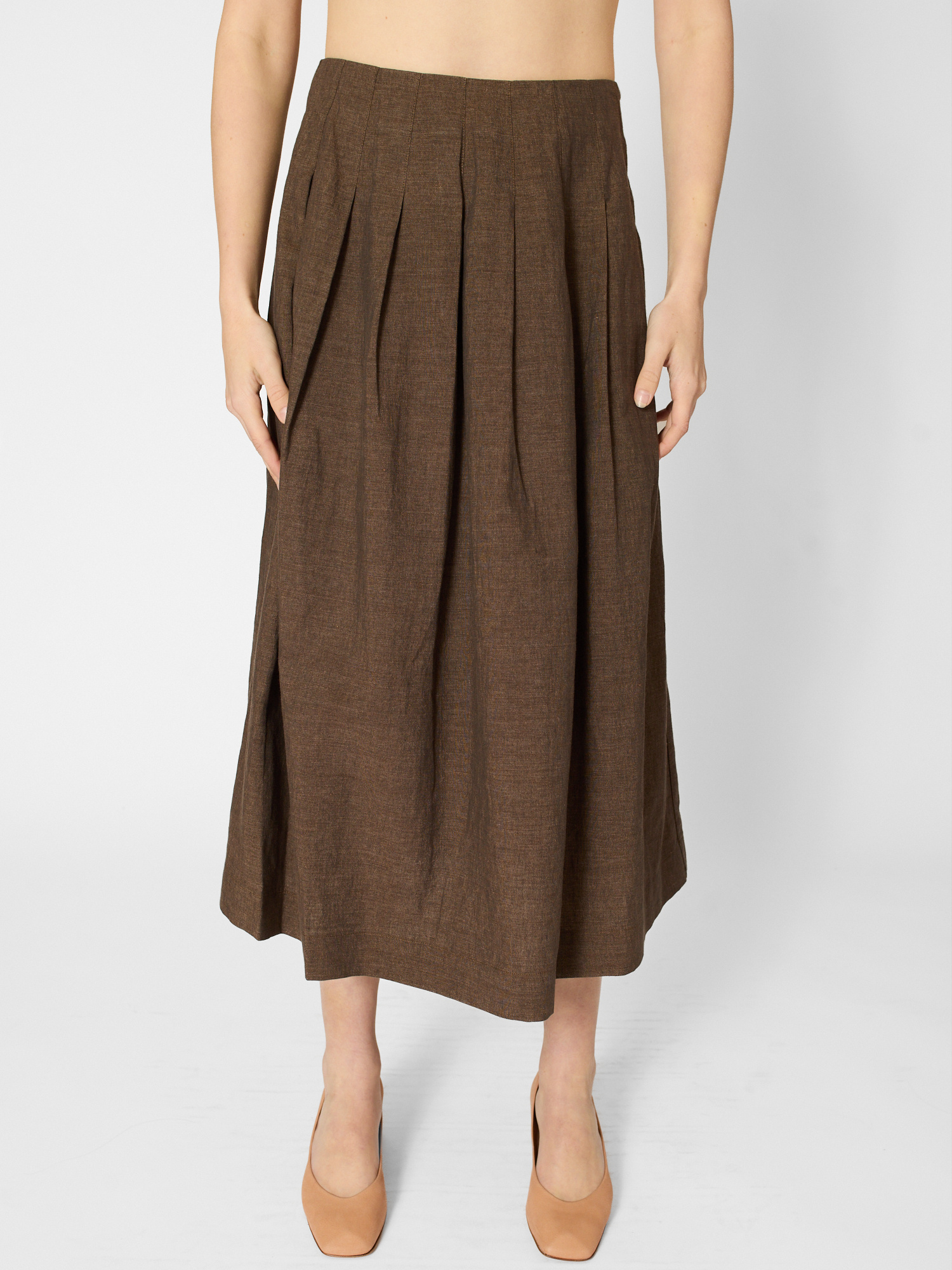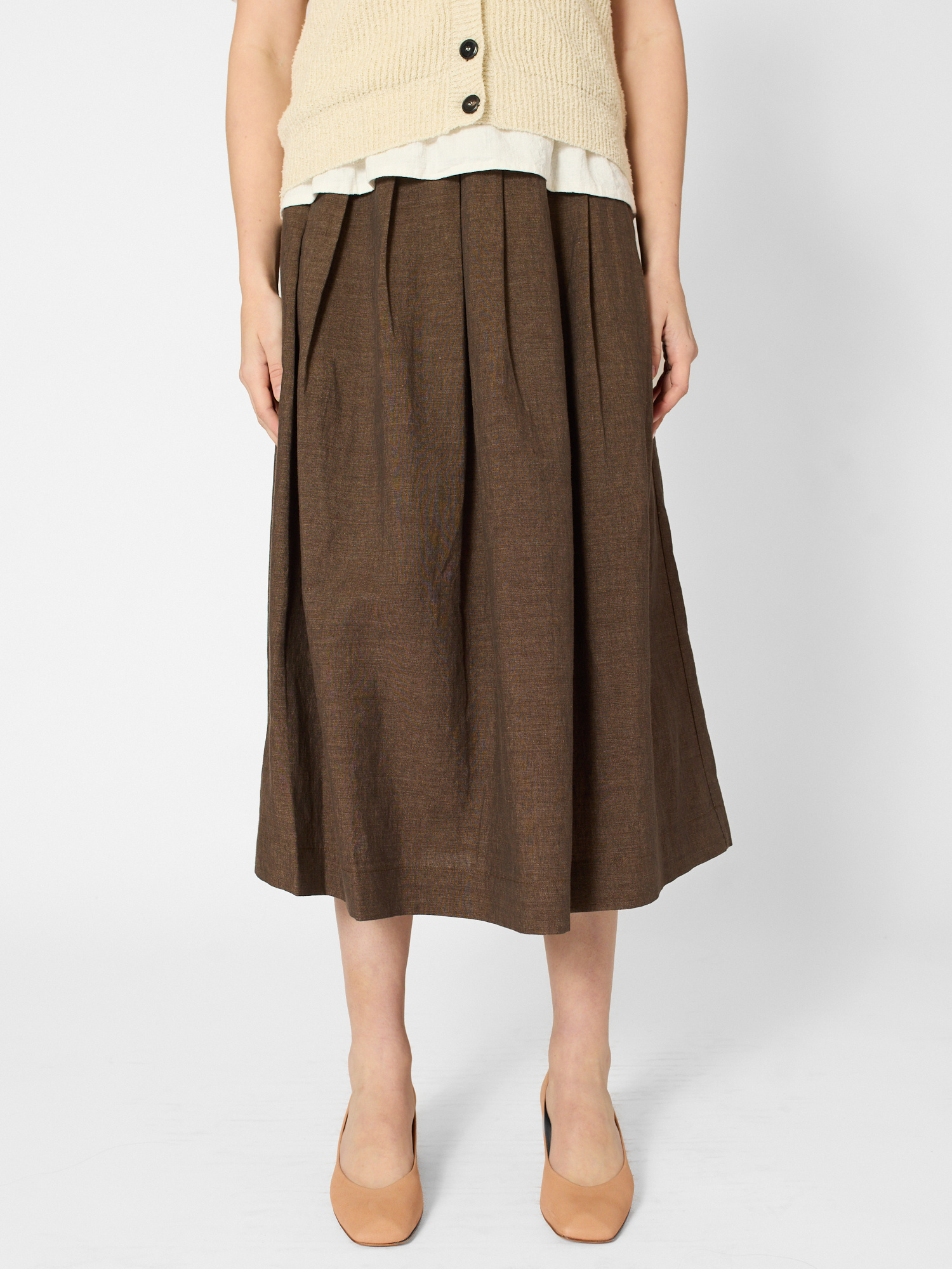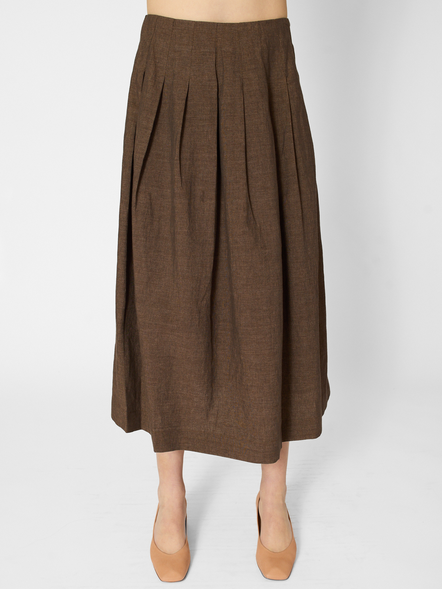 Linen- cotton midi skirt features a flat waistband with pleated pin-tucked details