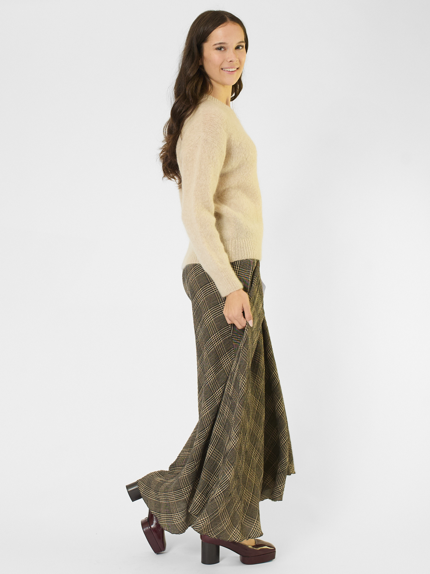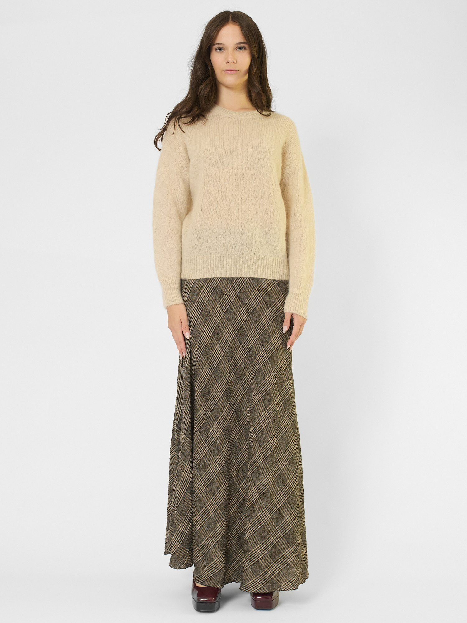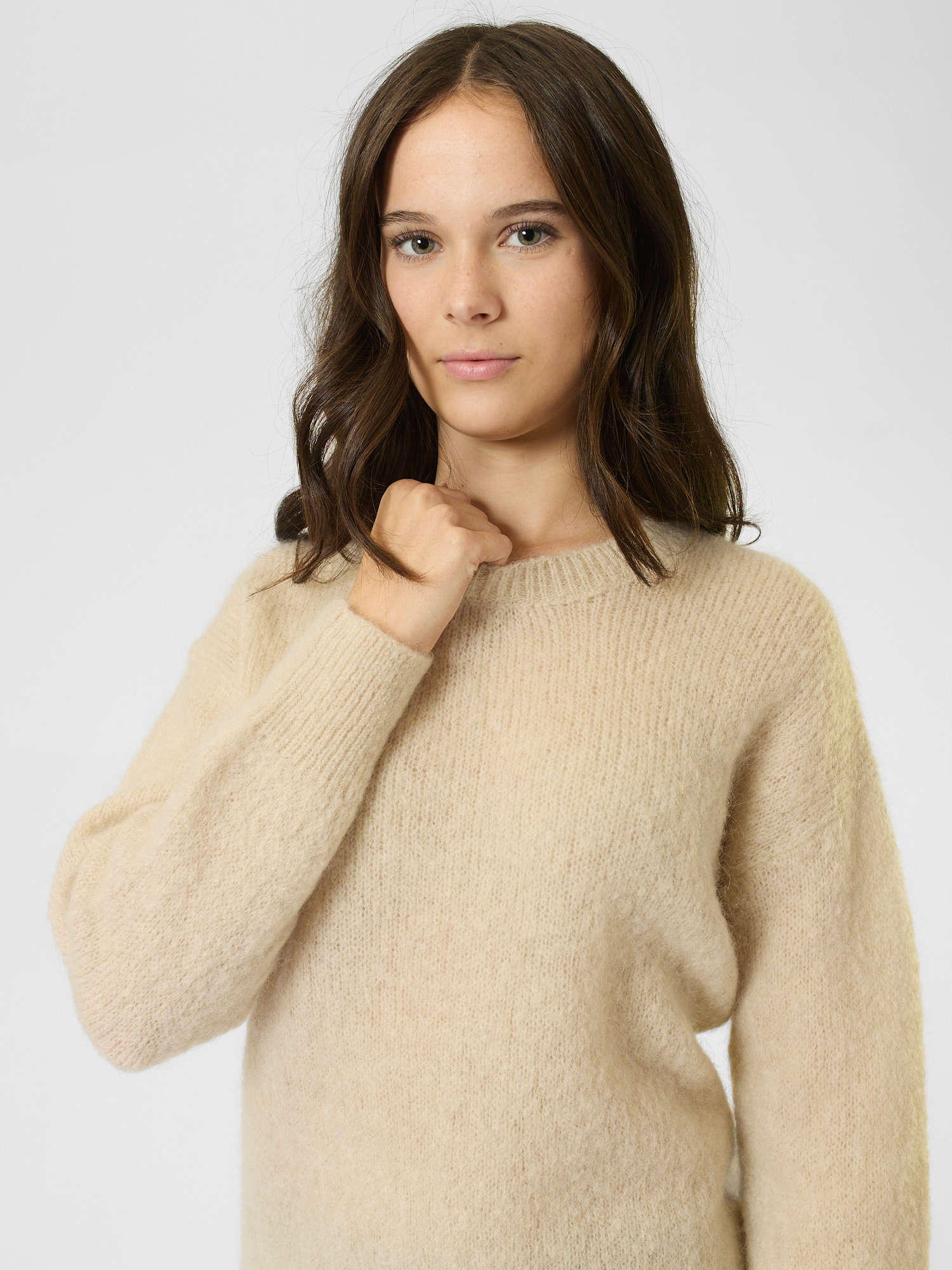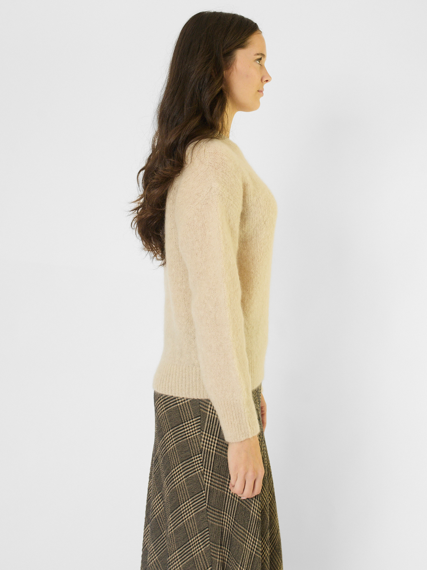 The crew-neck sweater in mohair features lightly dropped shoulders and a loose fit