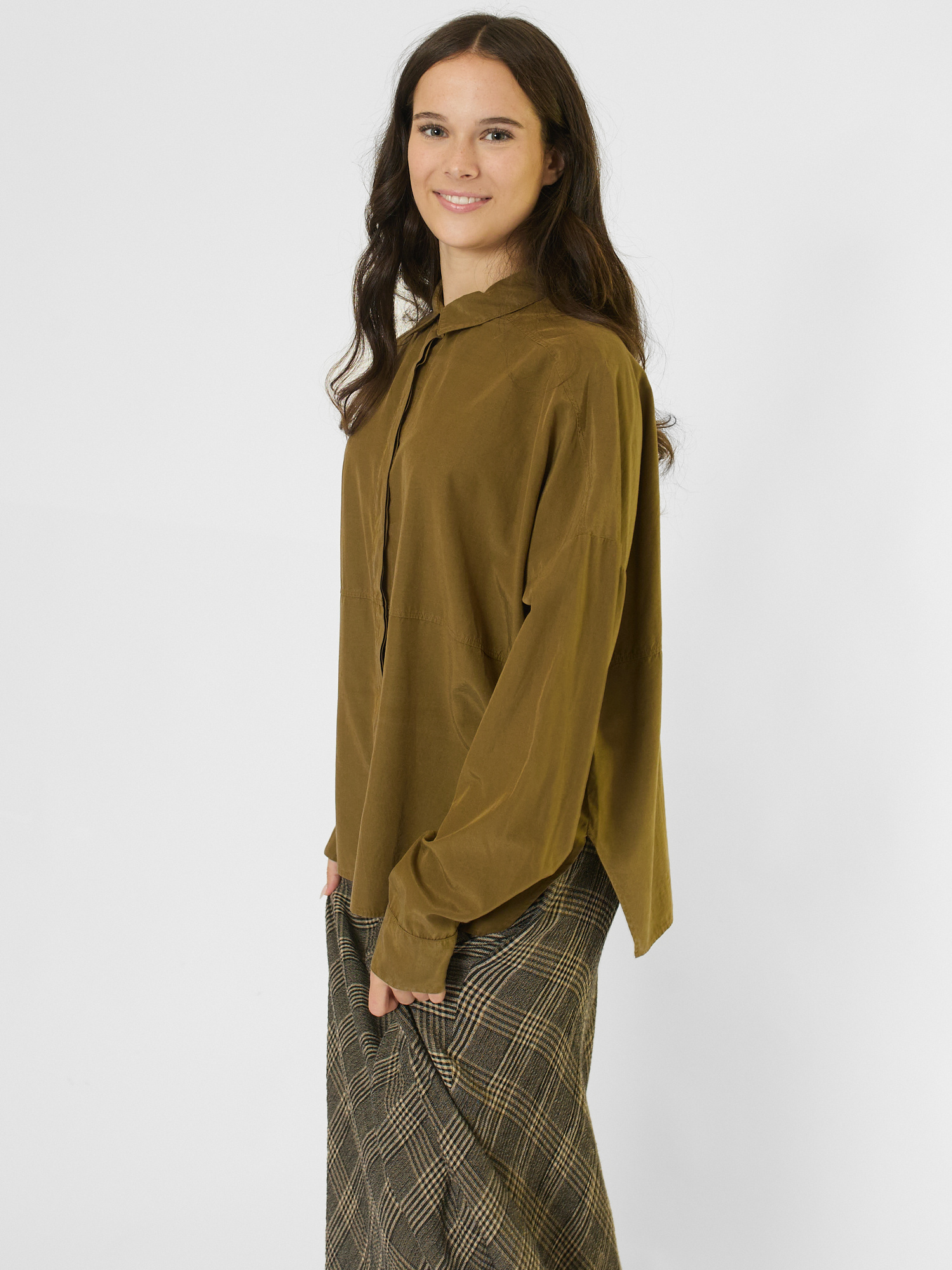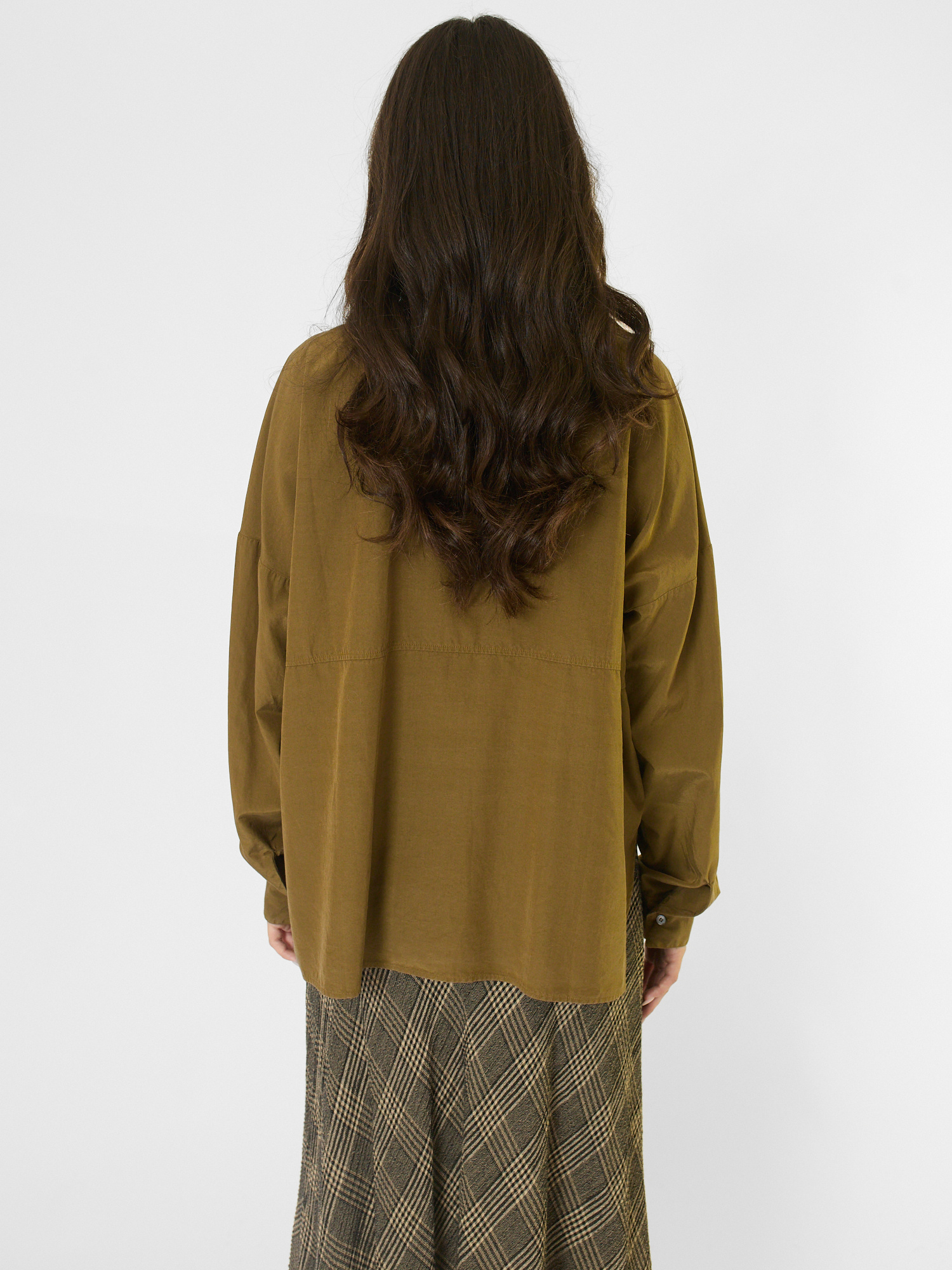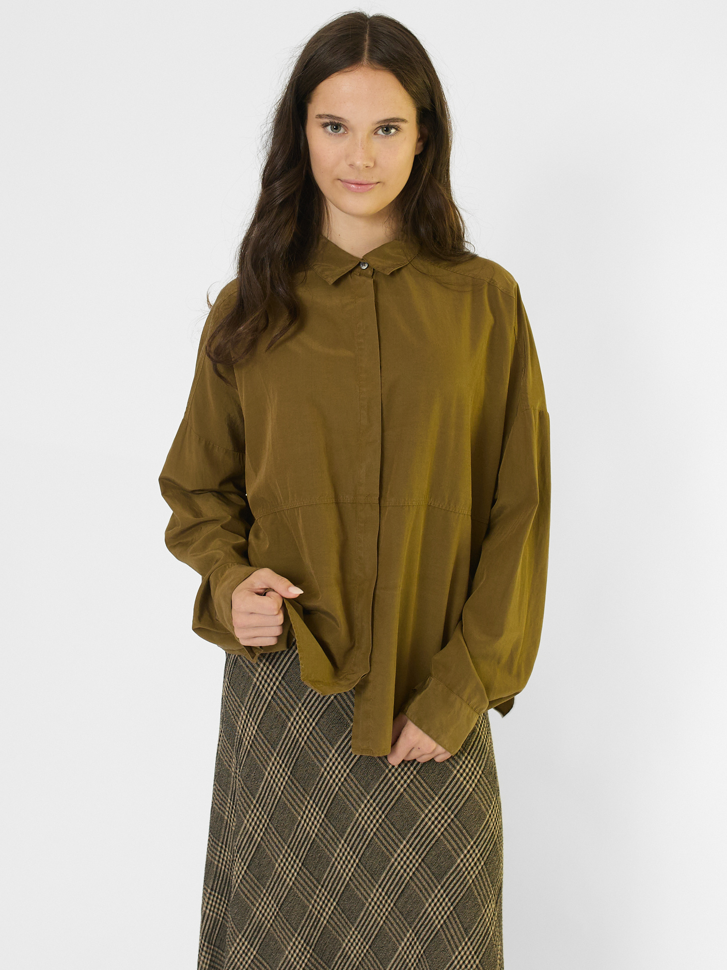 The classic collar shirt with the hidden button placket and the dropped shoulders