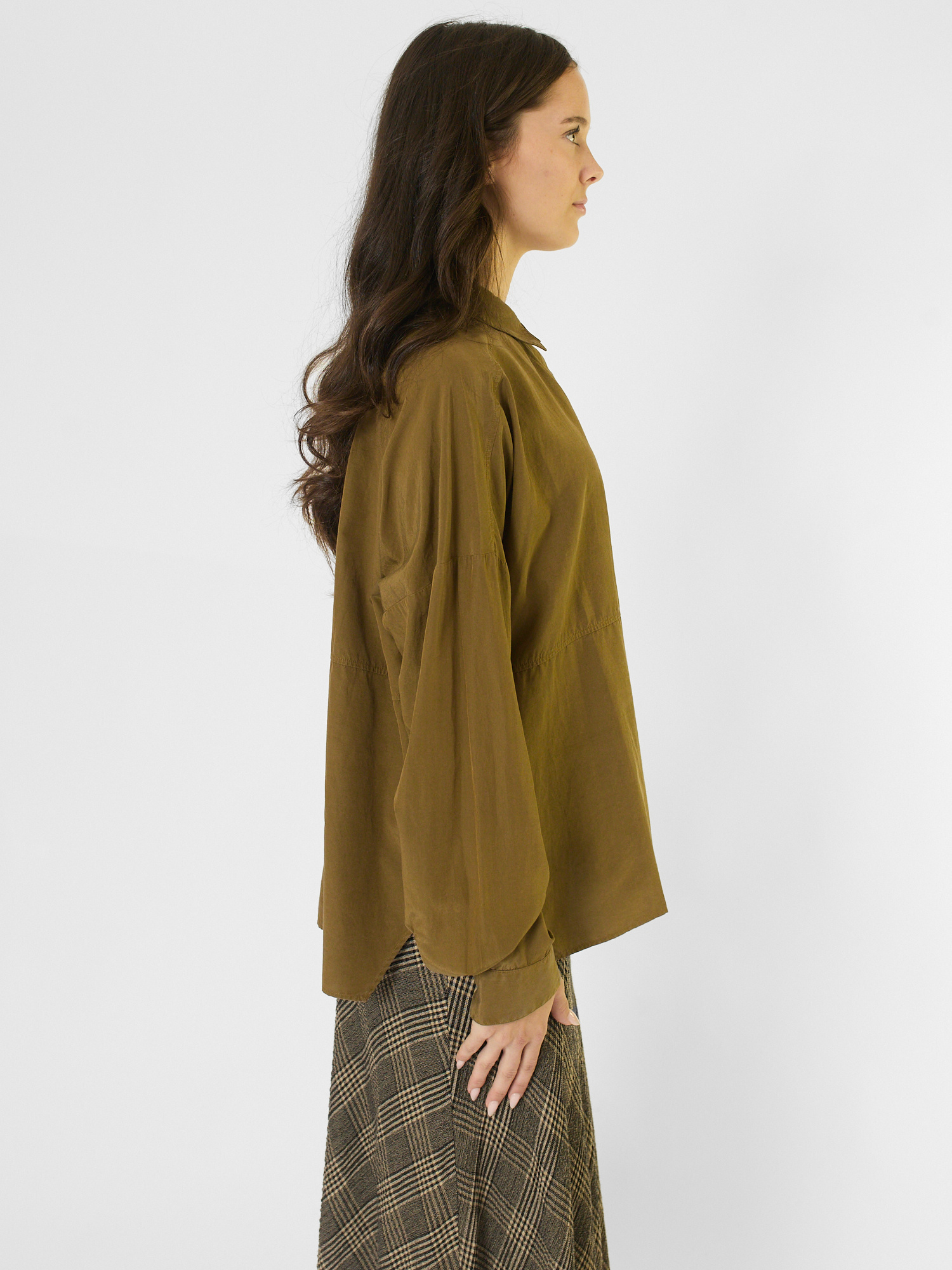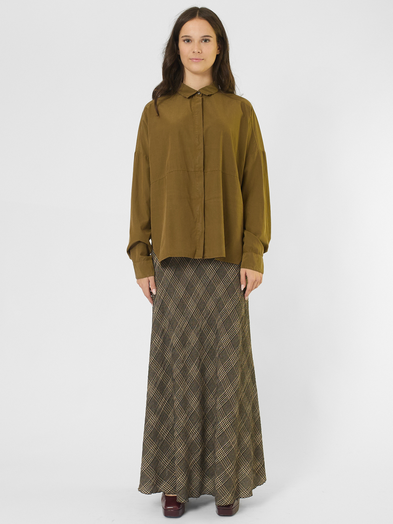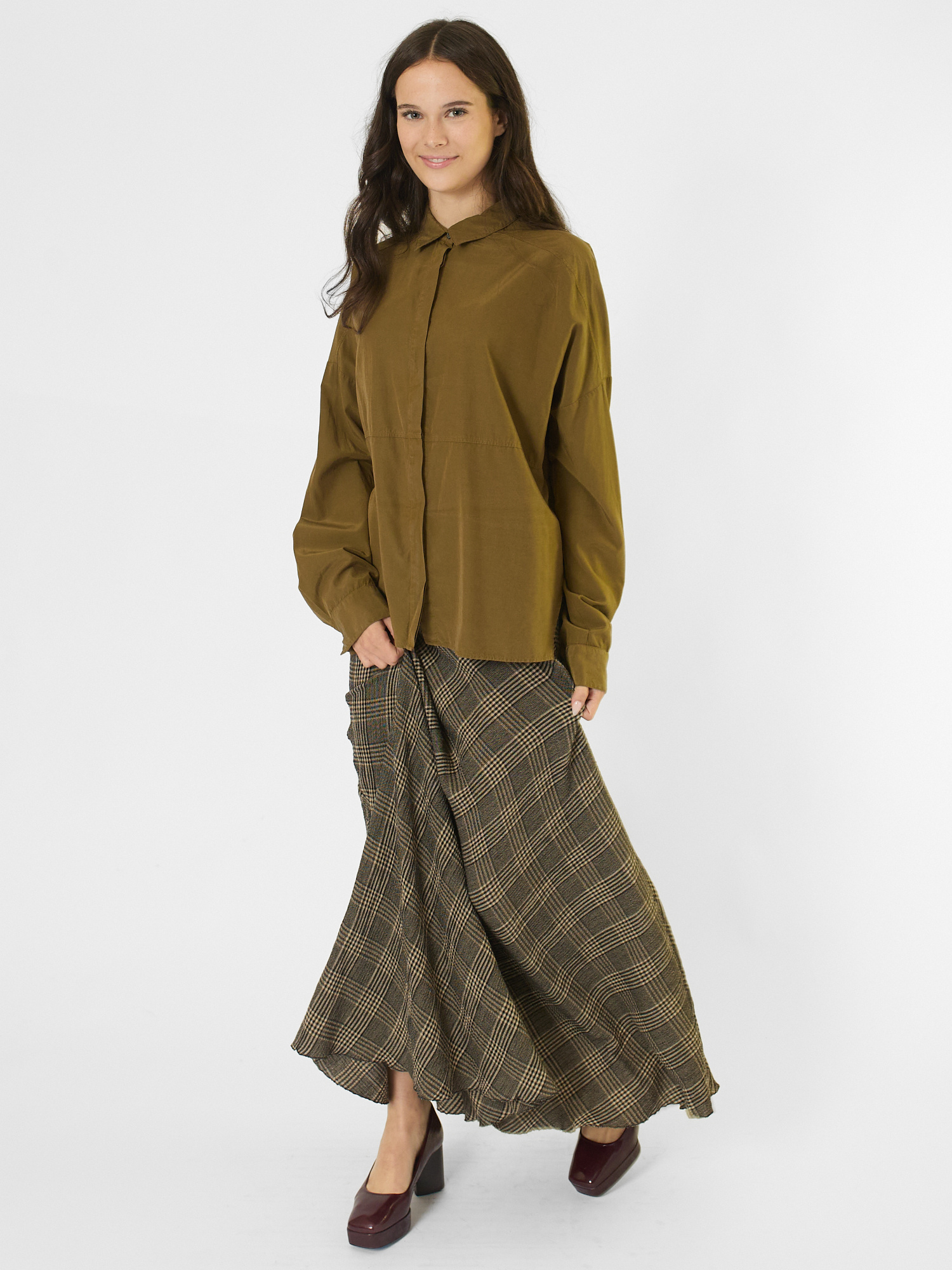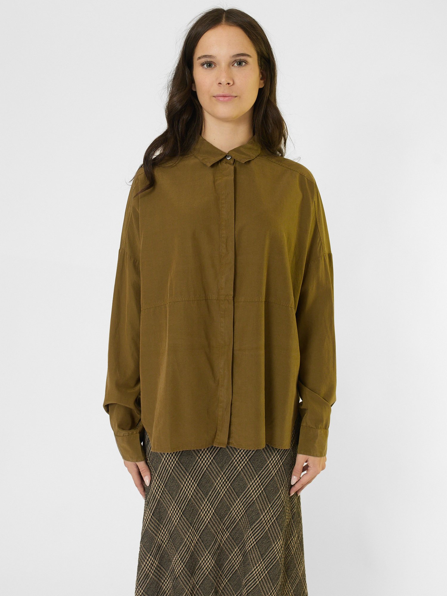The classic collar shirt with the hidden button placket and the dropped shoulders