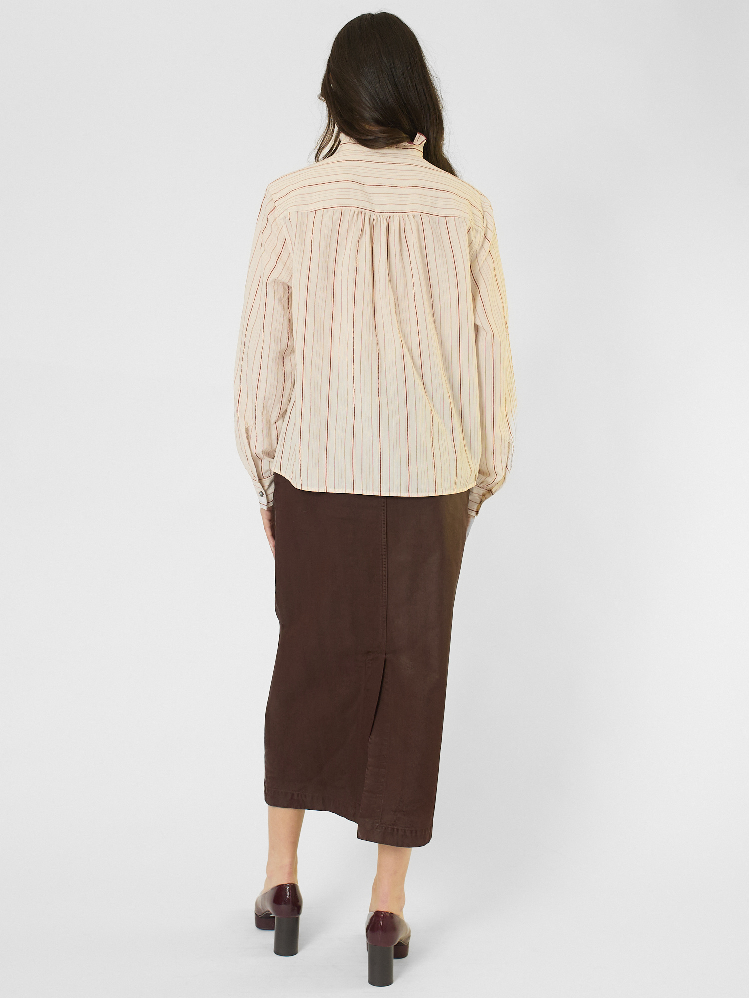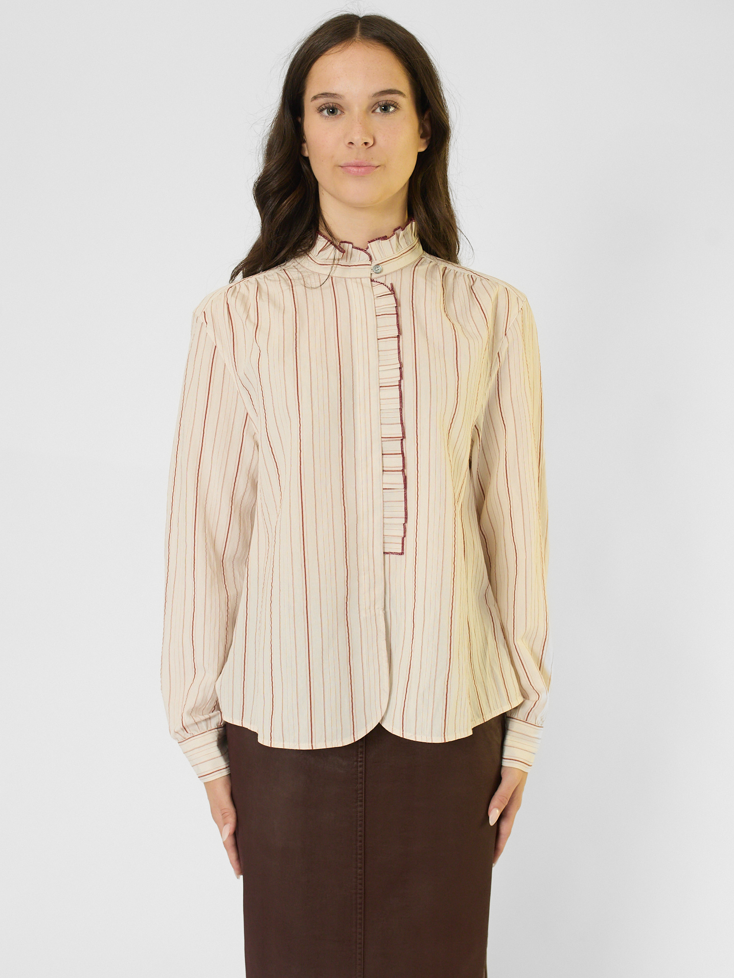 Viscose shirt with macro stripes, the gathered trims that accent the collar, and the polo-style neckline.