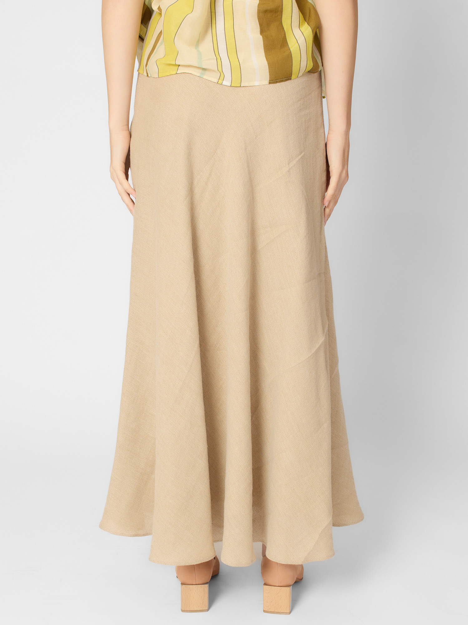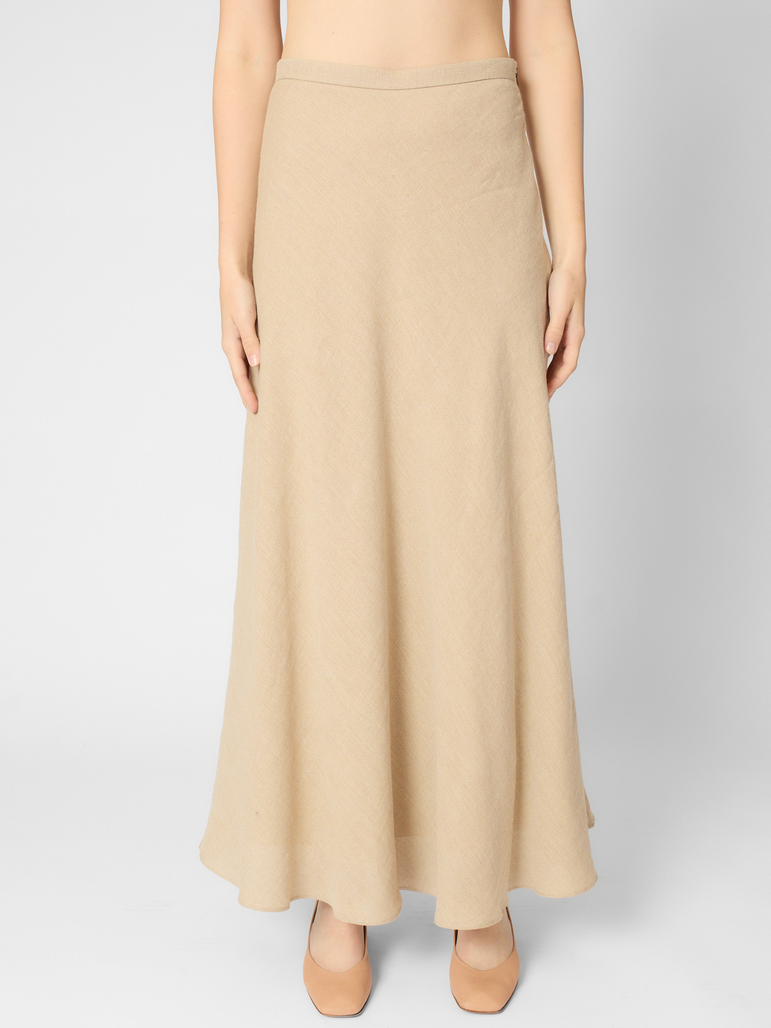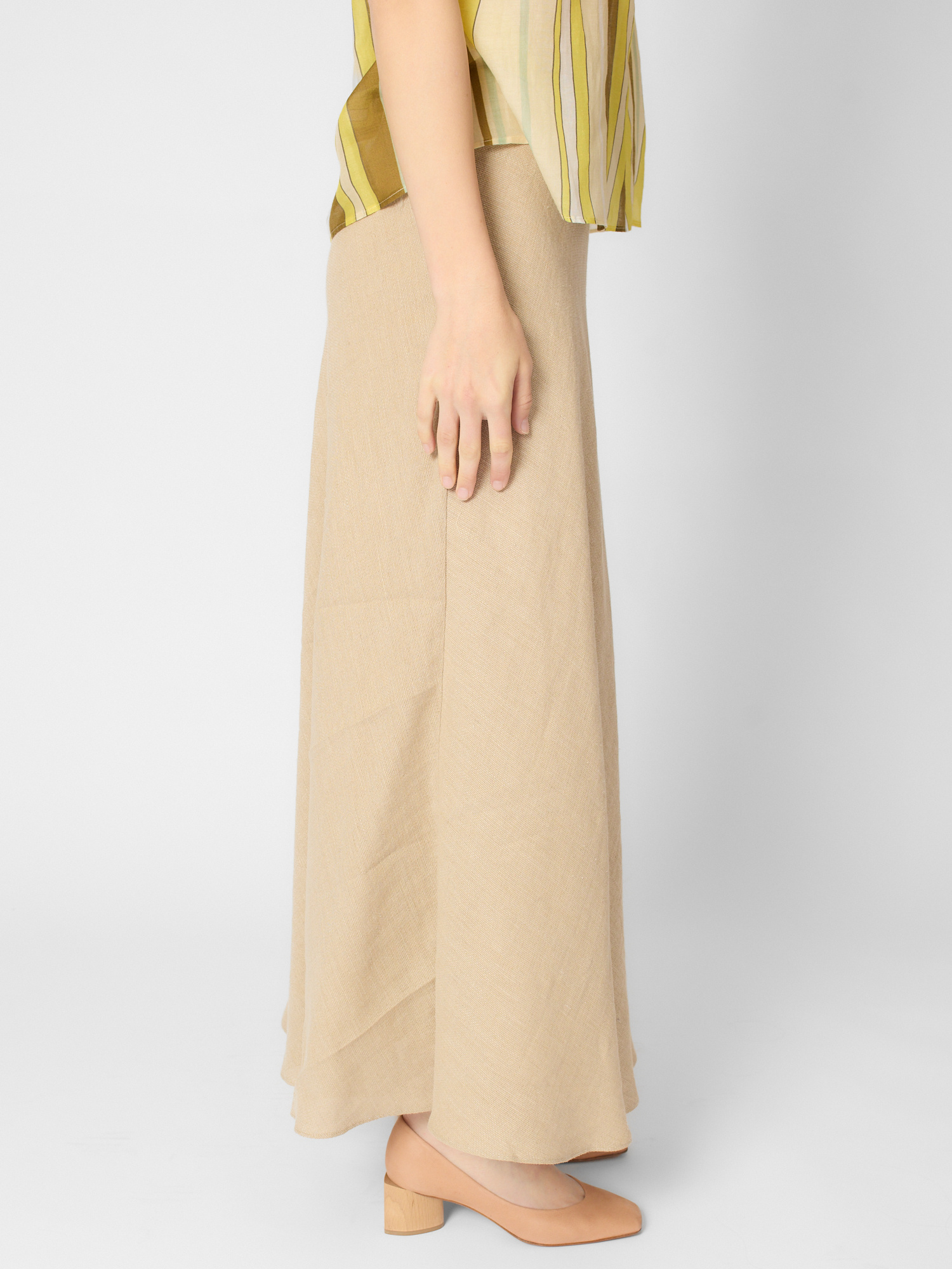 A bias cut of the fabric adds movement to the straight and long volumes.