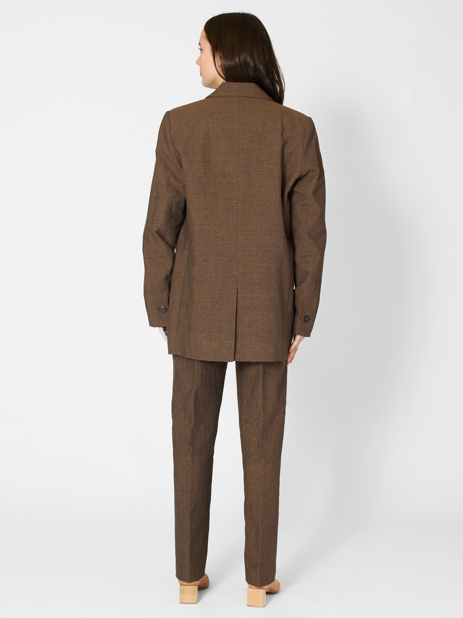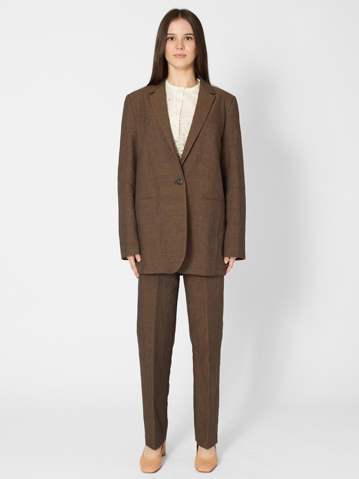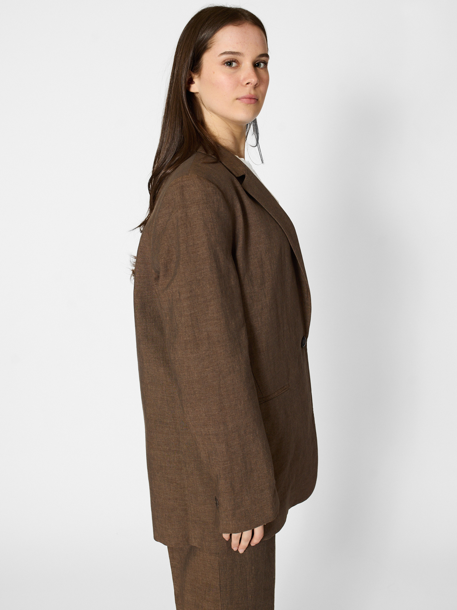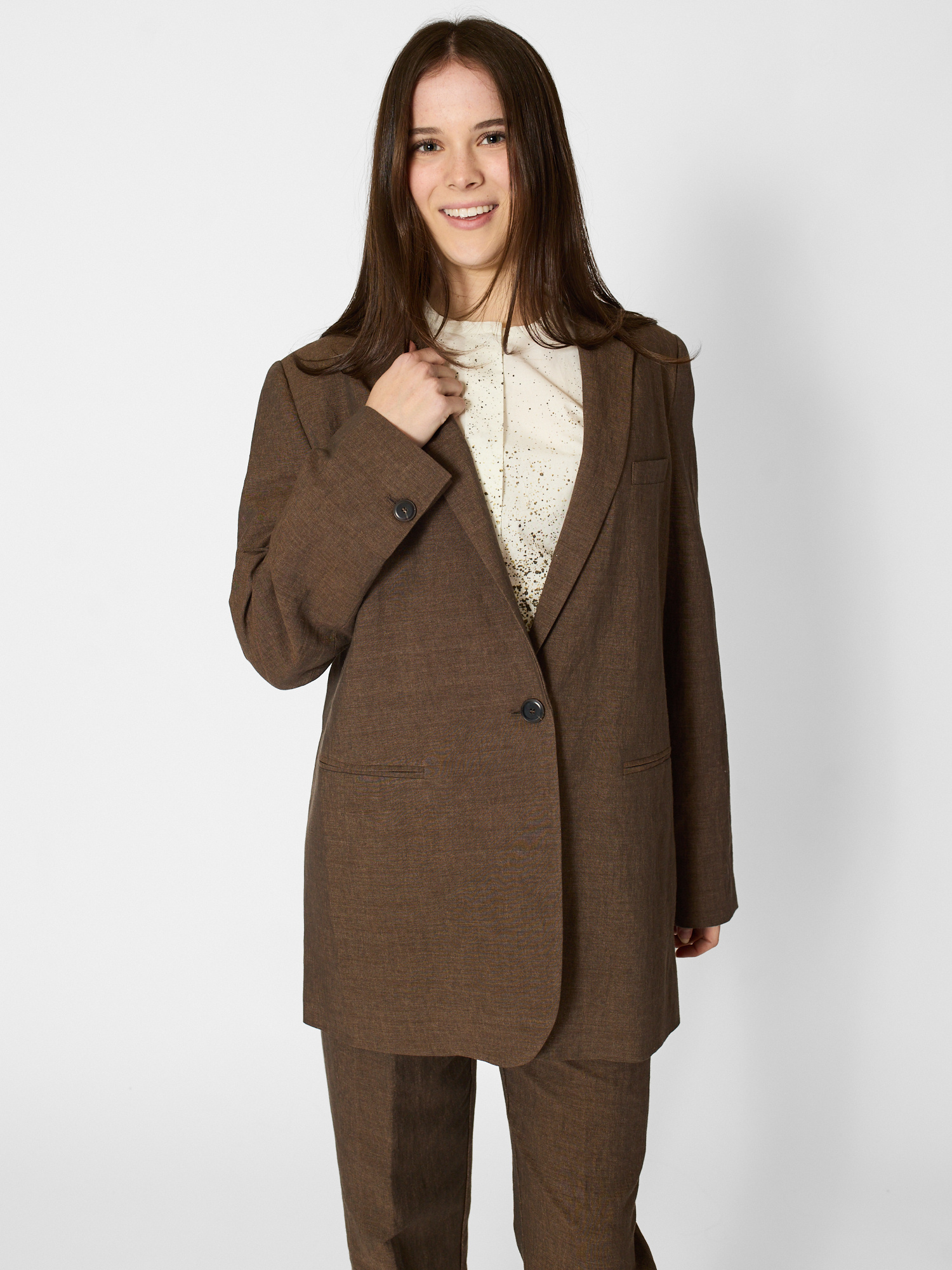 Single-breasted jacket with one button closure, collar with lapels, welt pocket on the chest, and front pockets.
