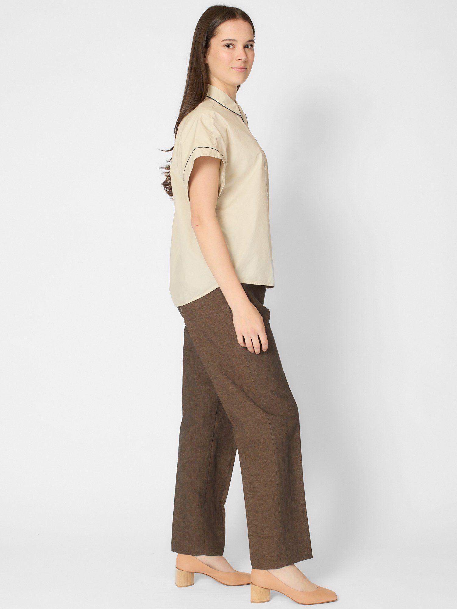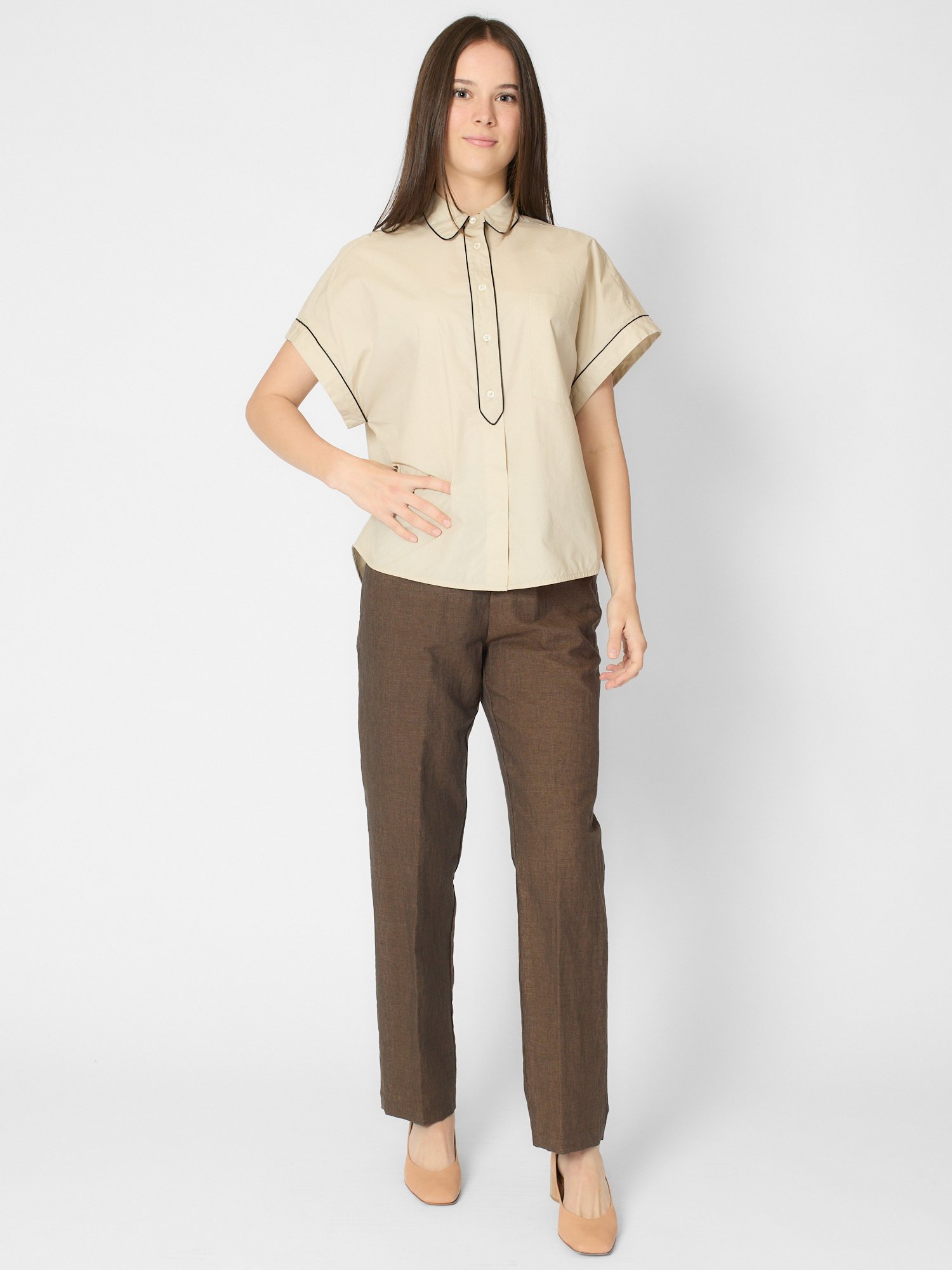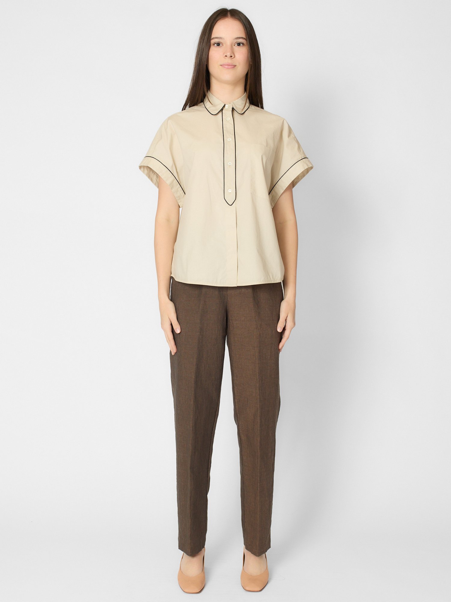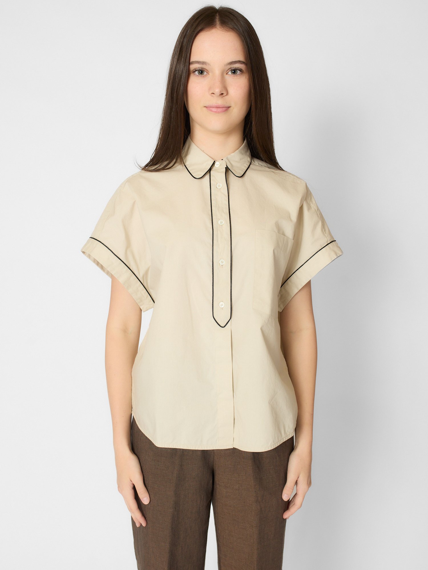 Poplin shirt features a hidden button placket with an elegant contrasting piping detail,