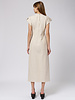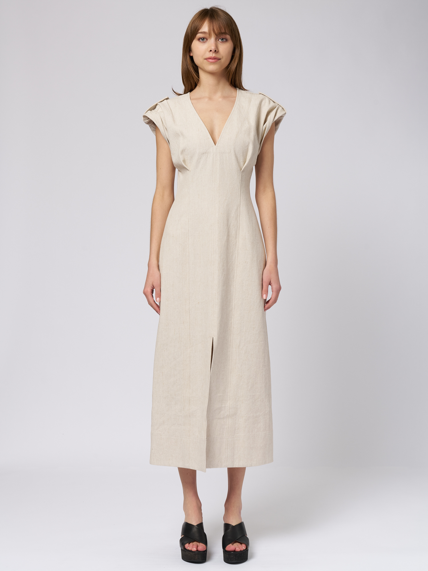 The V-neck dress features a structured silhouette, rolled cuff sleeves, and a front slit,