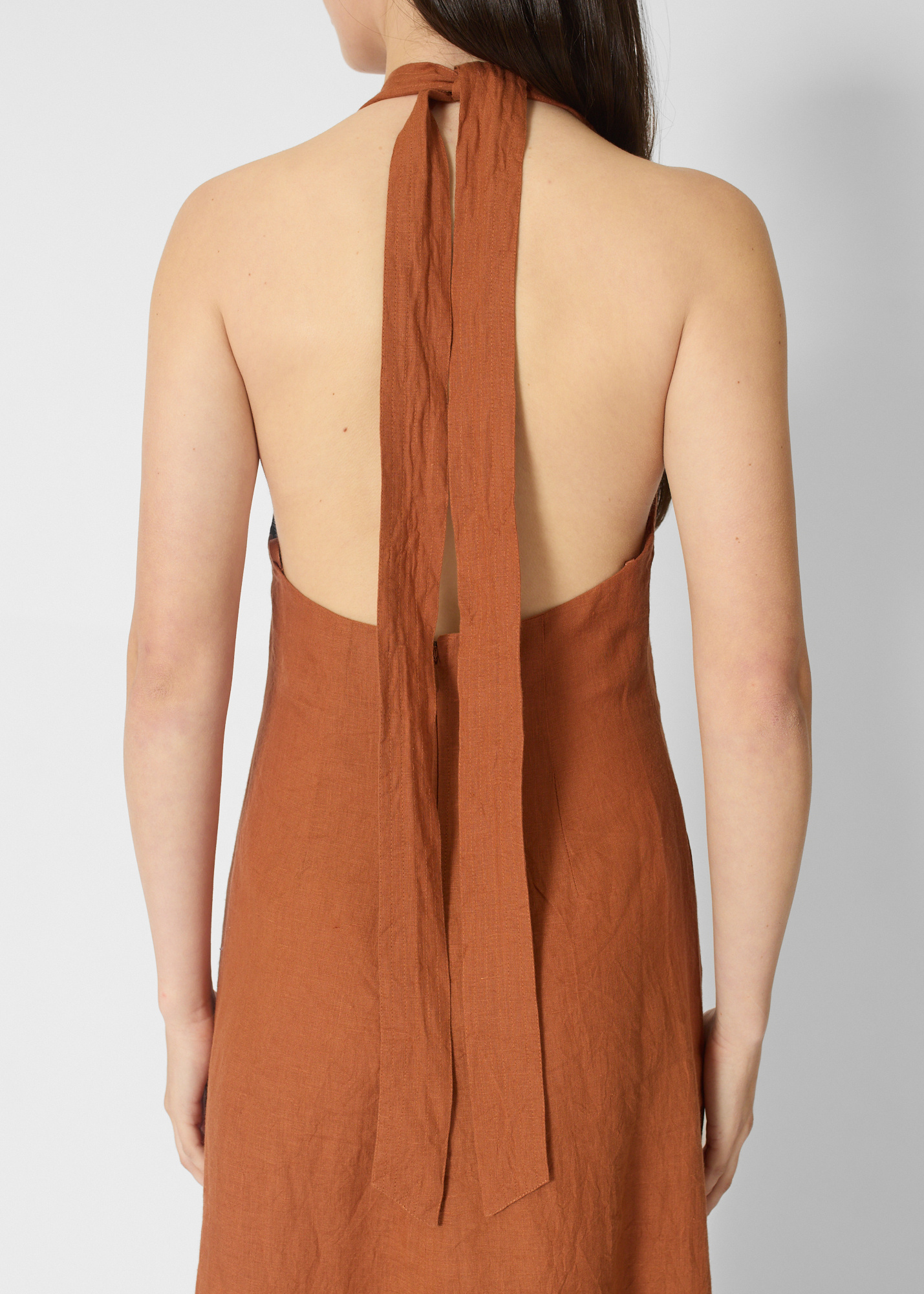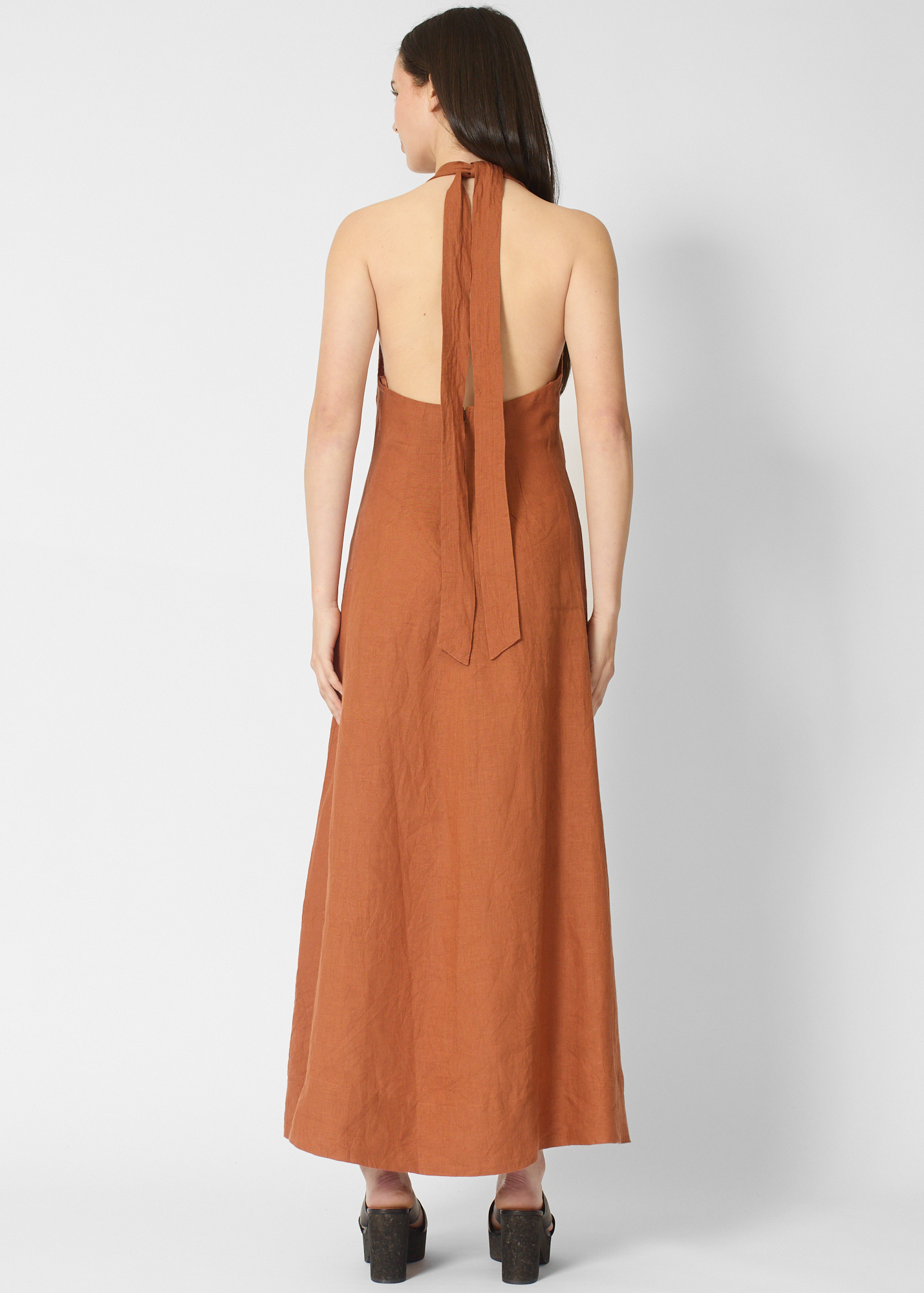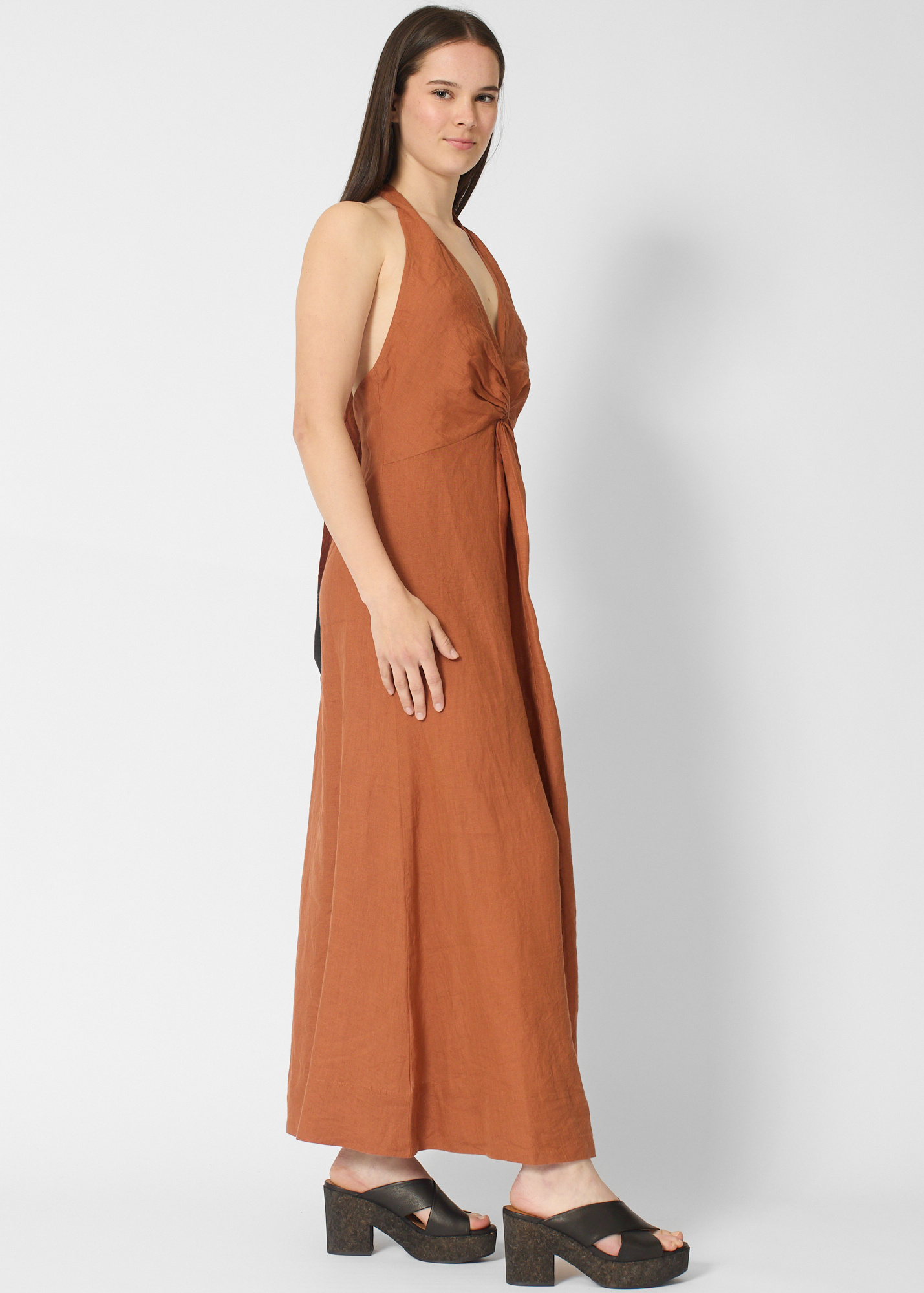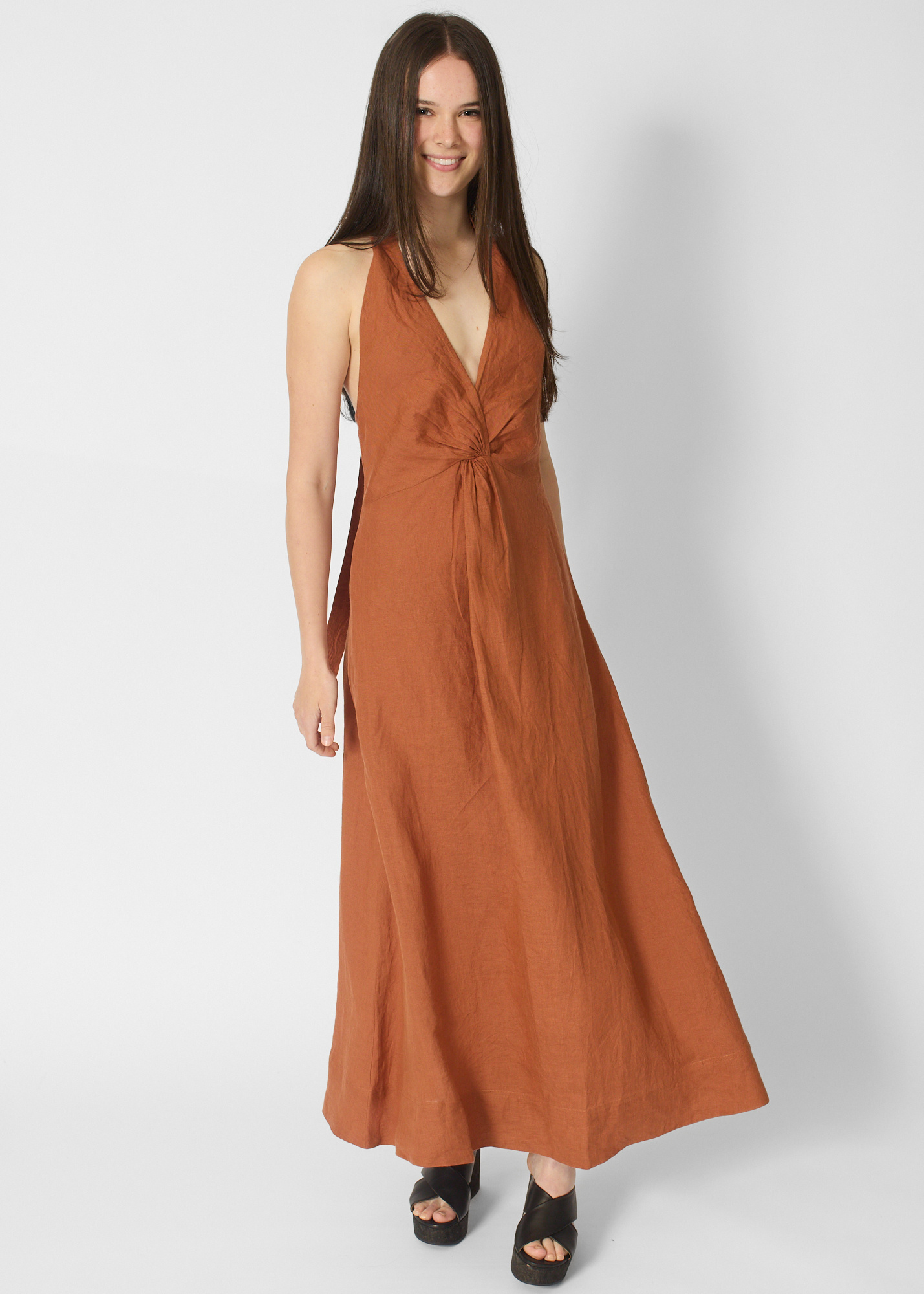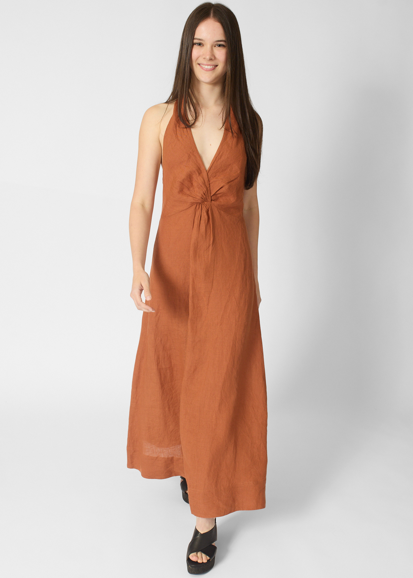 A-line silhouette has a V-neckline, maxi length, adjustable tie straps, twist front detail,