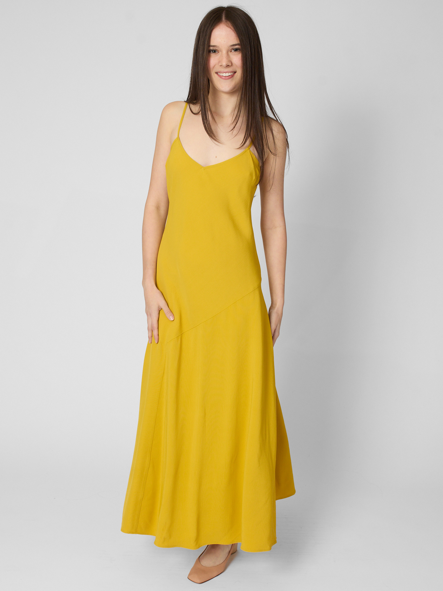Viscose slip dress features a V-neckline, adjustable straps, midi length, and asymmetrical hem