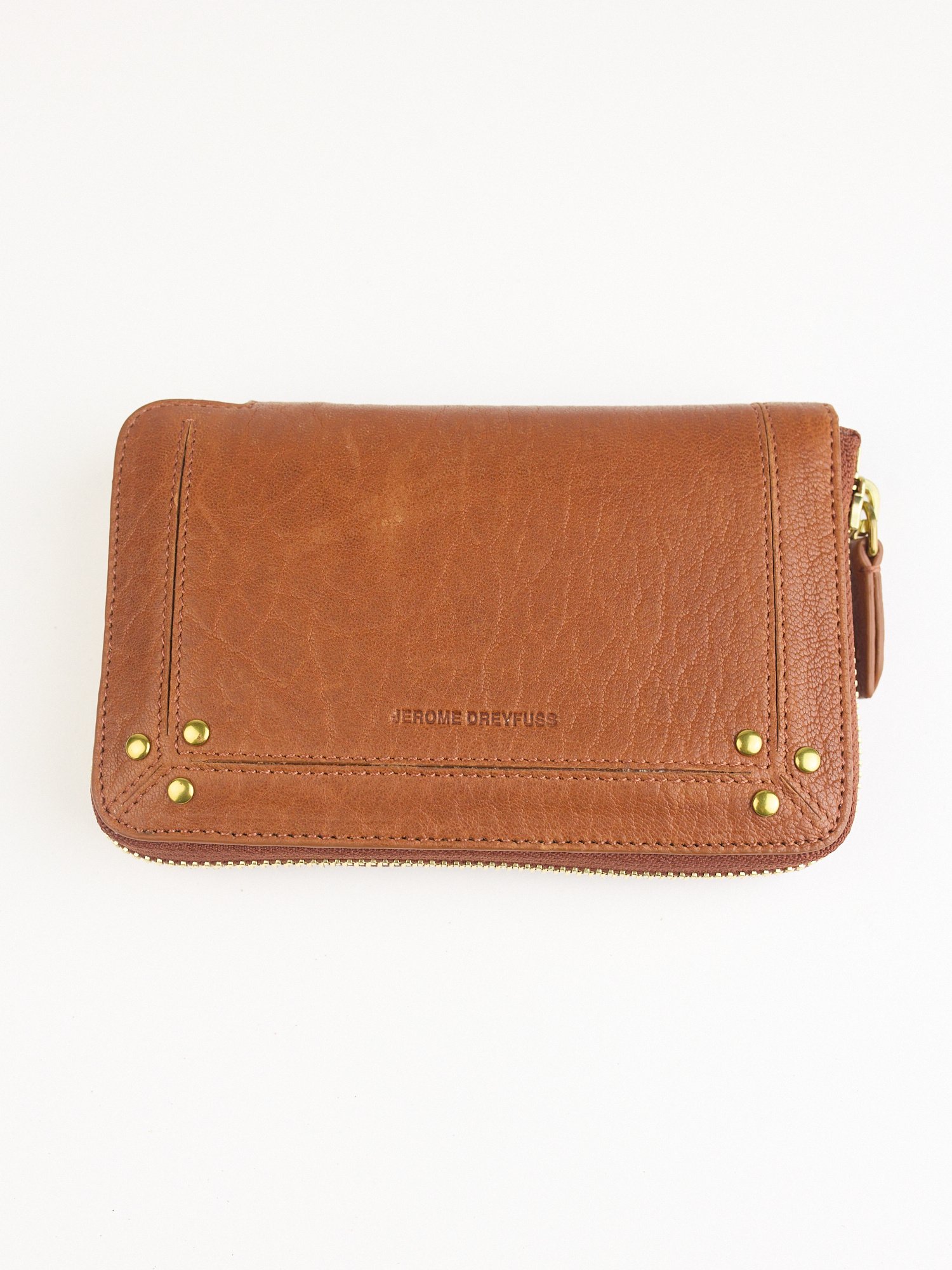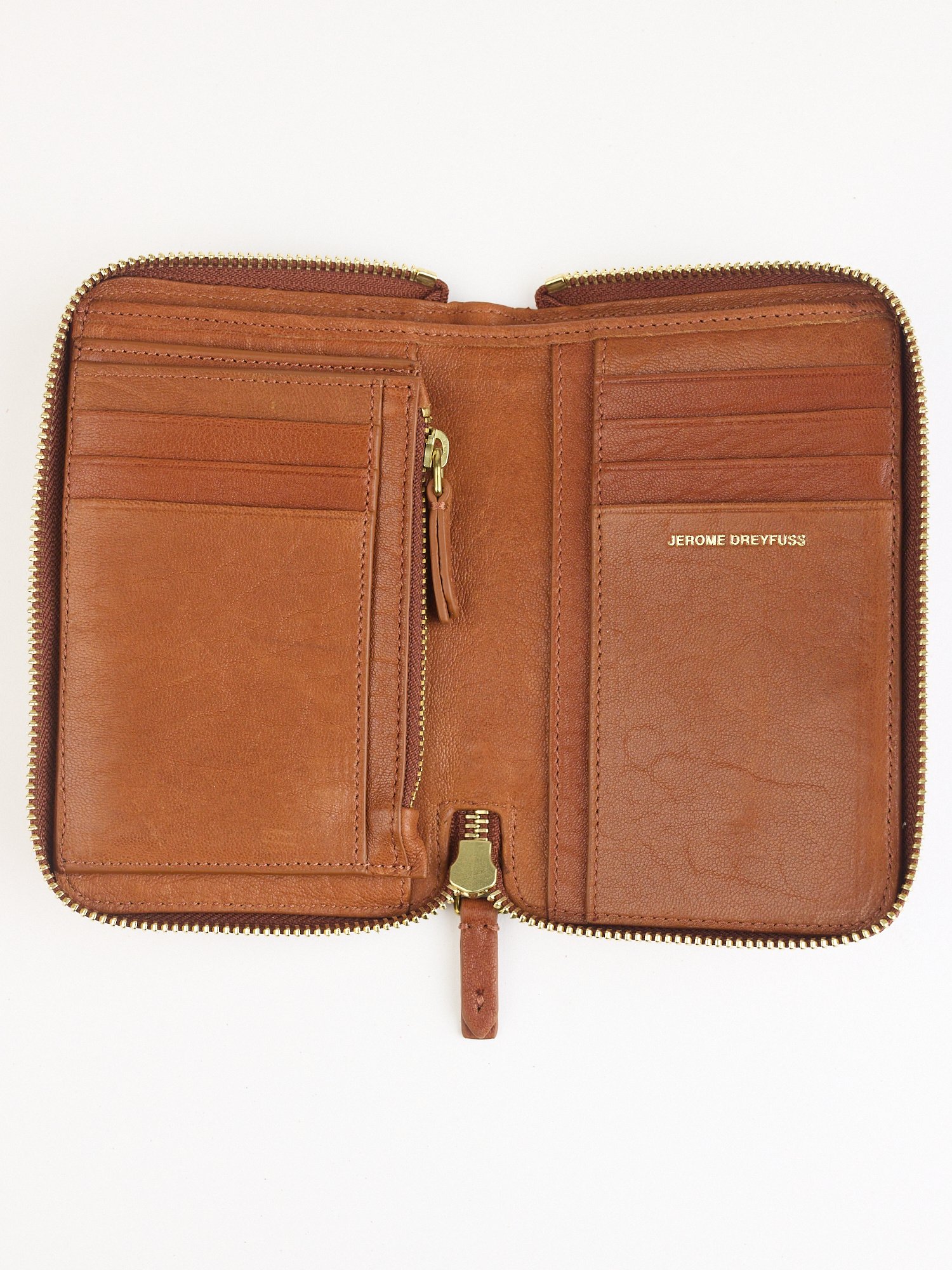 The leather zipper has a zipper closure. central zipper compartment for your change. and card slots.