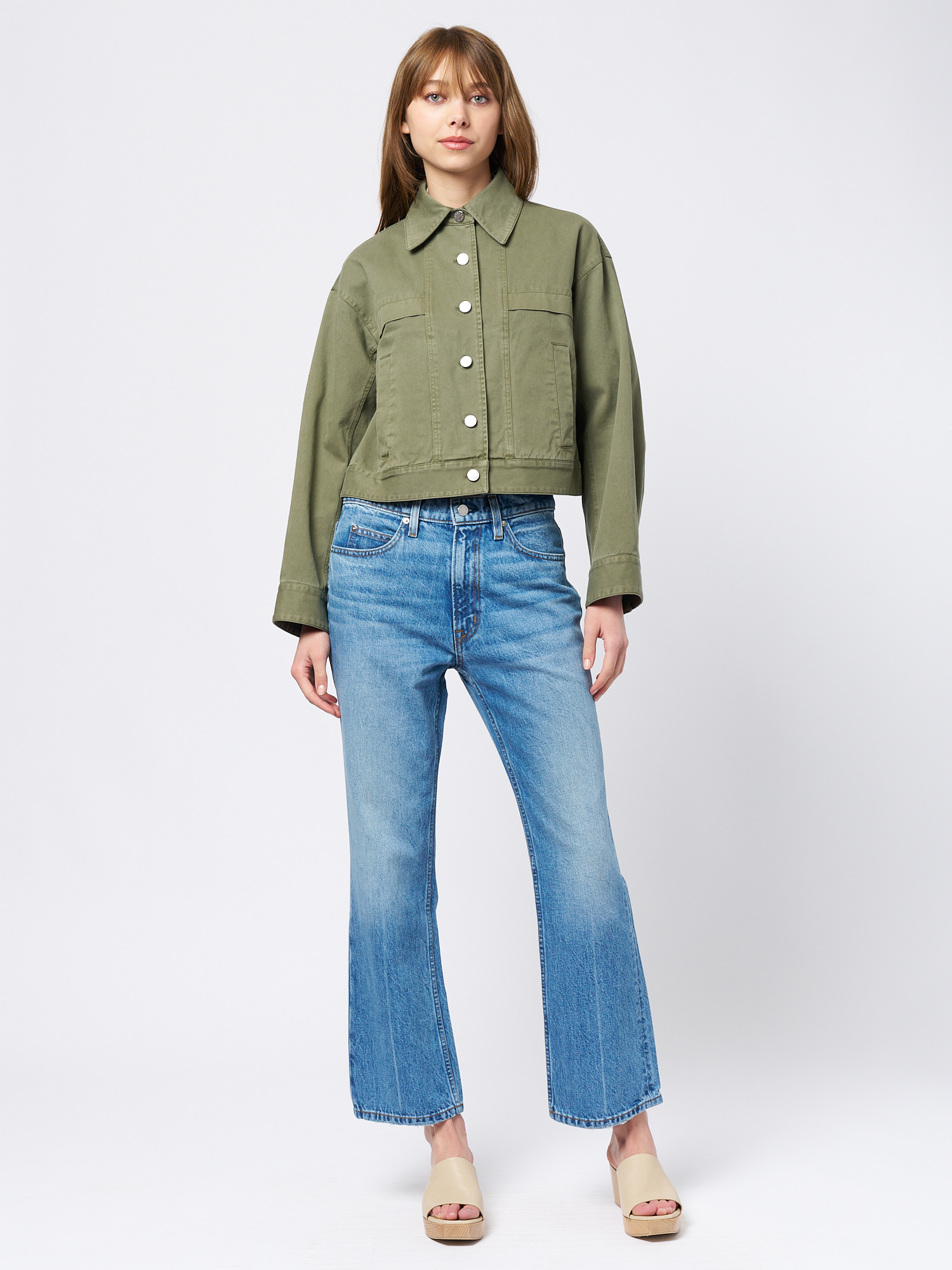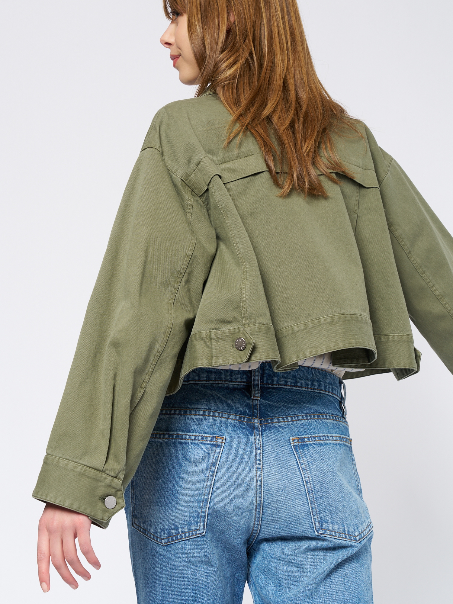 An easy-fit jacket has drop shoulders, side pockets, and front button closures.