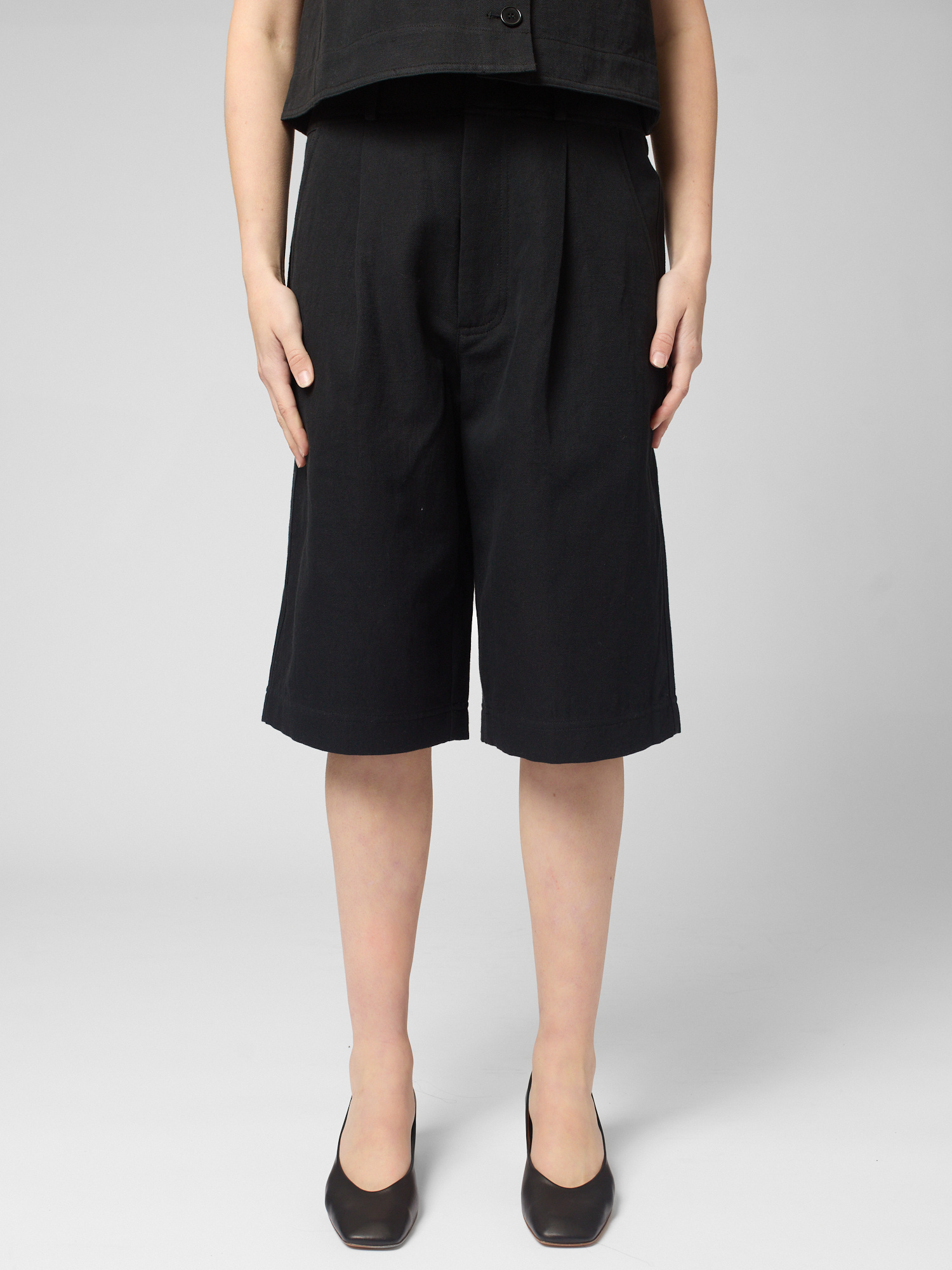 Cotton and linen shorts designed with mid-rise, barrel-shaped legs, front pleats, slant pockets, and back welt pockets