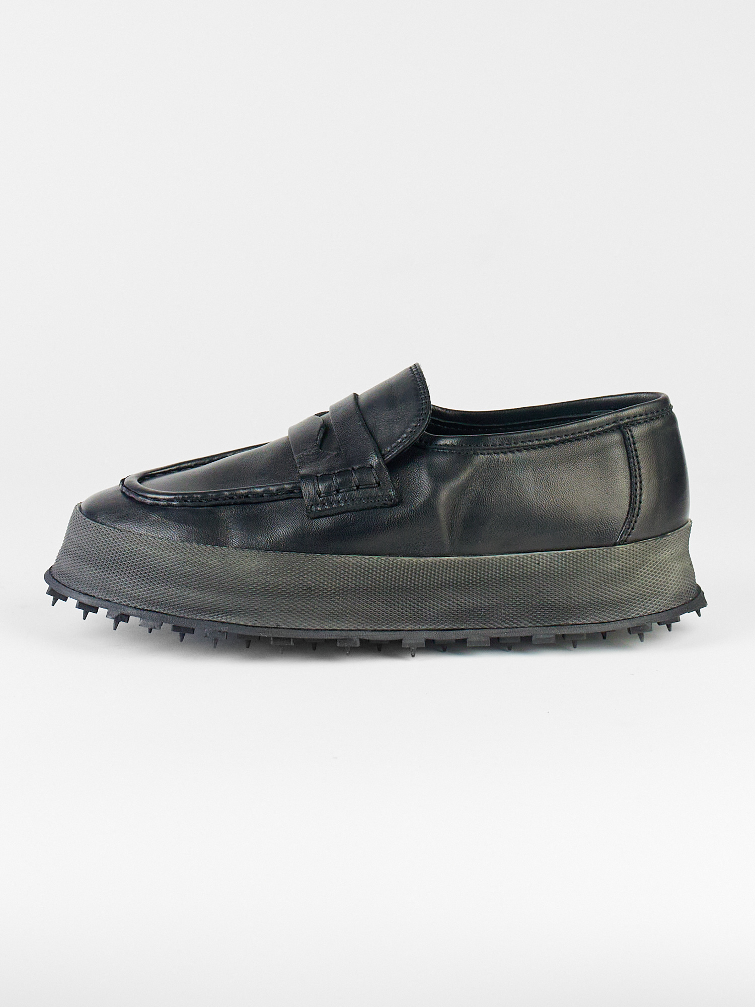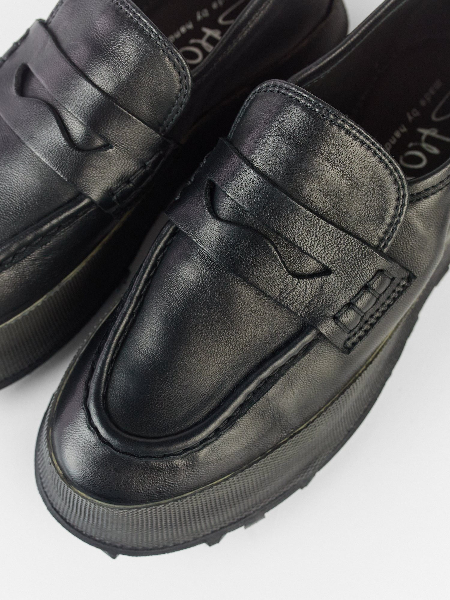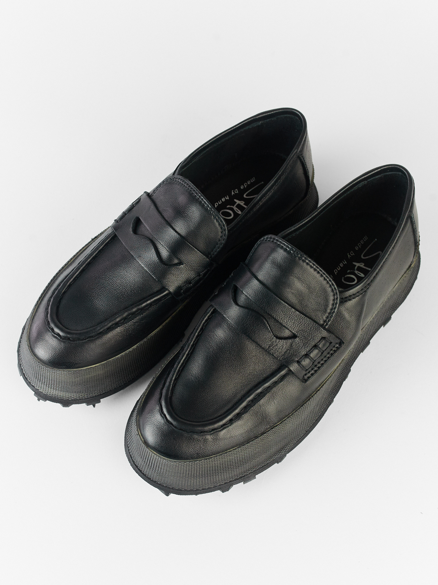 Hand-crafted leather loafer with black rubber sole, leather lining, and insole
