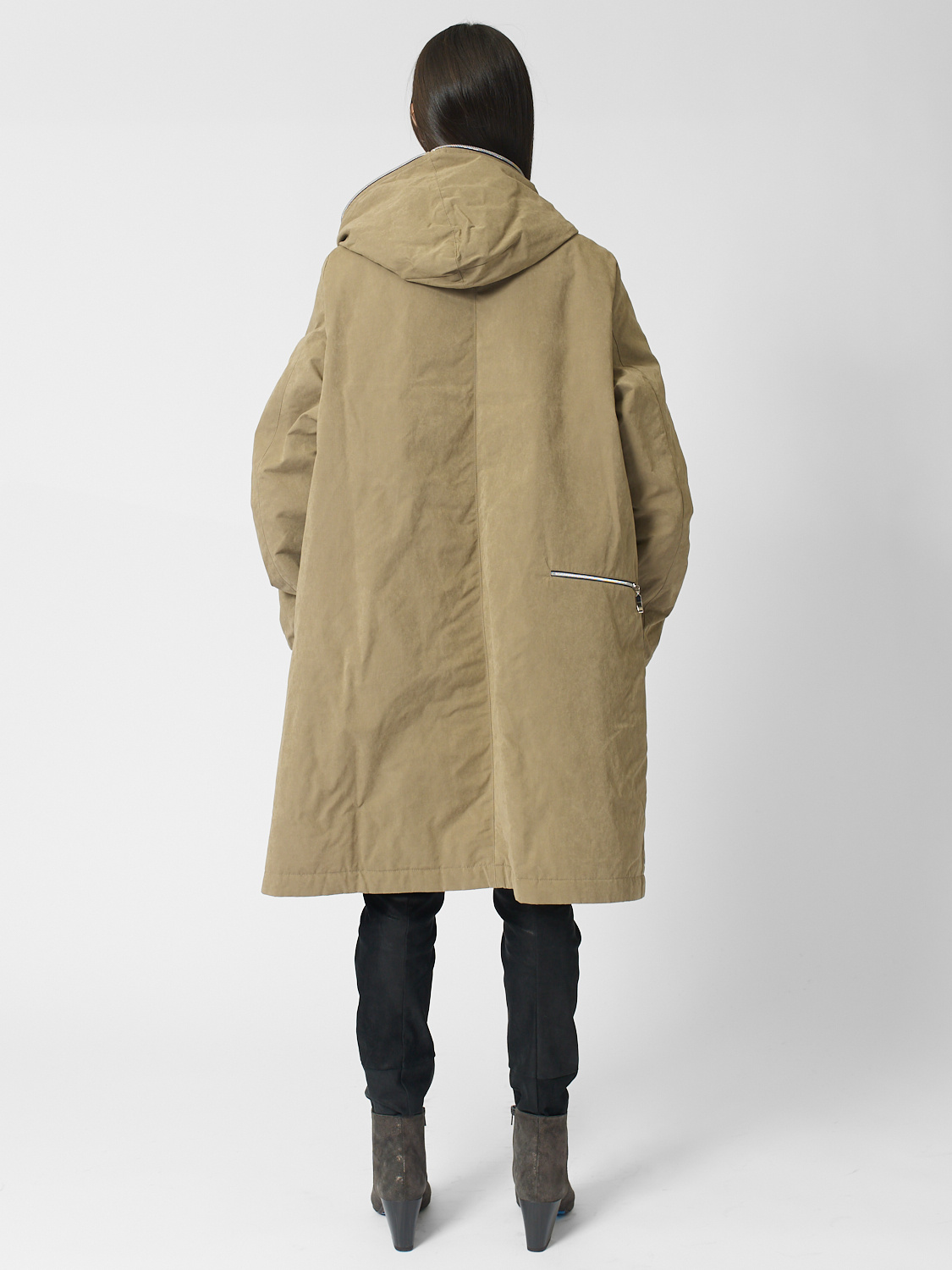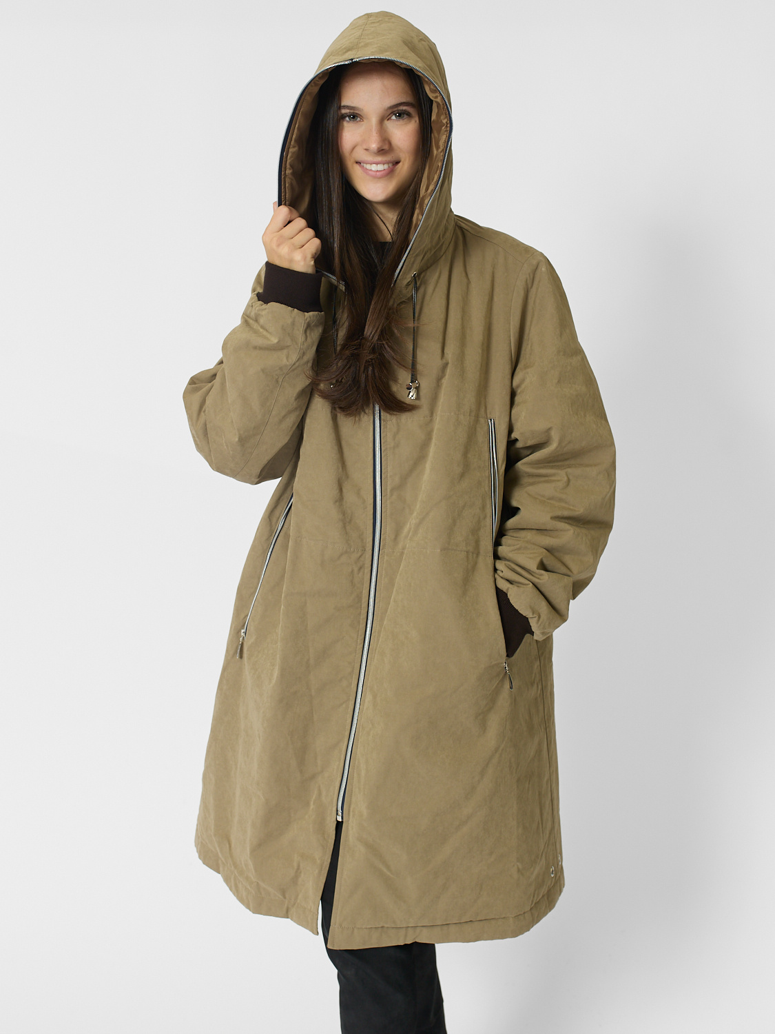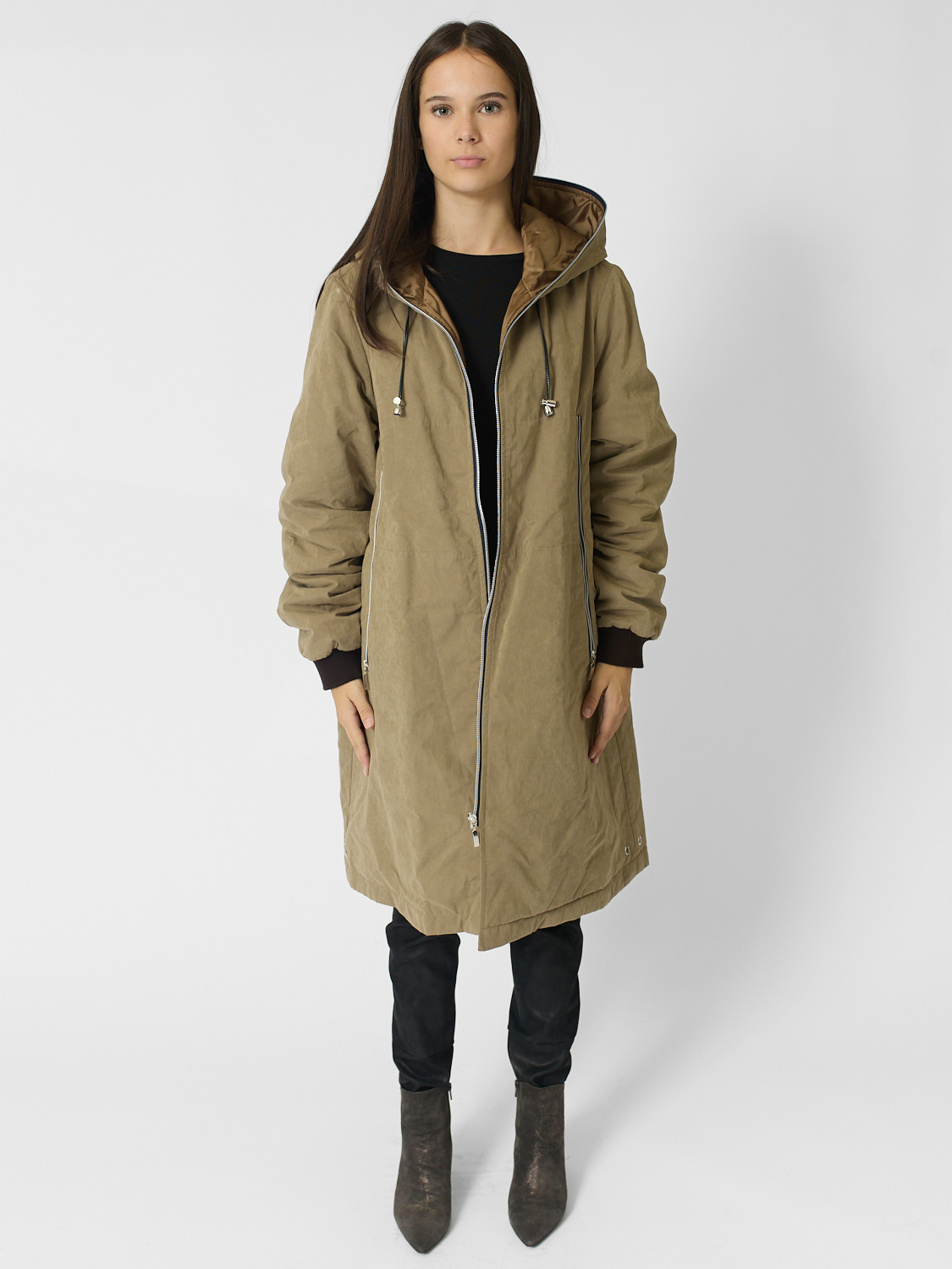 Unisex parka with a zipper front, padded lining, hood, front pockets, and a zippered back pocket.