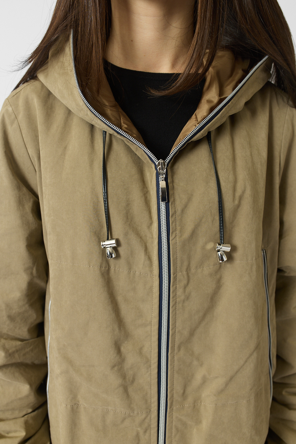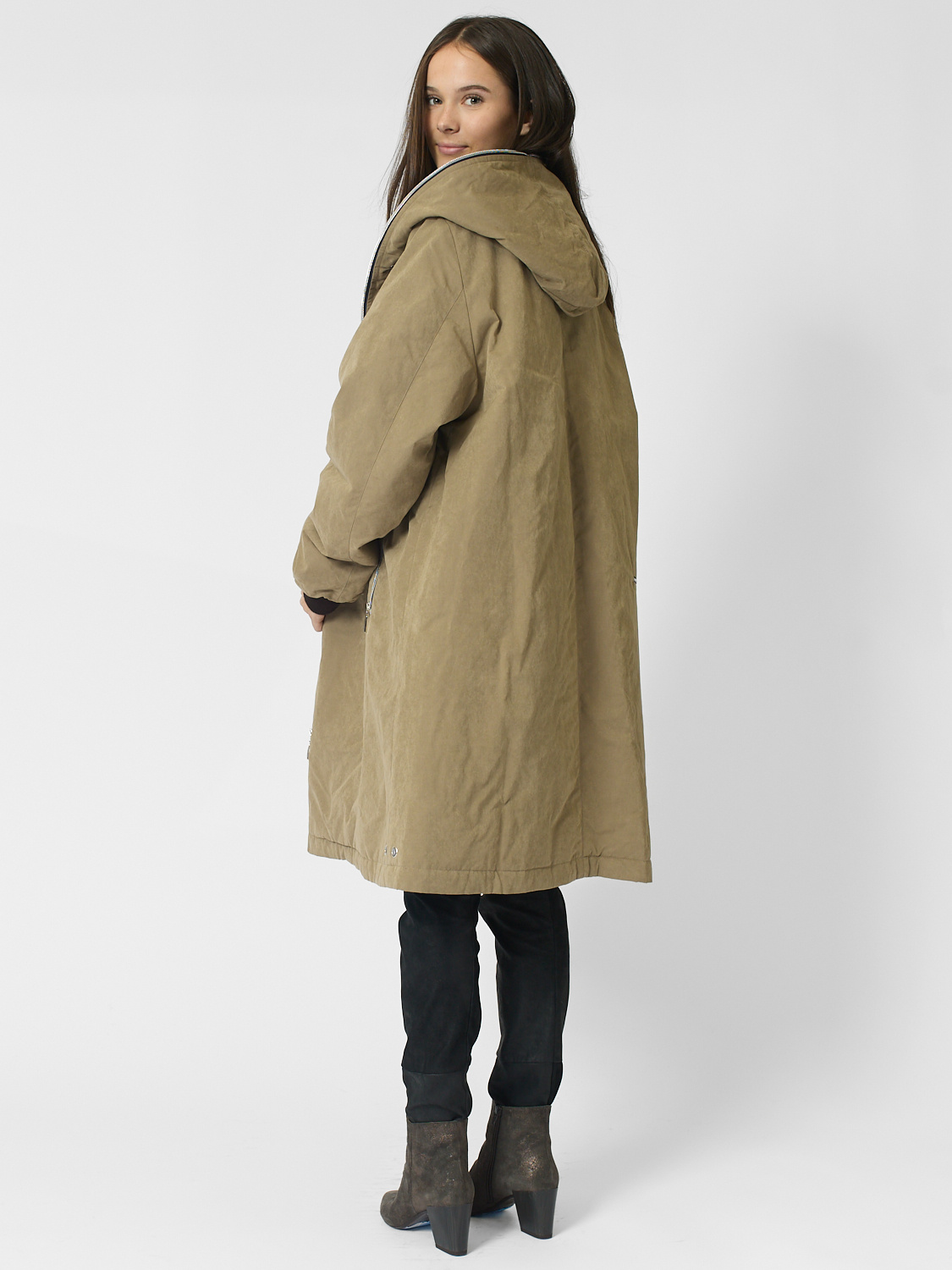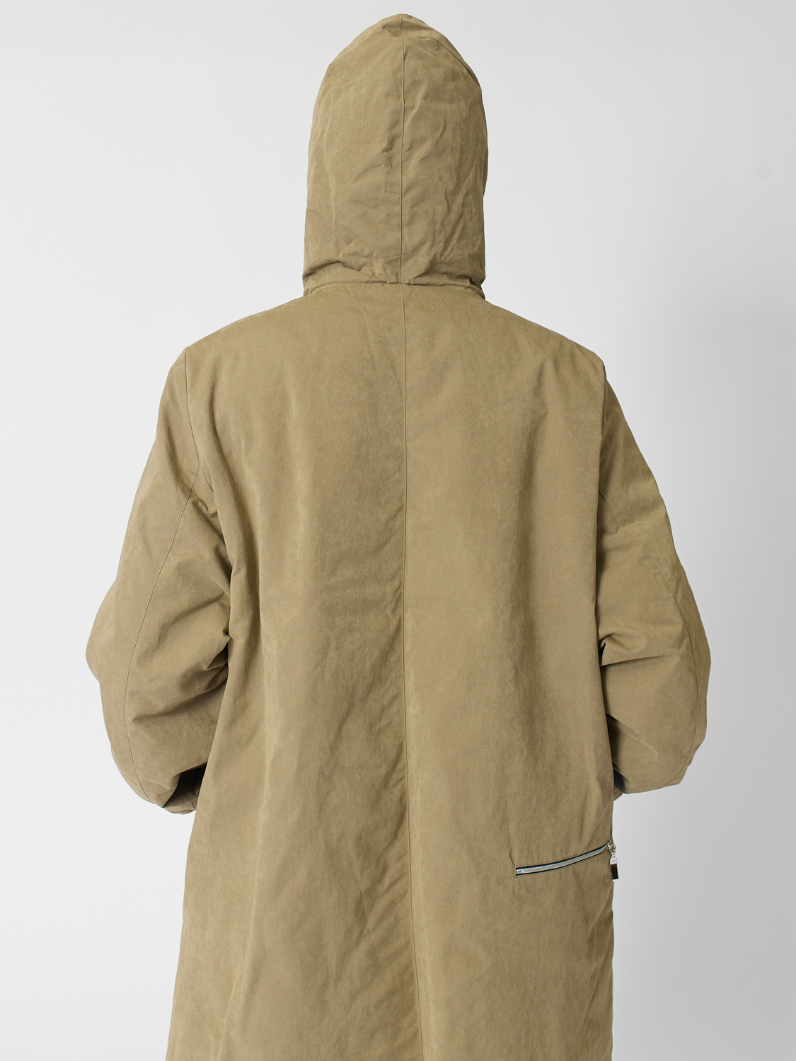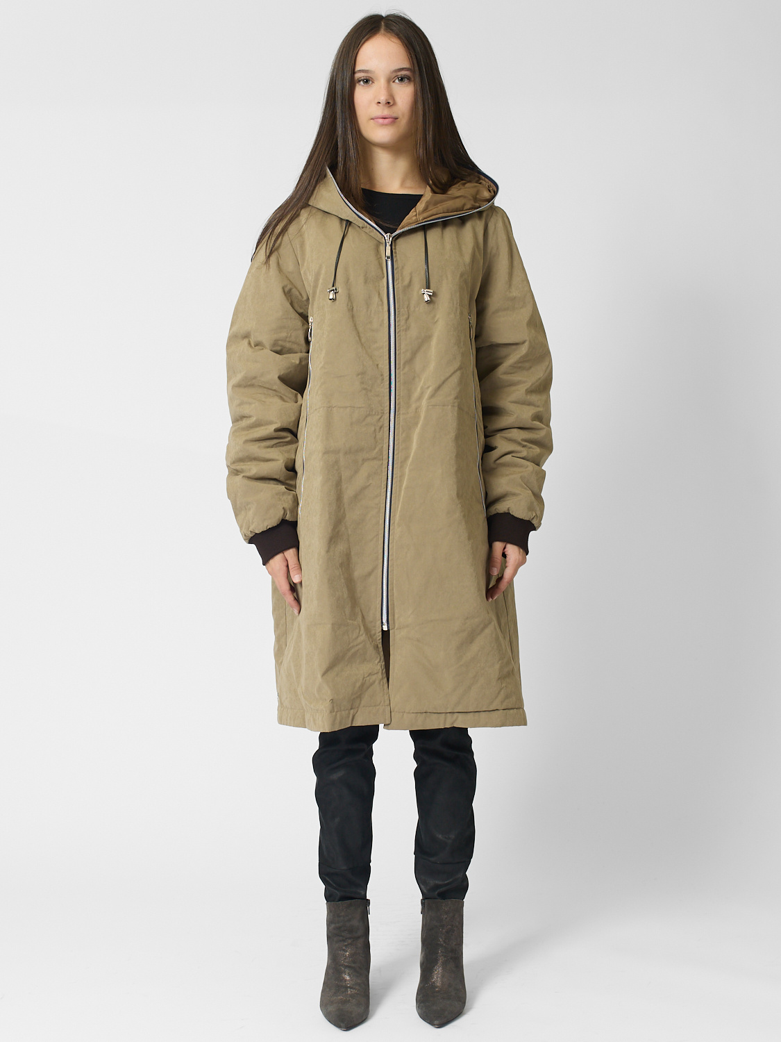 Unisex parka with a zipper front, padded lining, hood, front pockets, and a zippered back pocket.