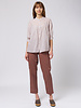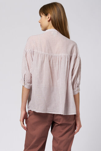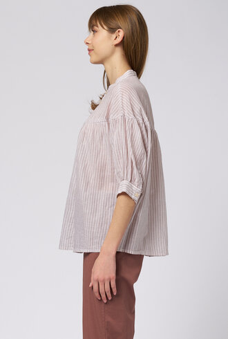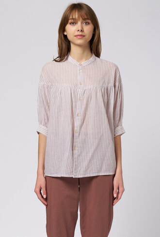 A very light khadi cotton stripe shirt features three-quarter length and slightly puffed sleeves.