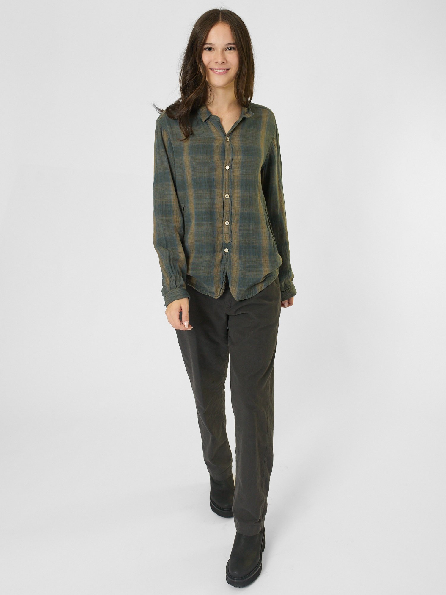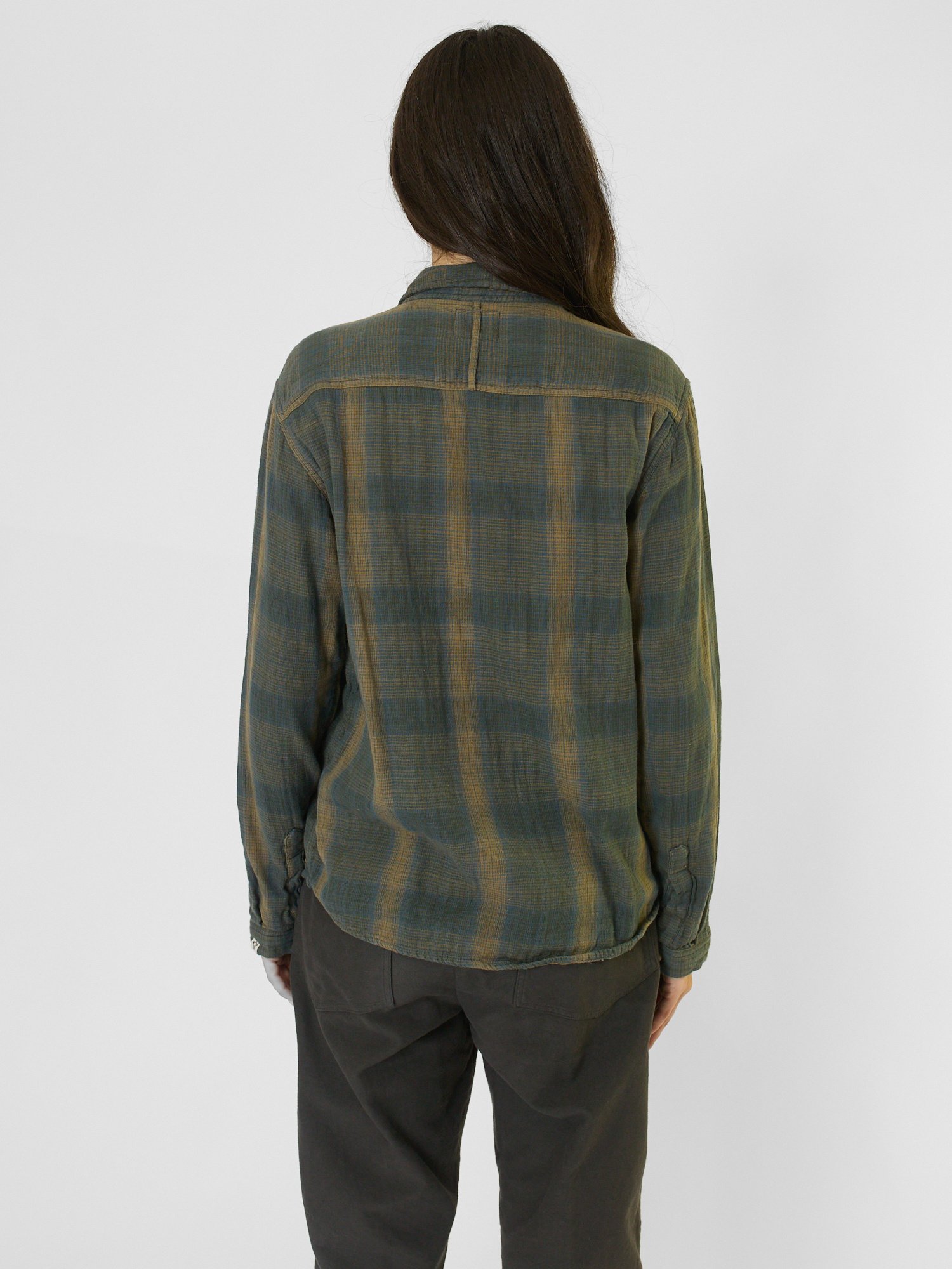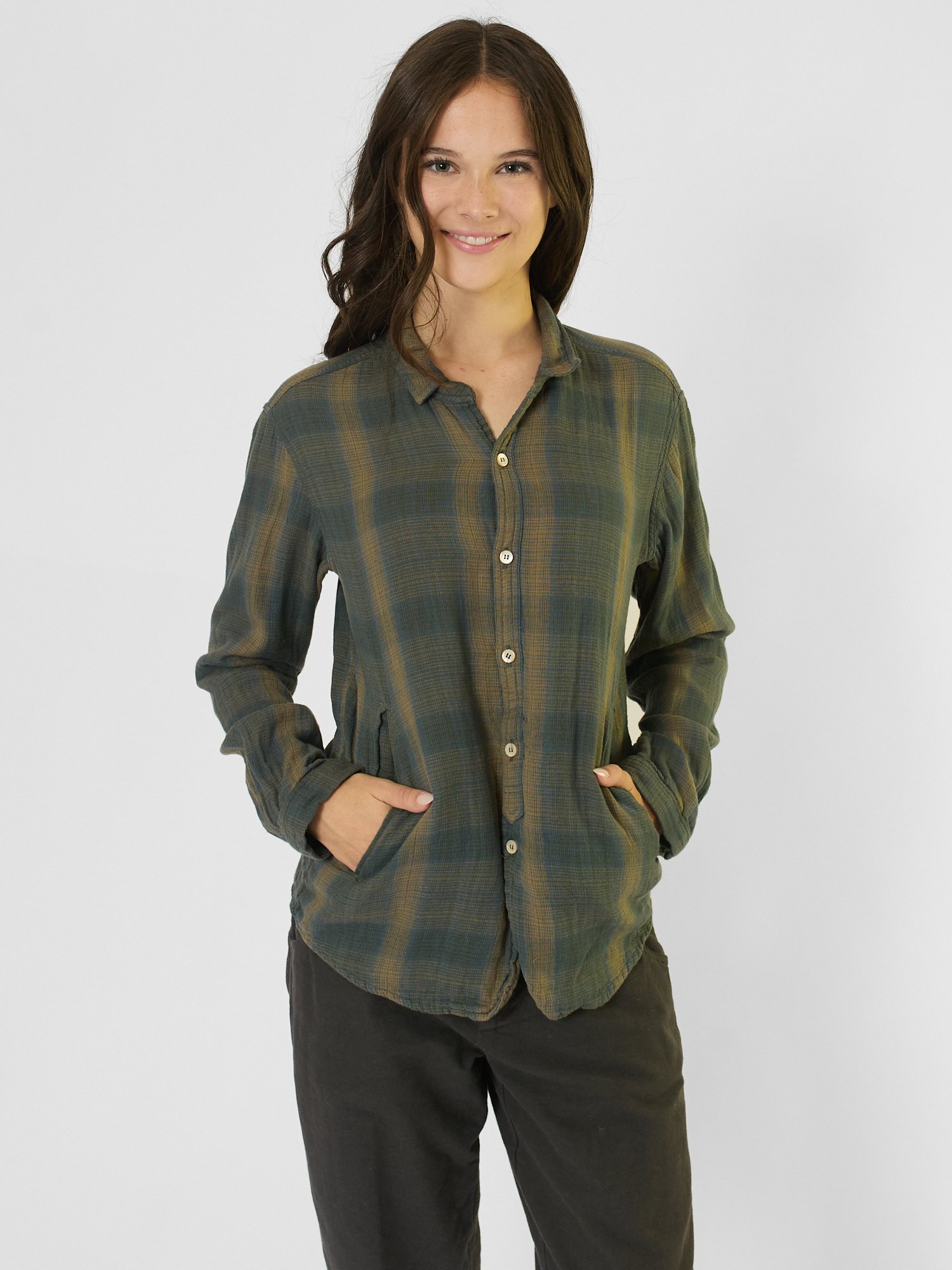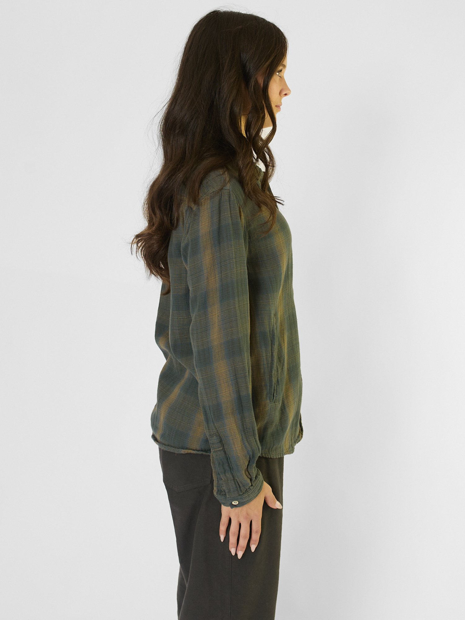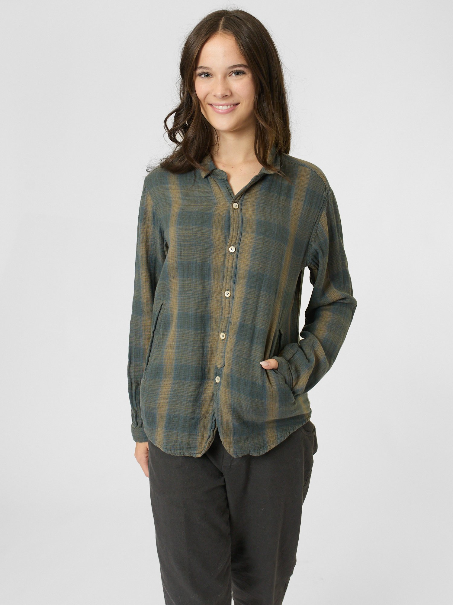 A lightweight double khadi cotton shirt with a rounded hem, side pockets, and a button front closure.