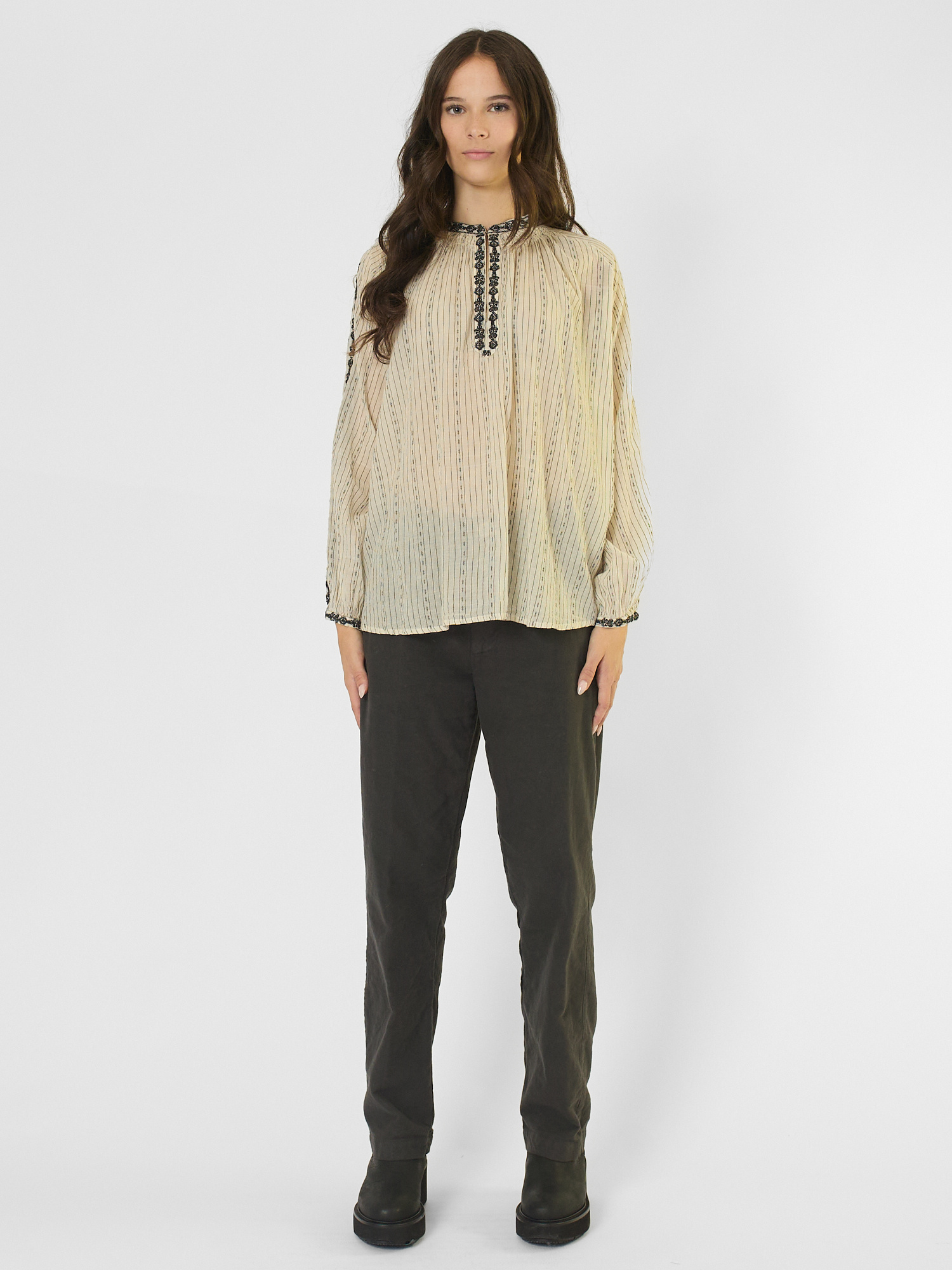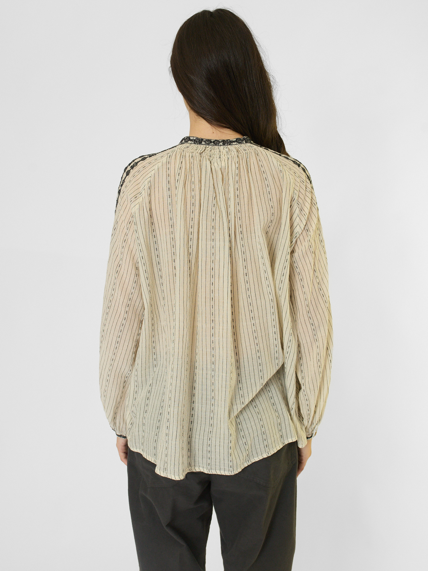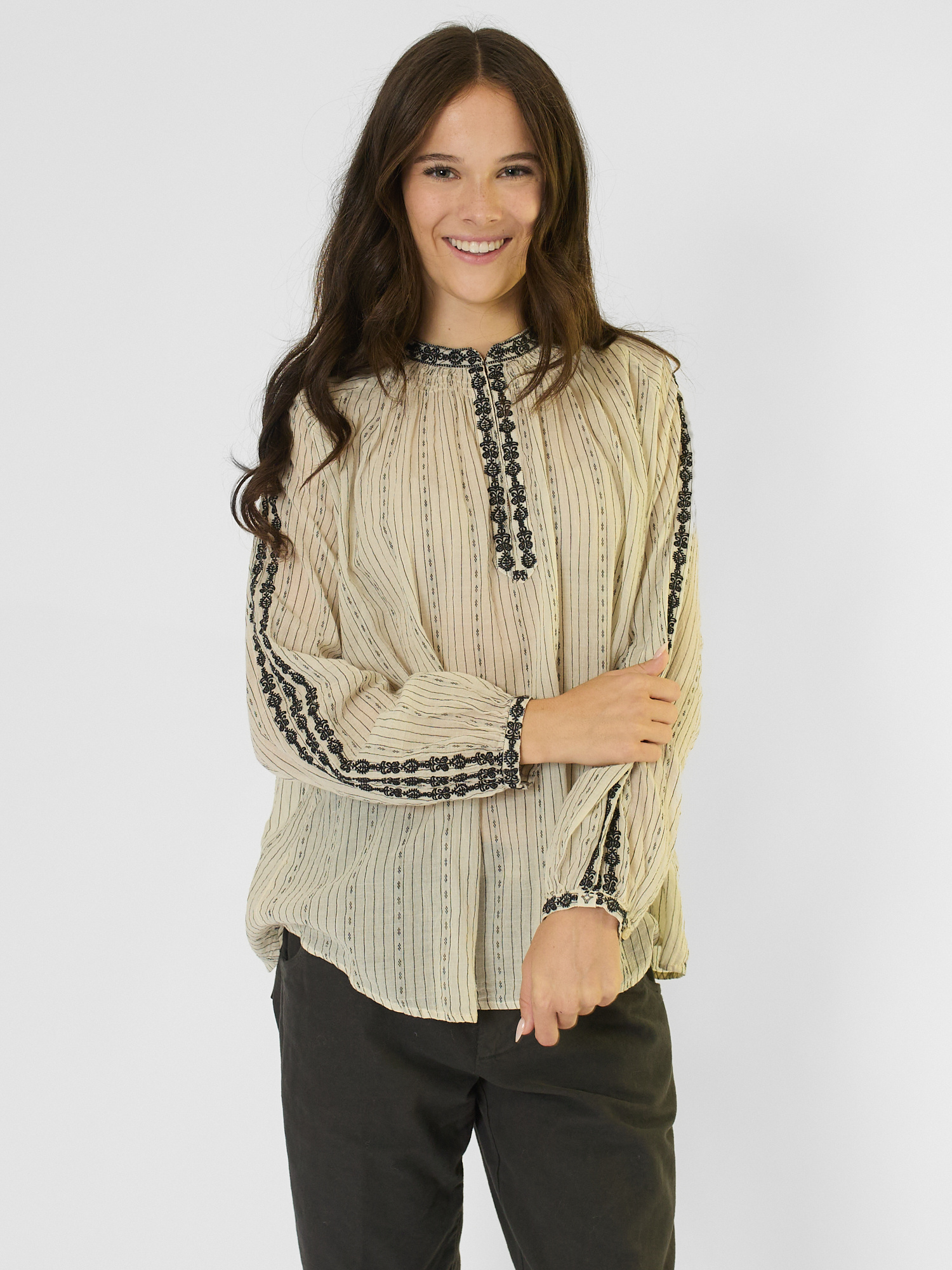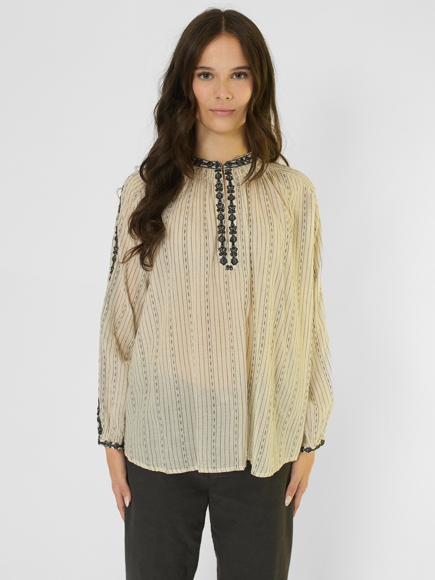 A long-sleeved, khadi cotton blouse with an embroidered neckline, cuffs, and sleeves.