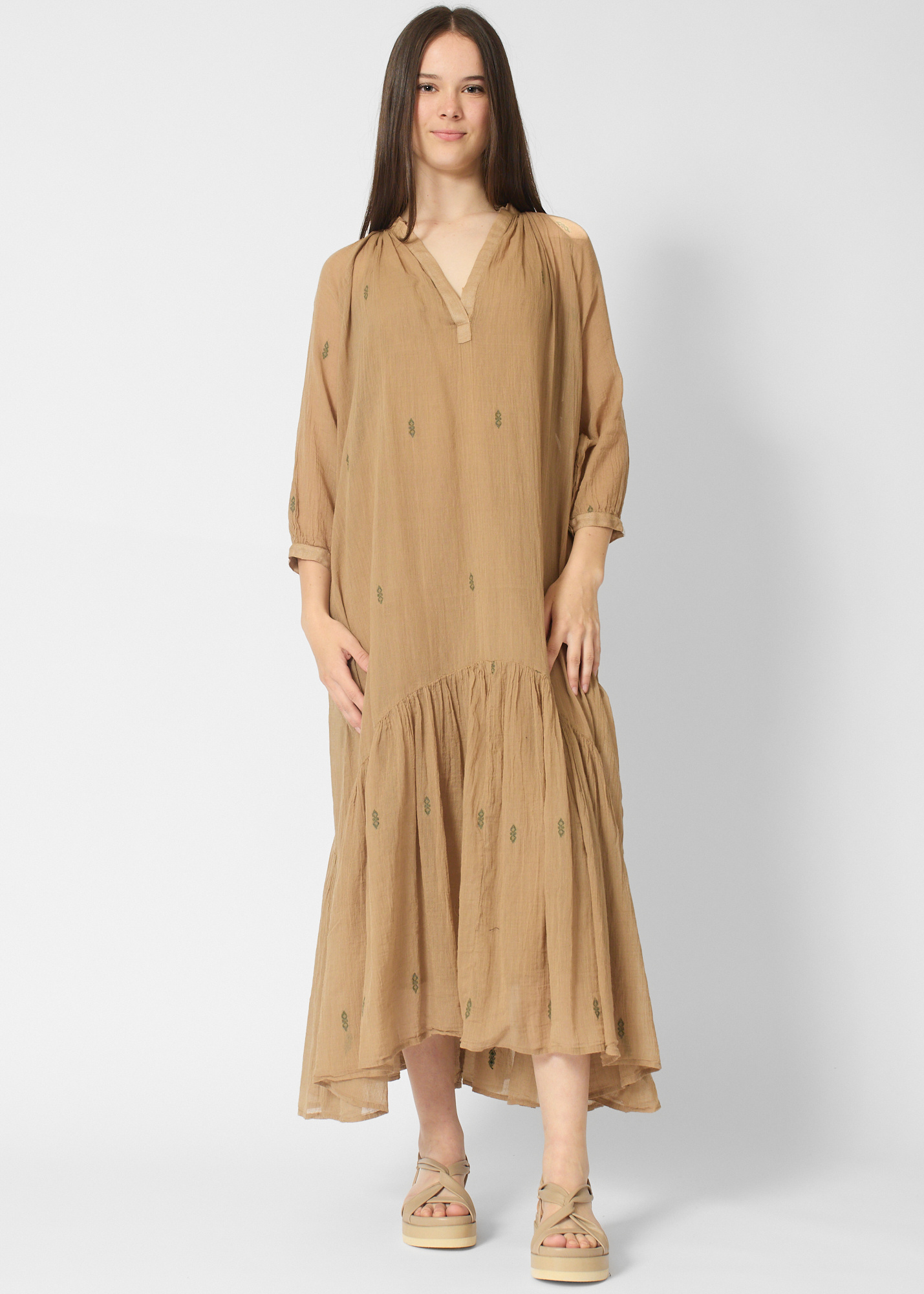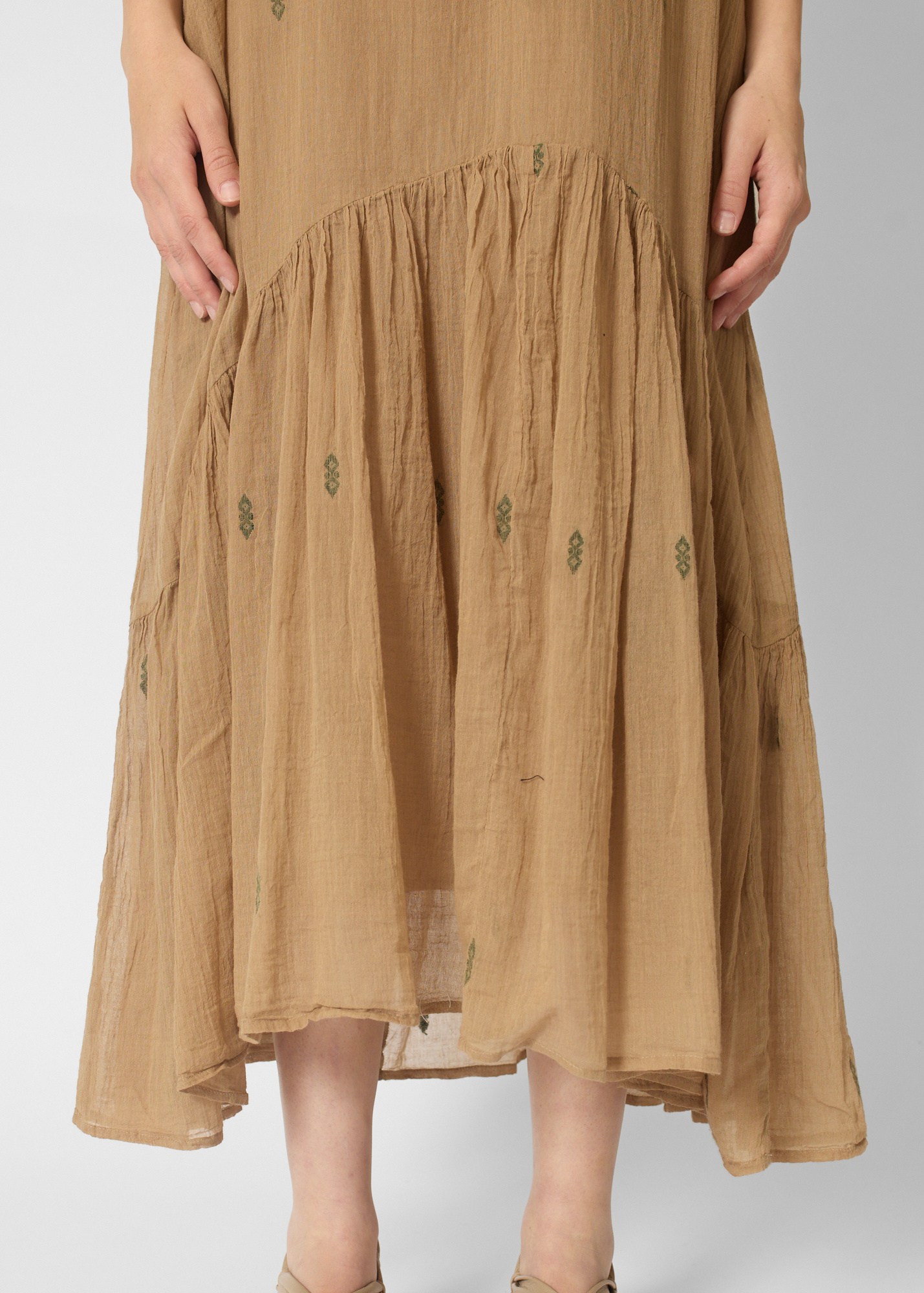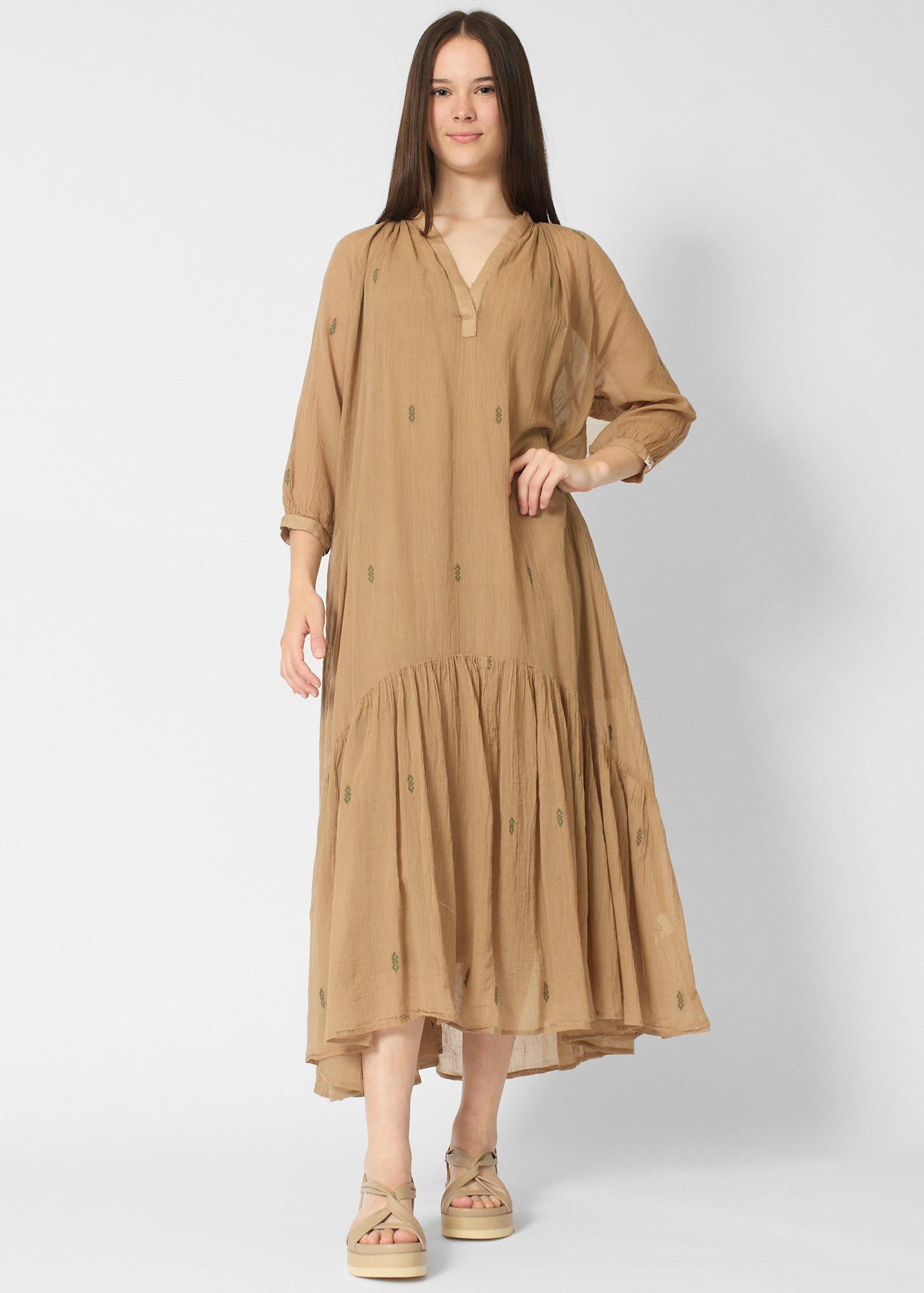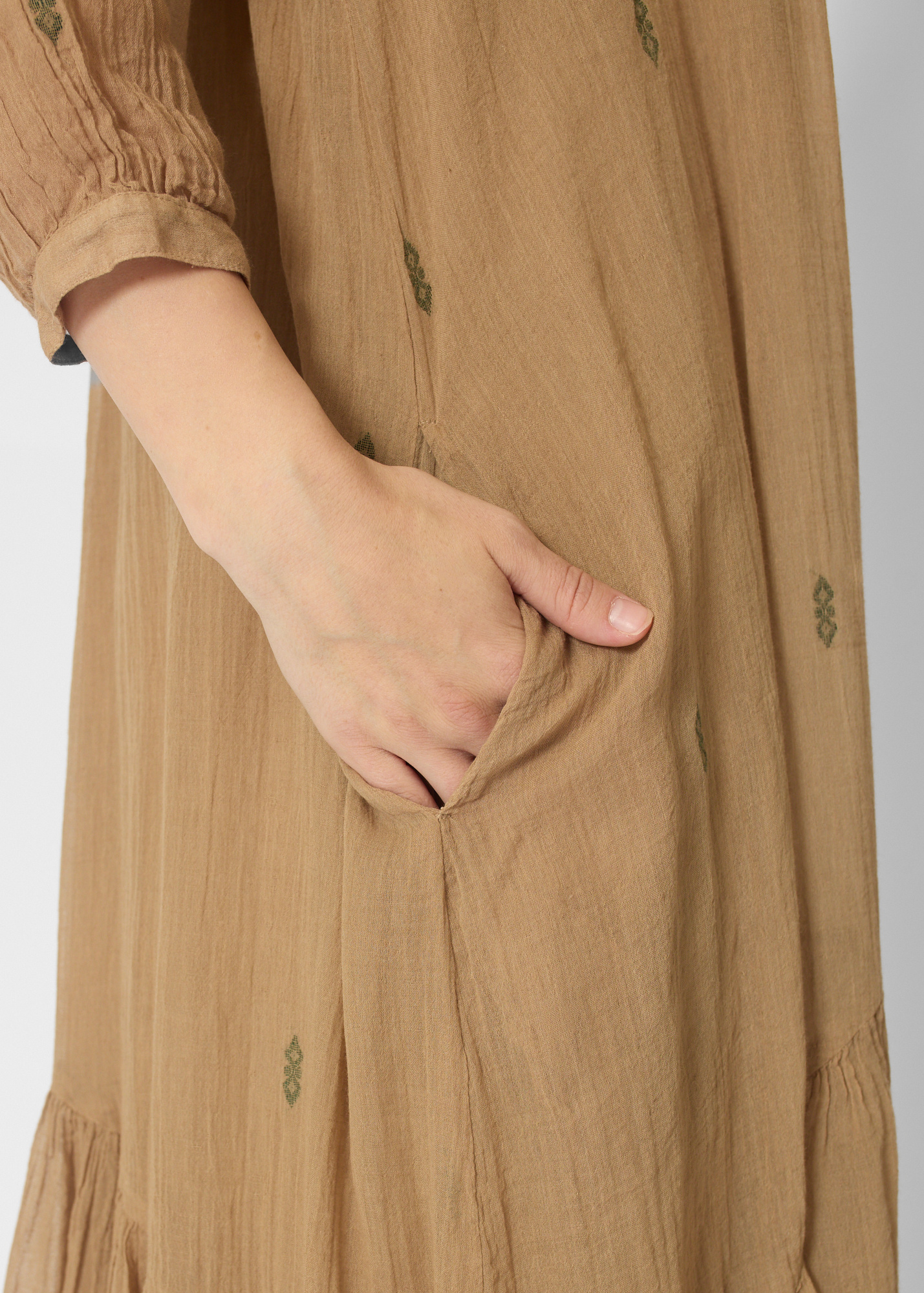 A very light Khadi cotton embroidered dress has a V-neck, three-quarter length sleeves, and side pockets.