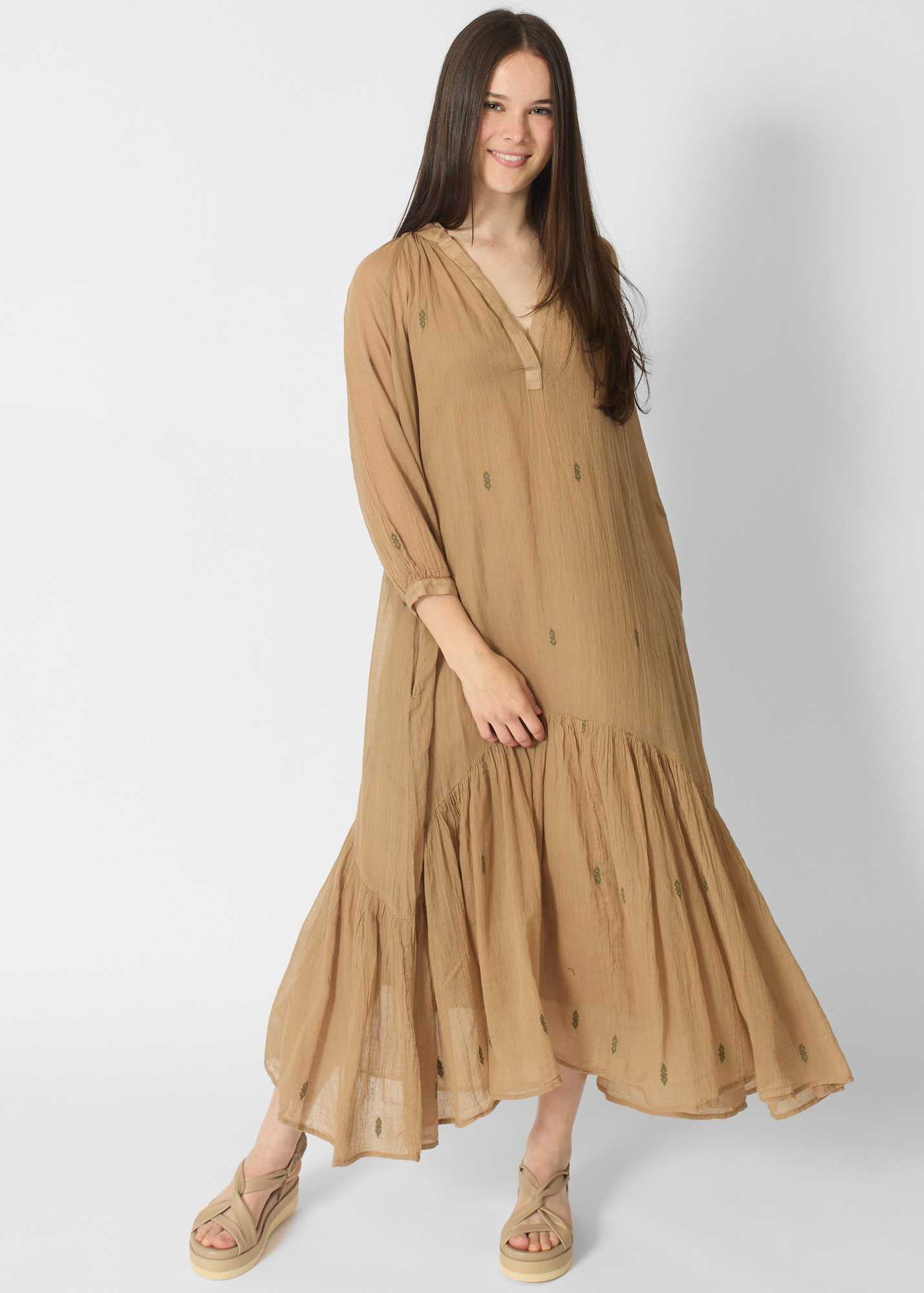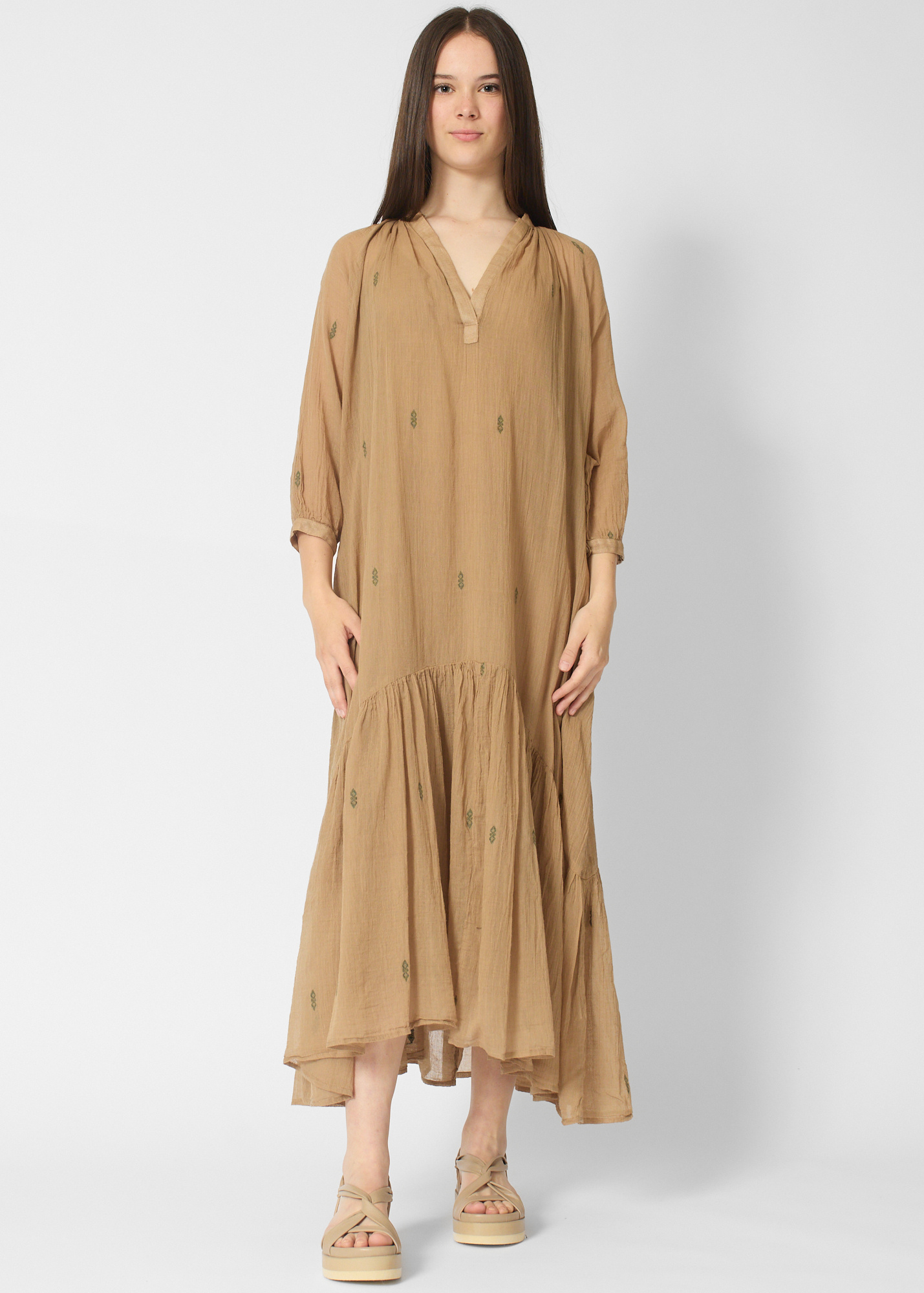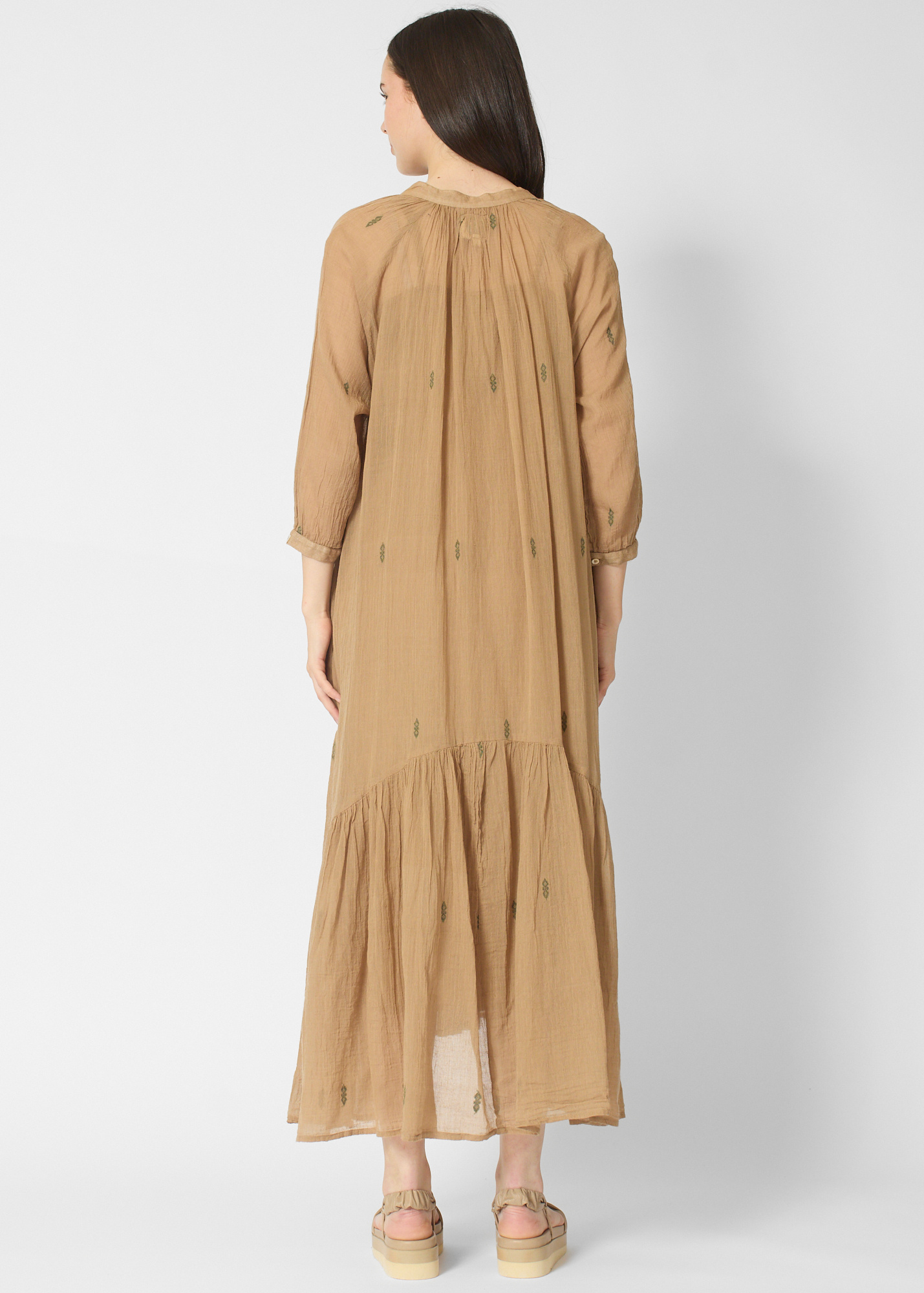 A very light Khadi cotton embroidered dress has a V-neck, three-quarter length sleeves, and side pockets.