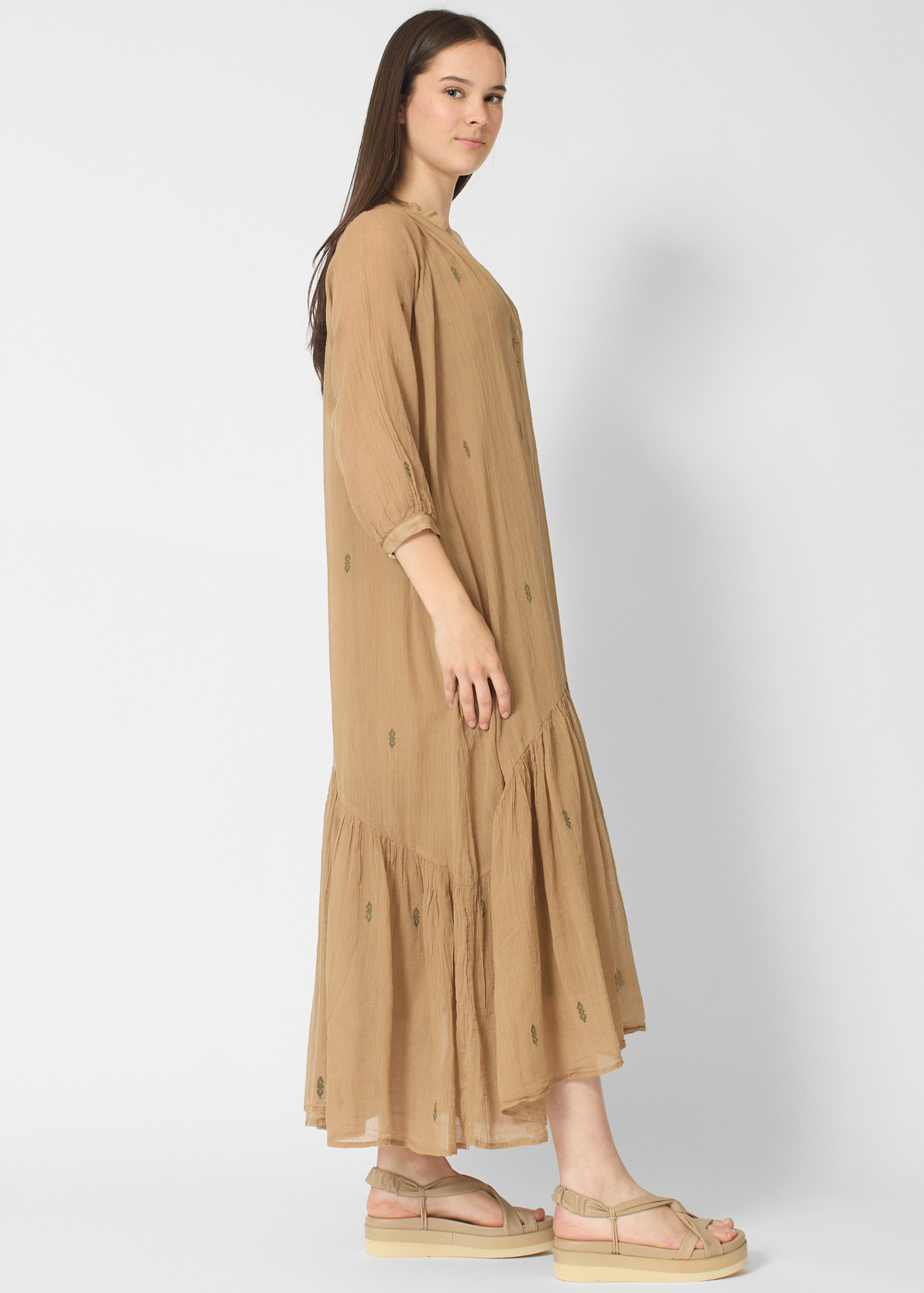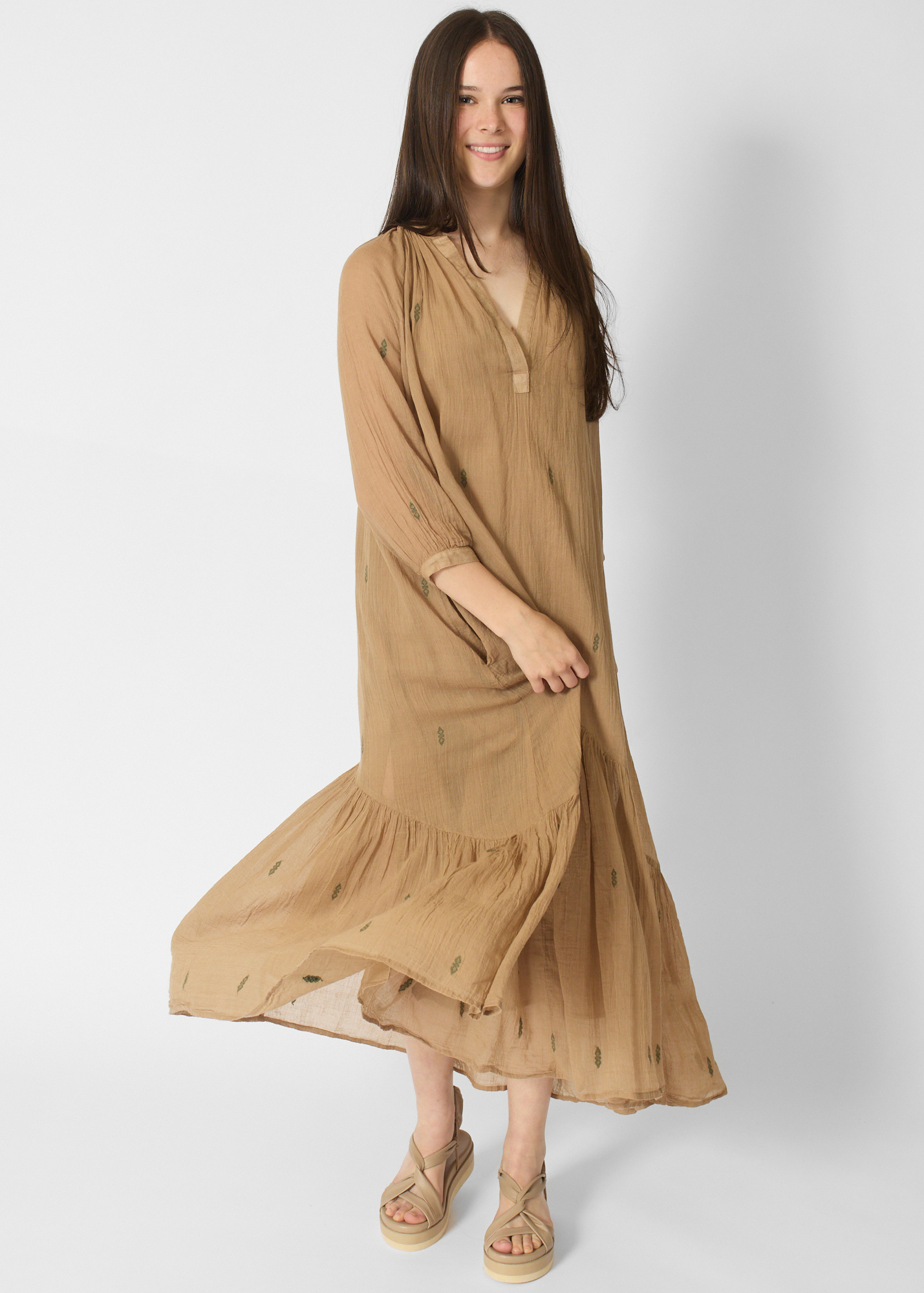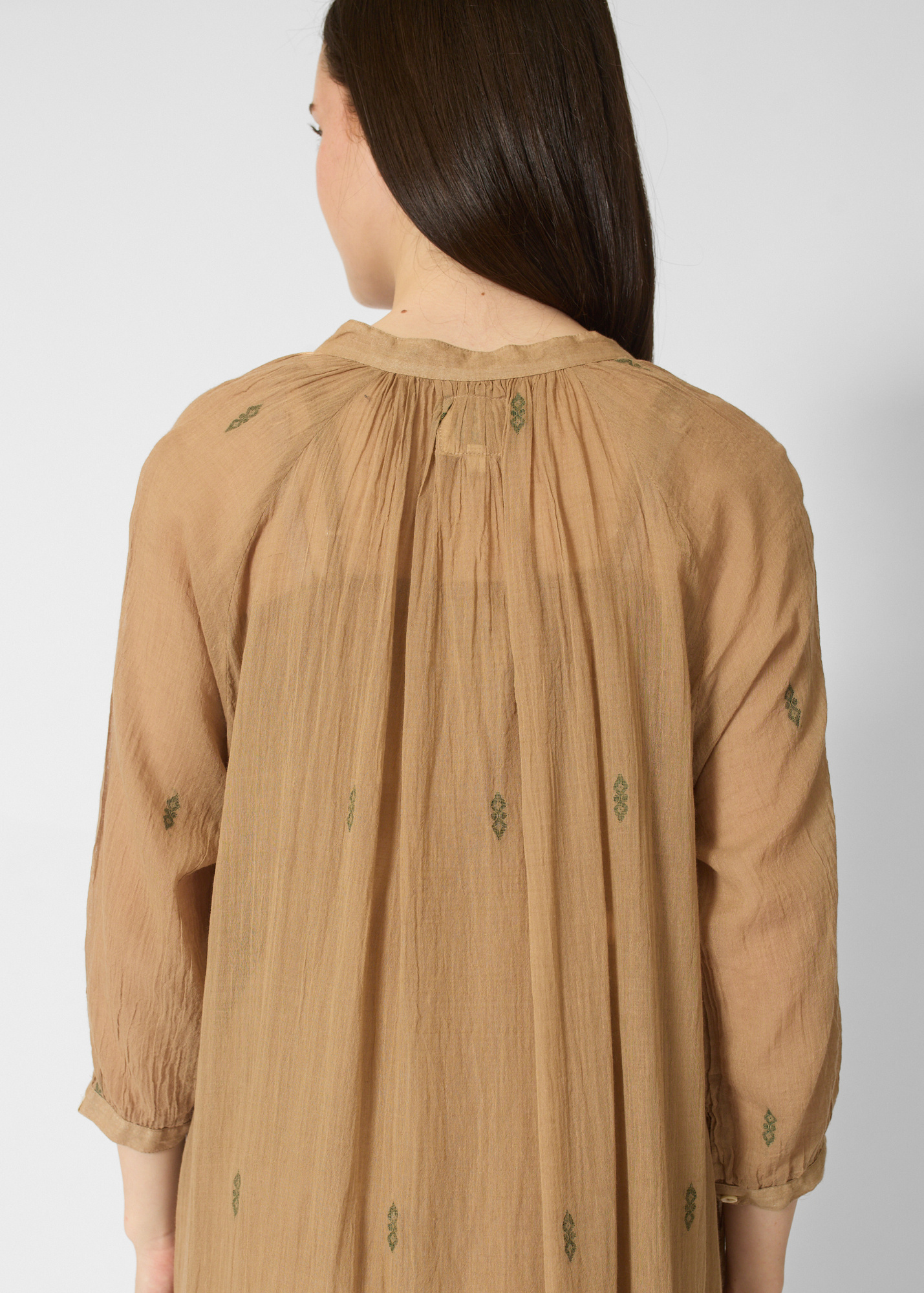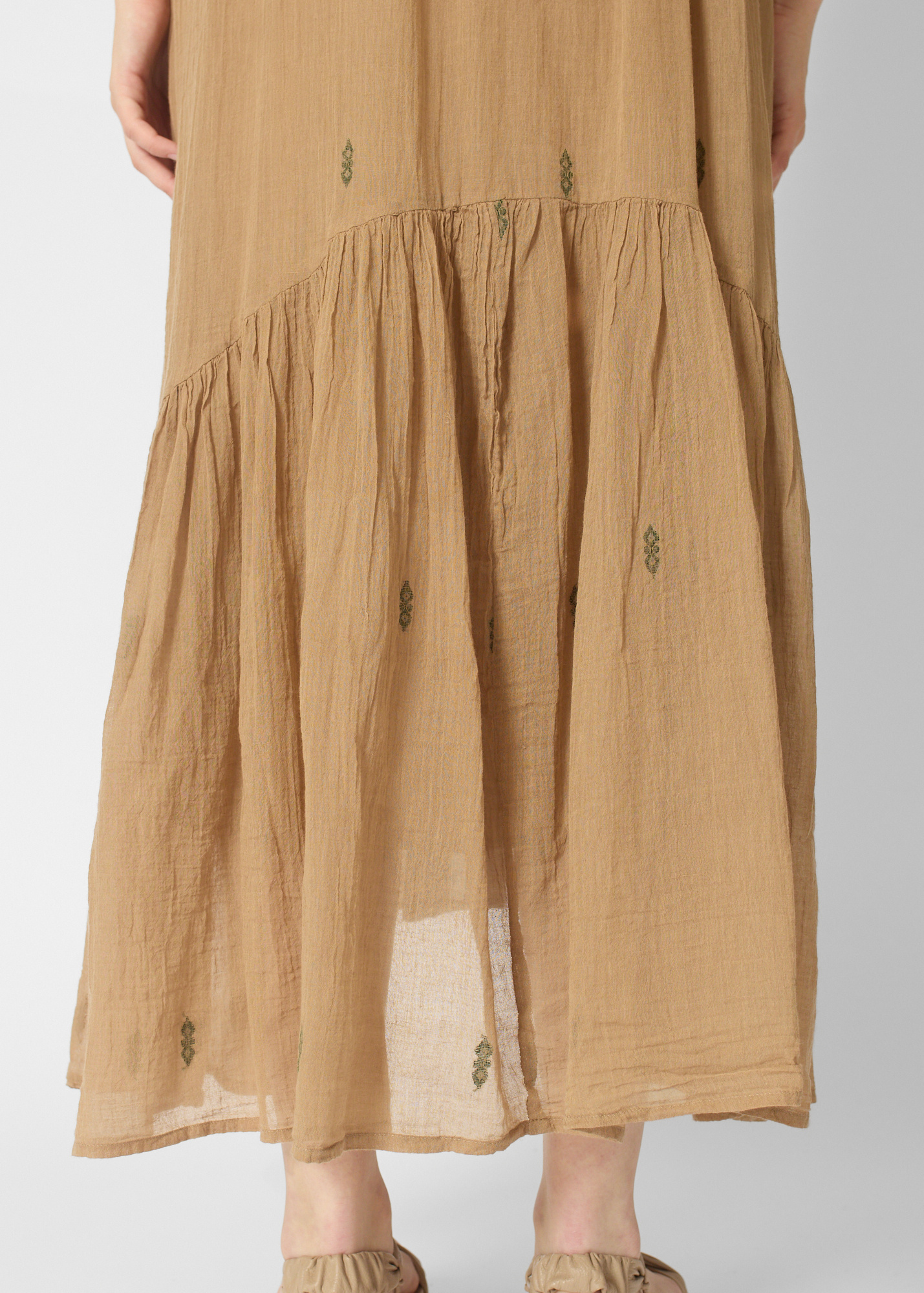 A very light Khadi cotton embroidered dress has a V-neck, three-quarter length sleeves, and side pockets.
