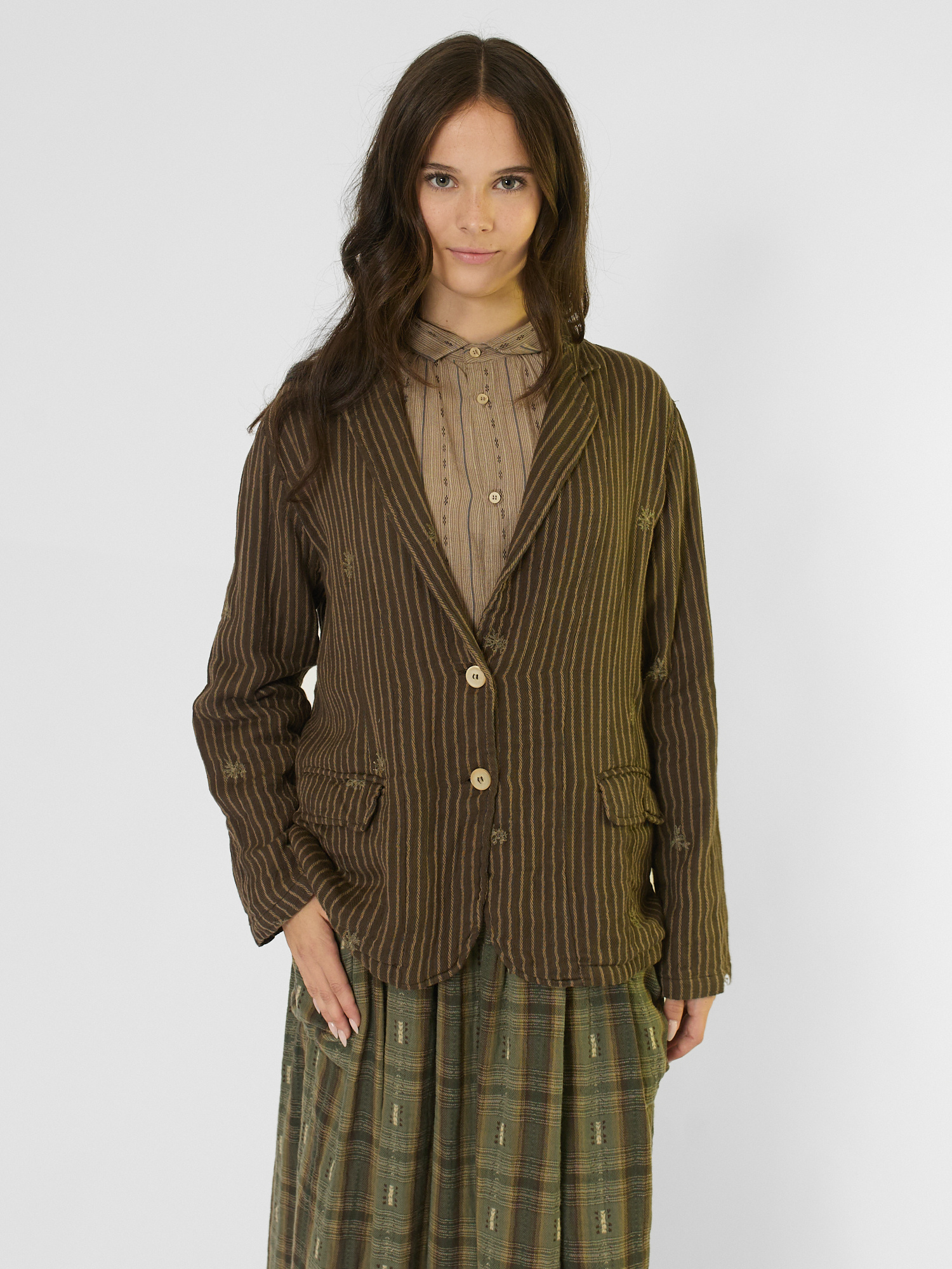 The embroidered striped khadi cotton blazer has a button closure with patch pockets