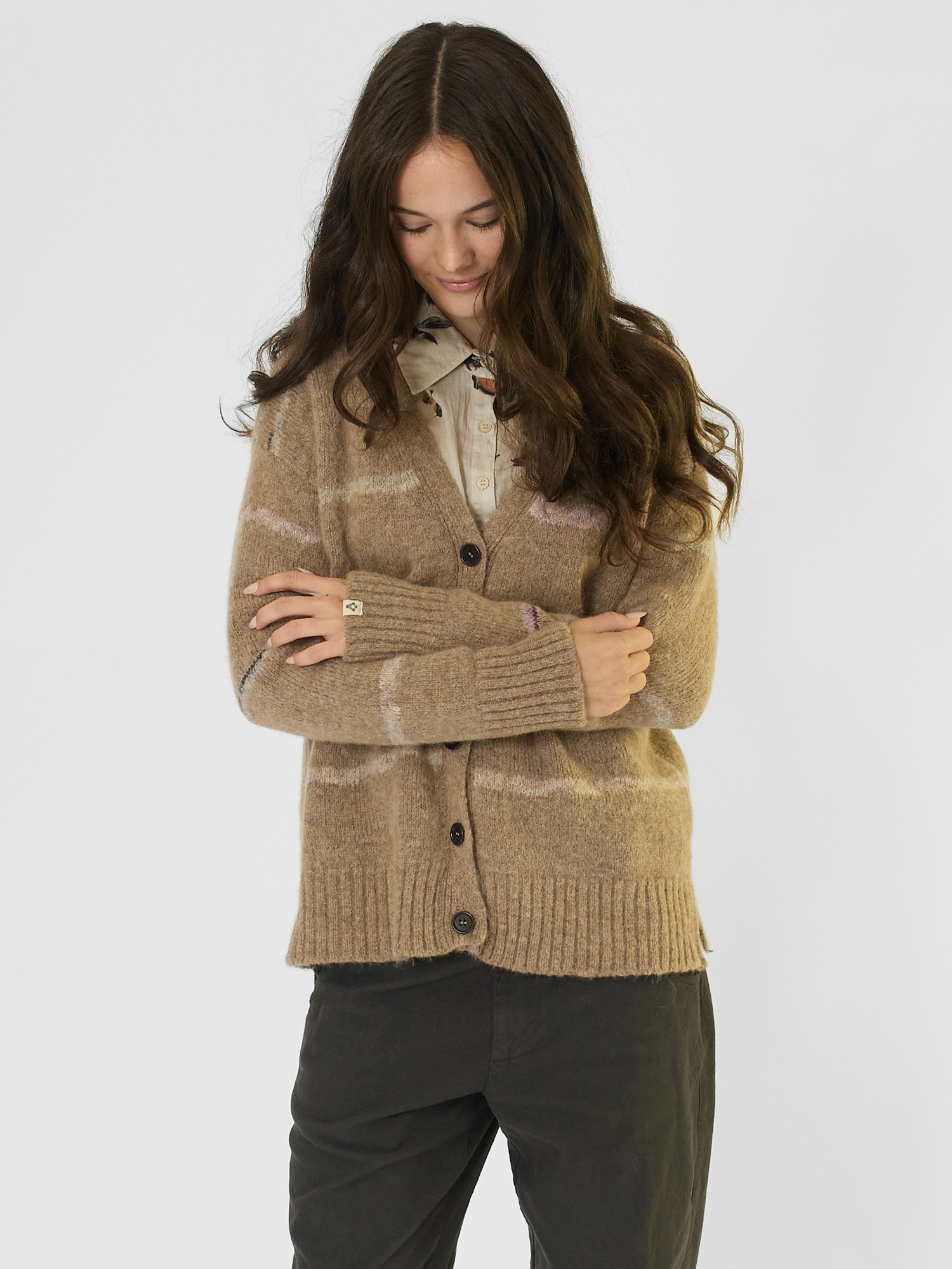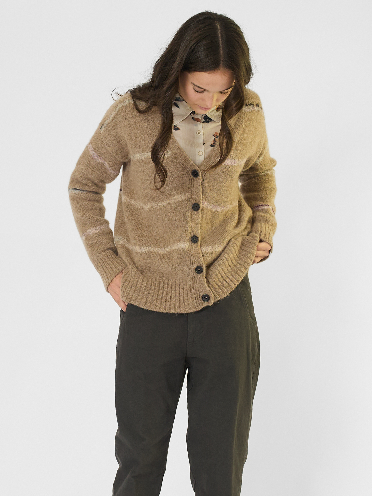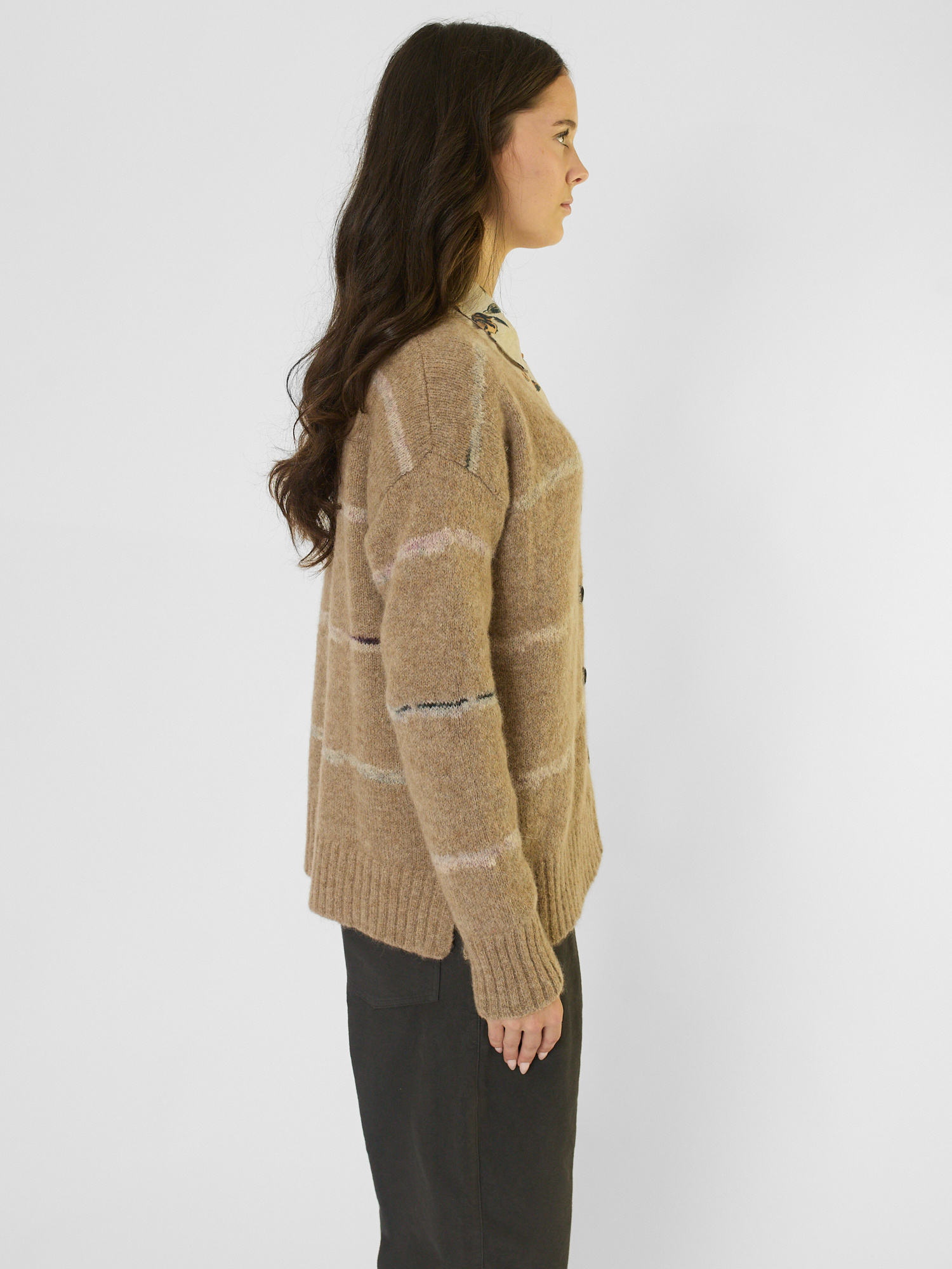 Wool mix cardigan has a slightly oversized body with drop-shoulder sleeves