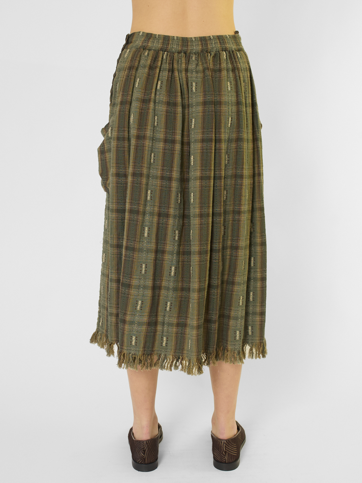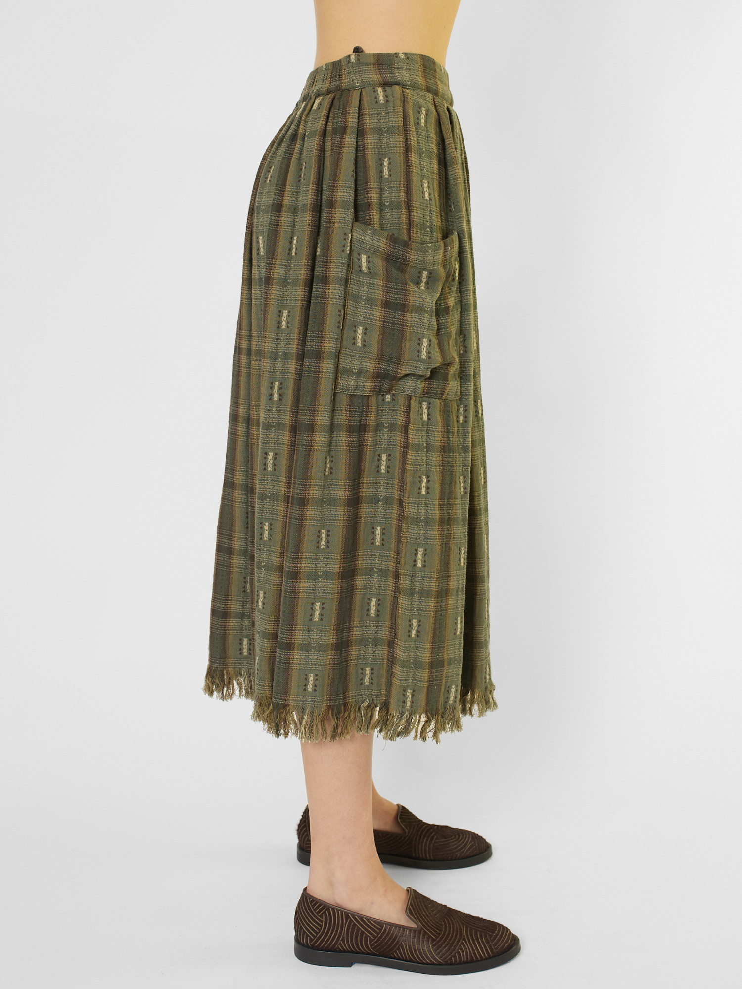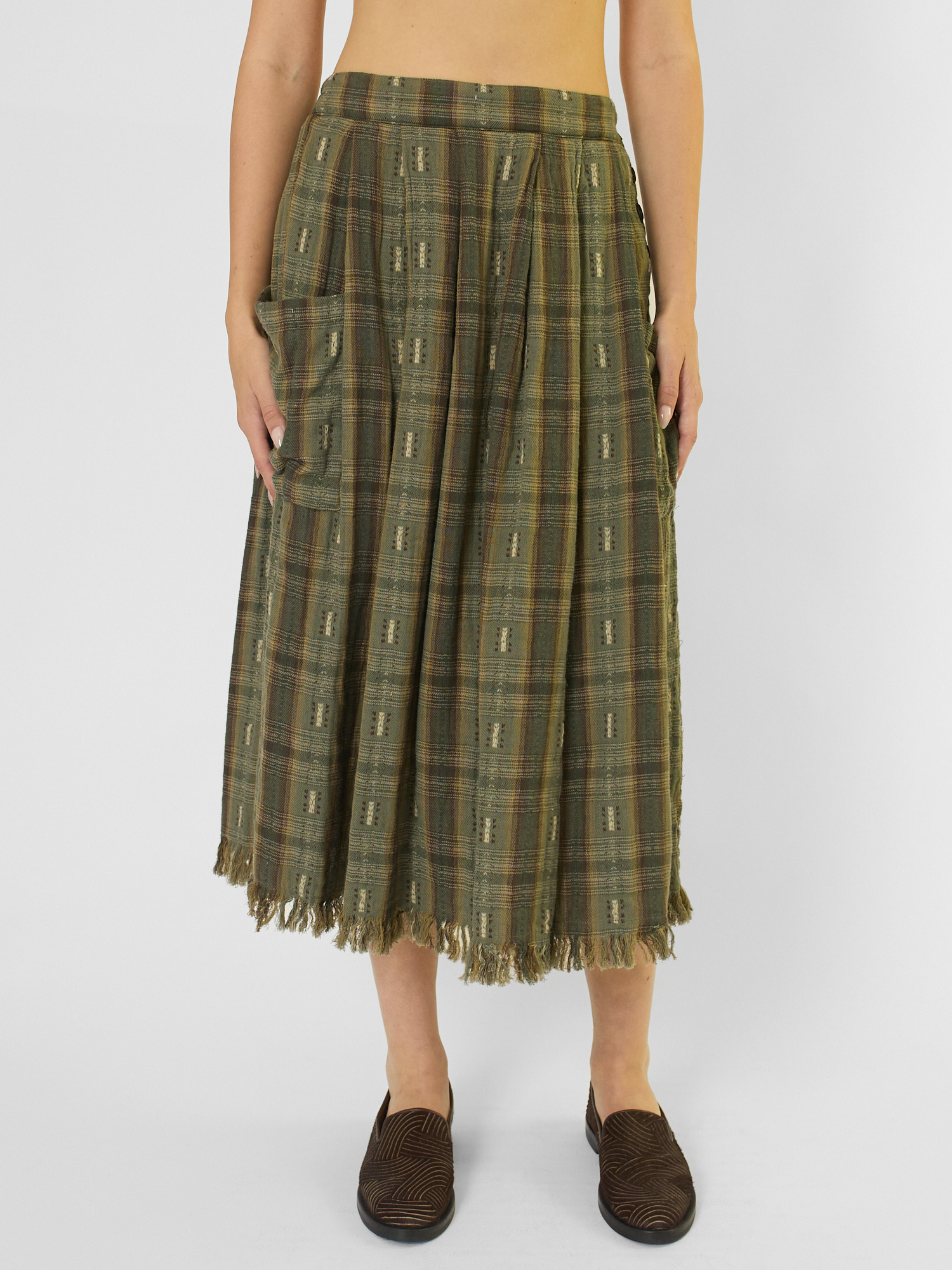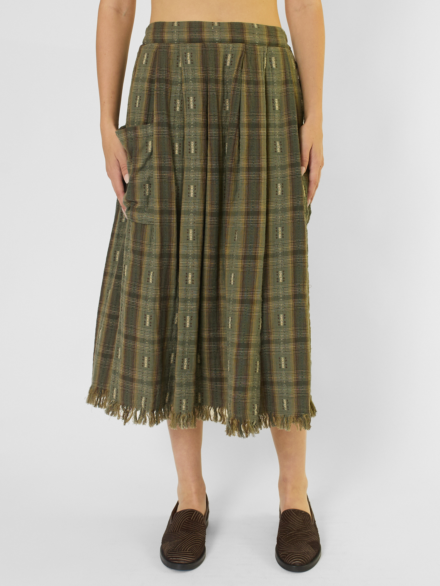 Embroidered khadi cotton full skirt features patch pockets and a fringed hem.