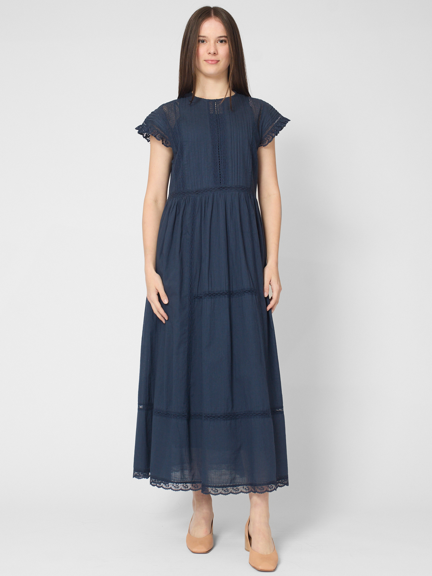 Cotton dress with a crew neckline, peaked cap sleeves, and a defined waist that falls into a full skirt at the lower calf with a separate cotton slip.