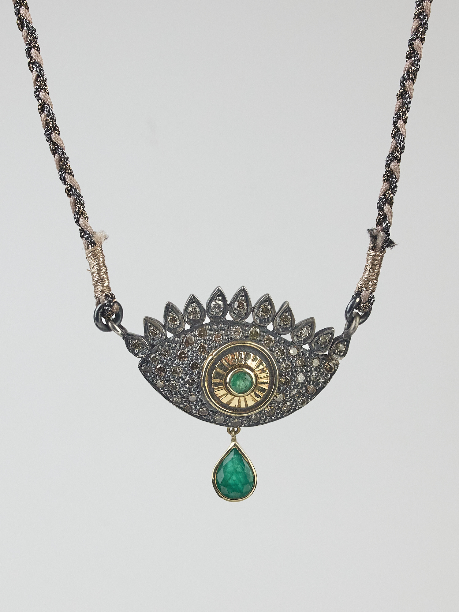 A gold and silver necklace designed as an eye-shaped pendant with an emerald drop and diamonds inserted