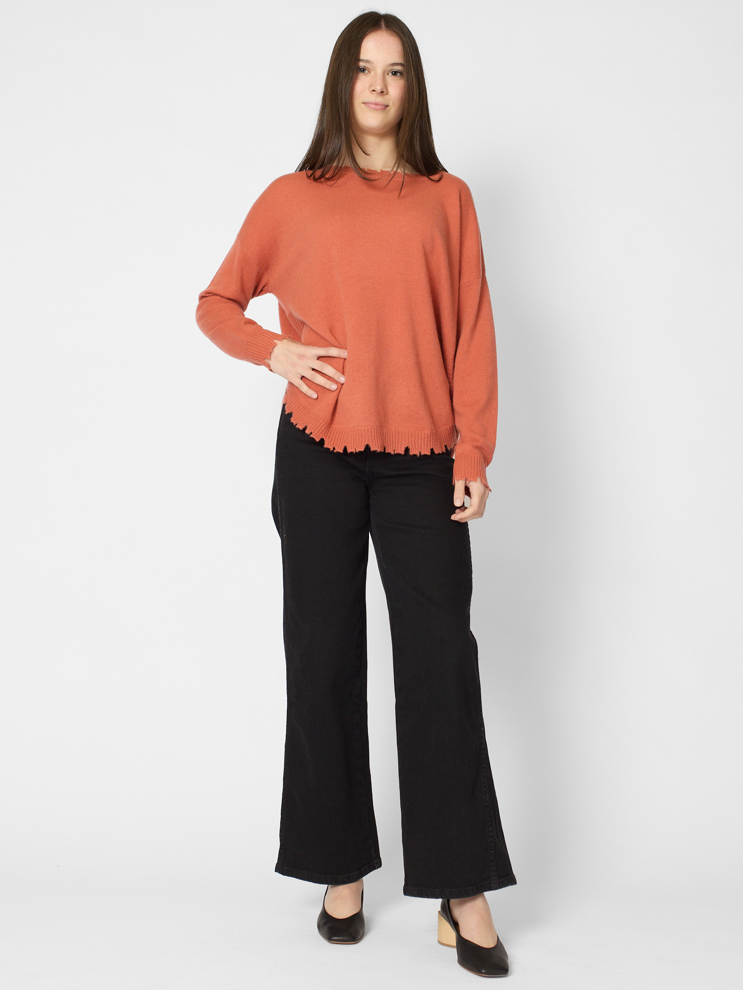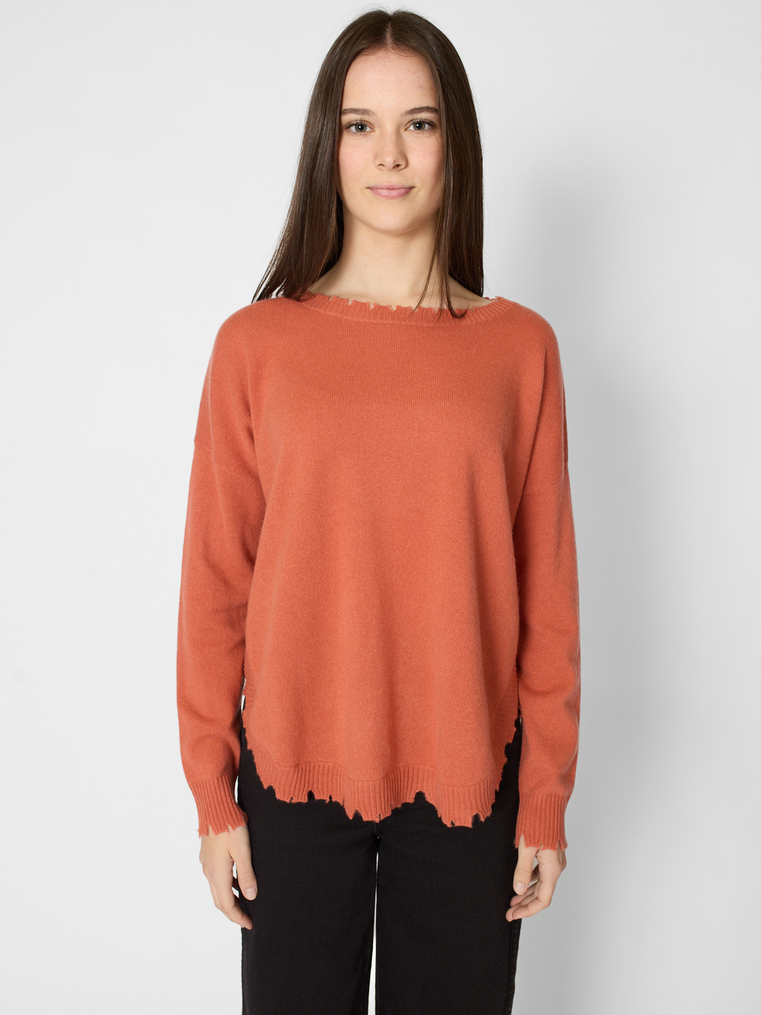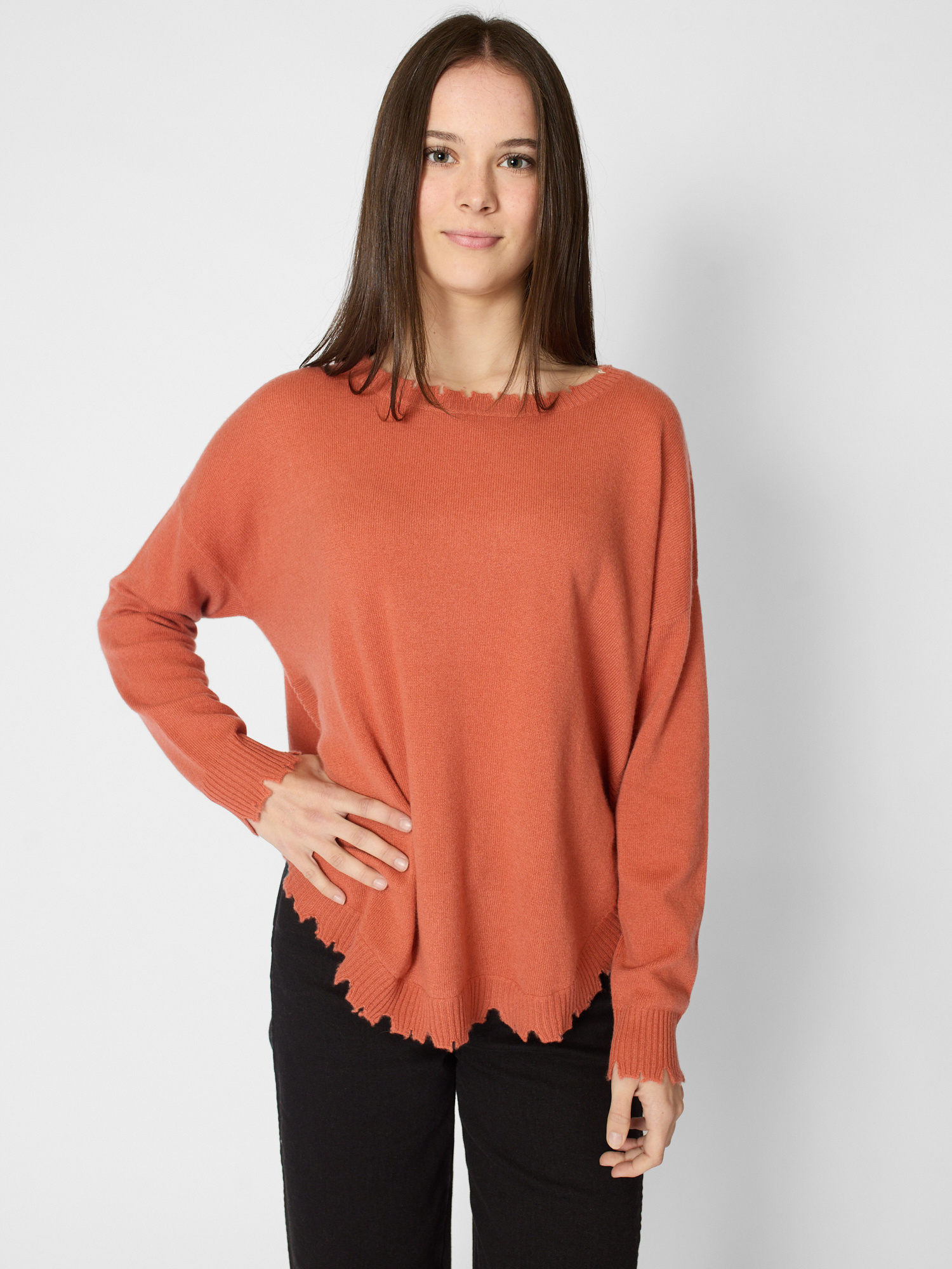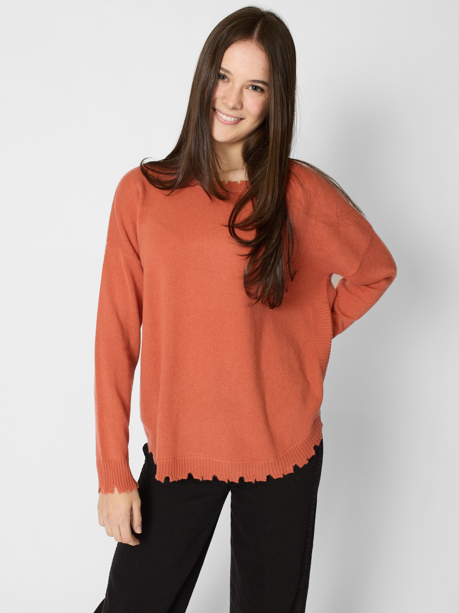 Round neck cashmere sweater with organic finished hem, collar, and cuff