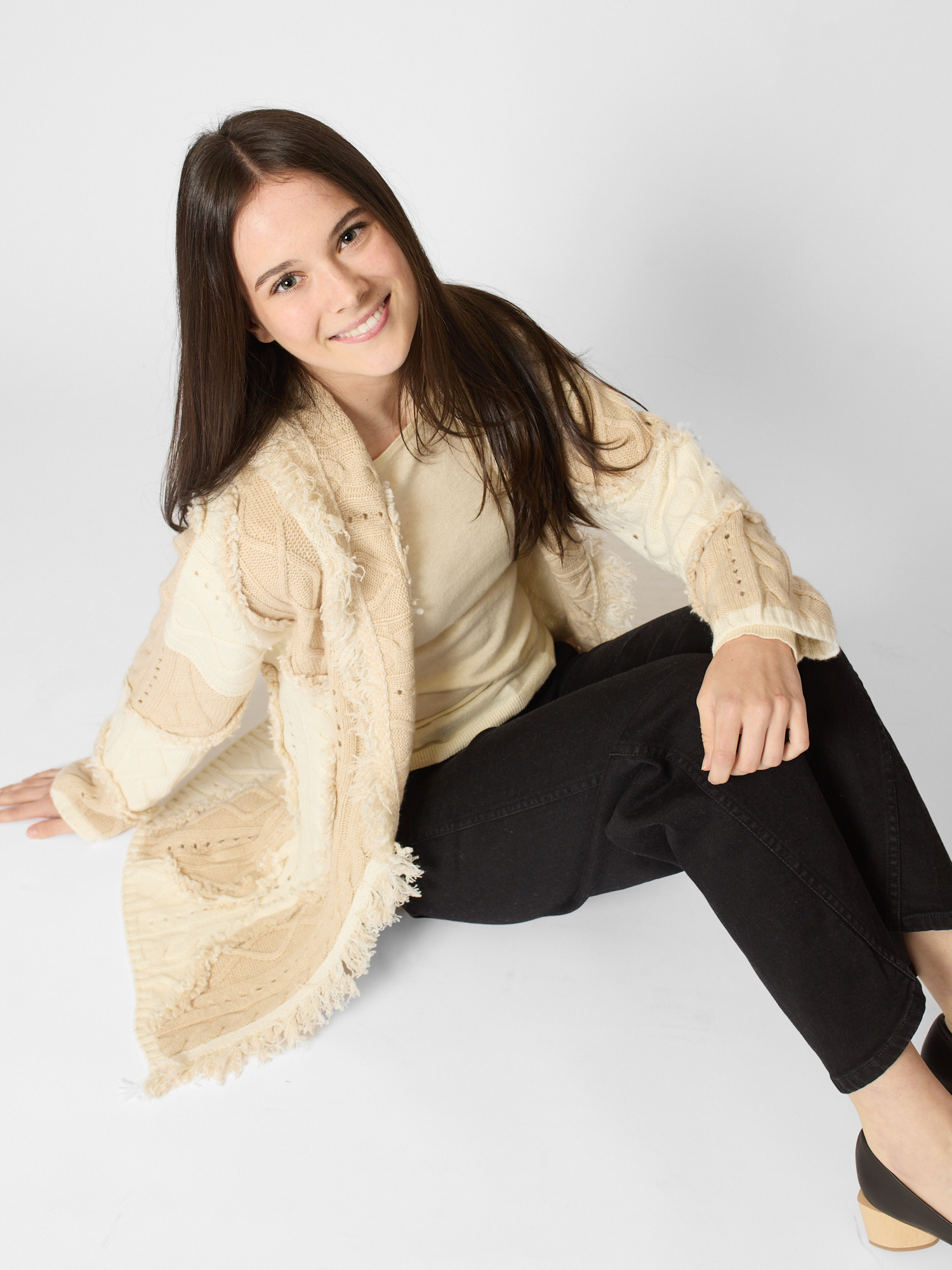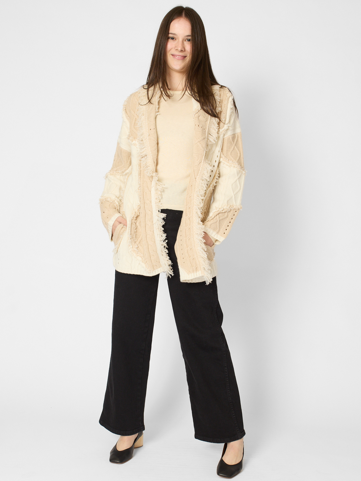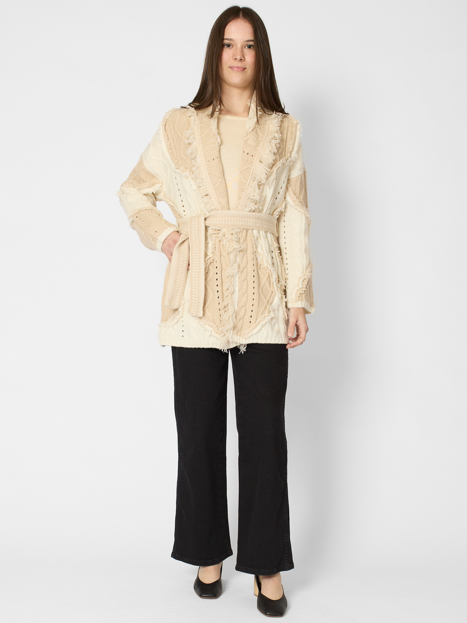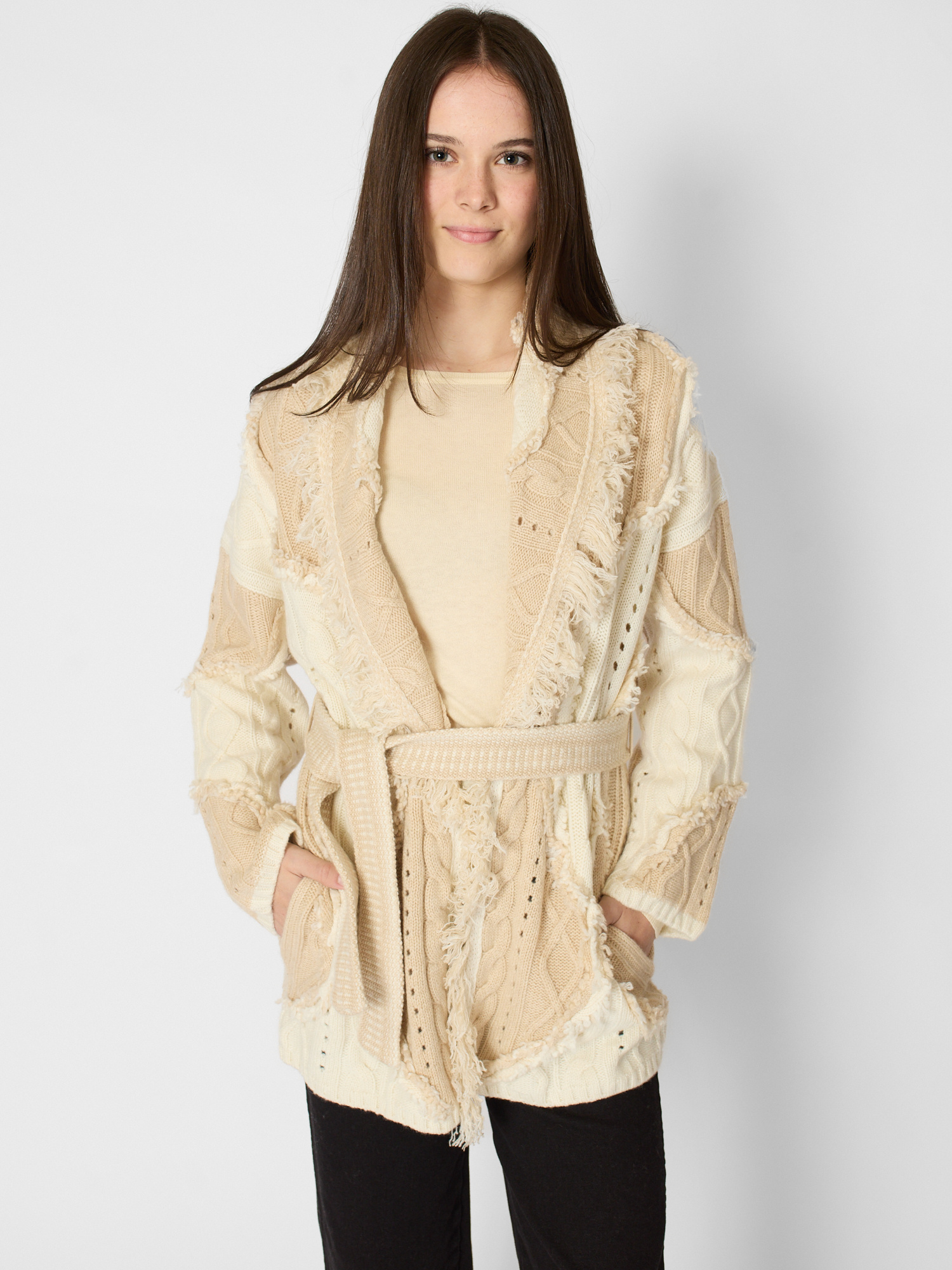Shawl collar cashmere cardigan with fringes in contrast beige tones
