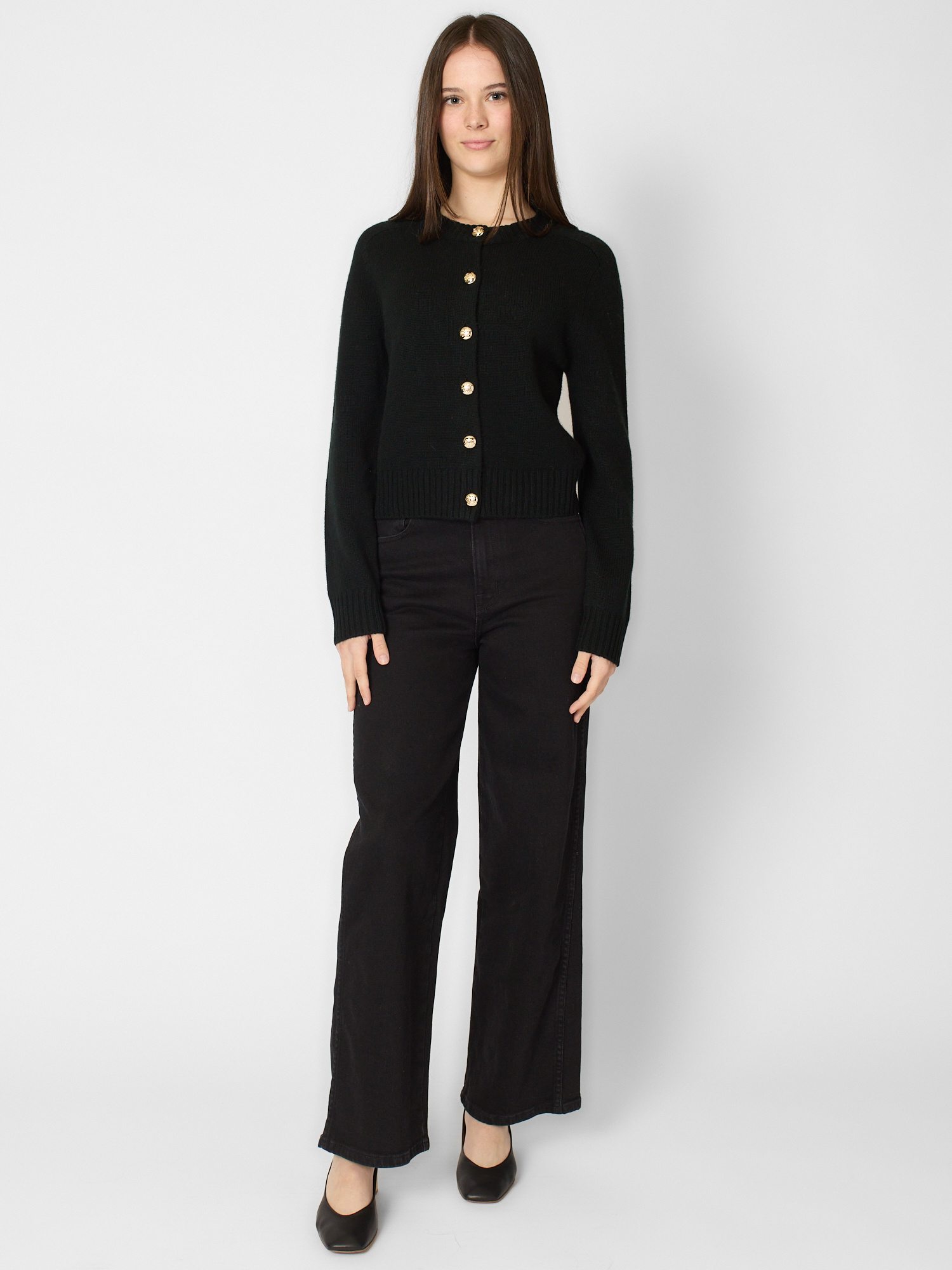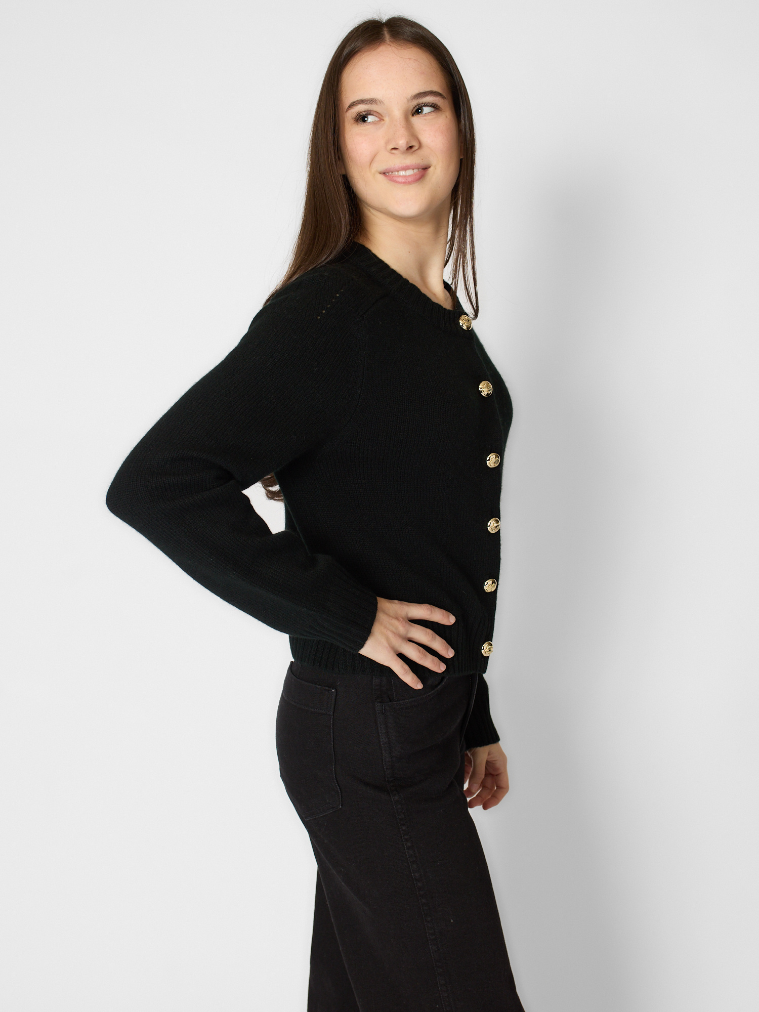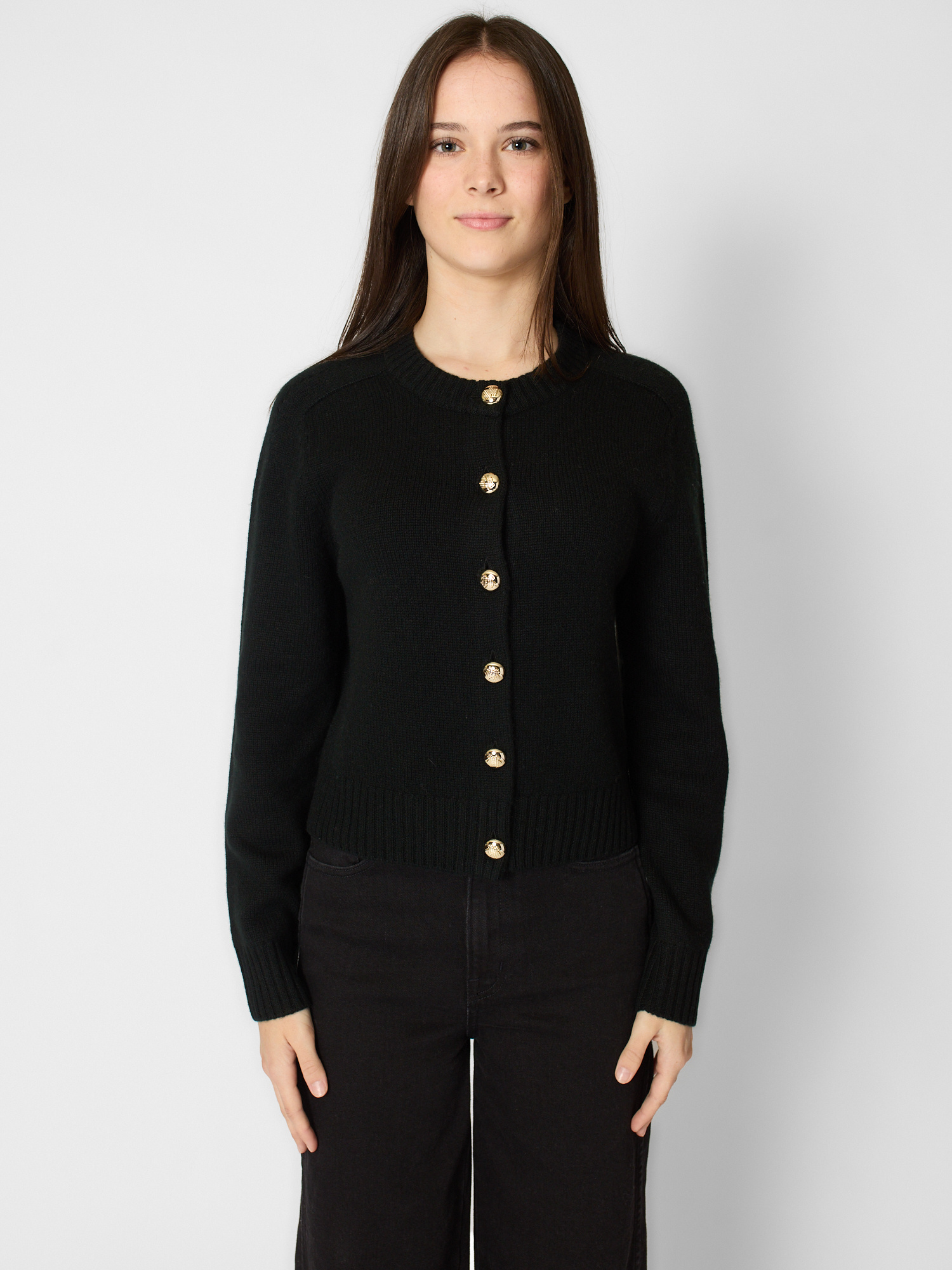 Crew neck cashmere cardigan with gold button closure