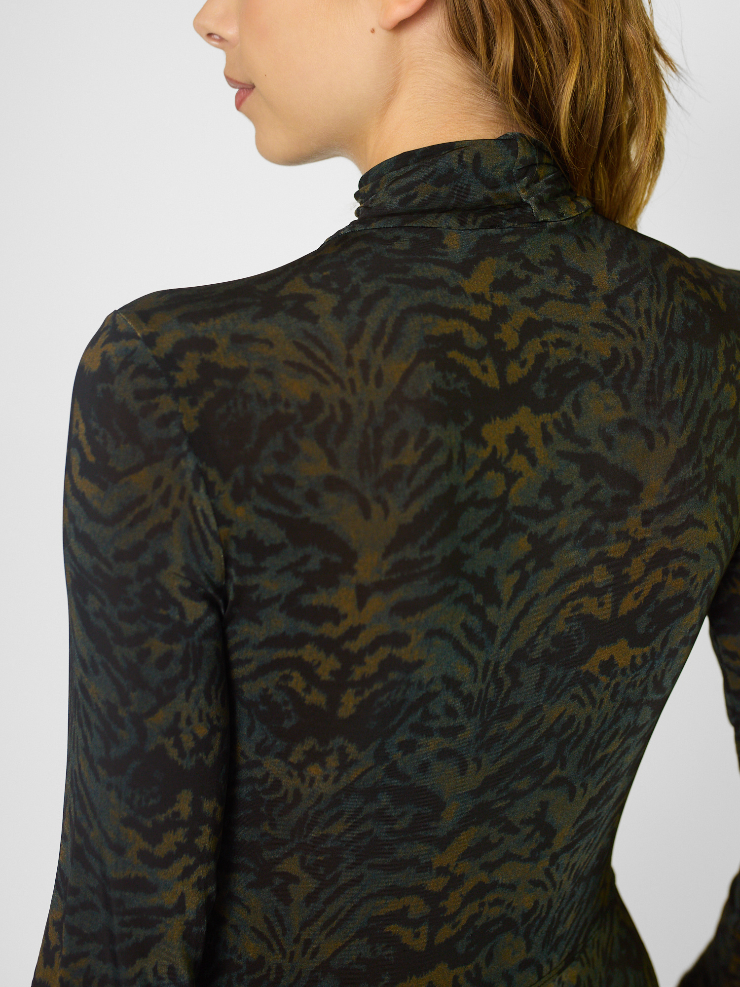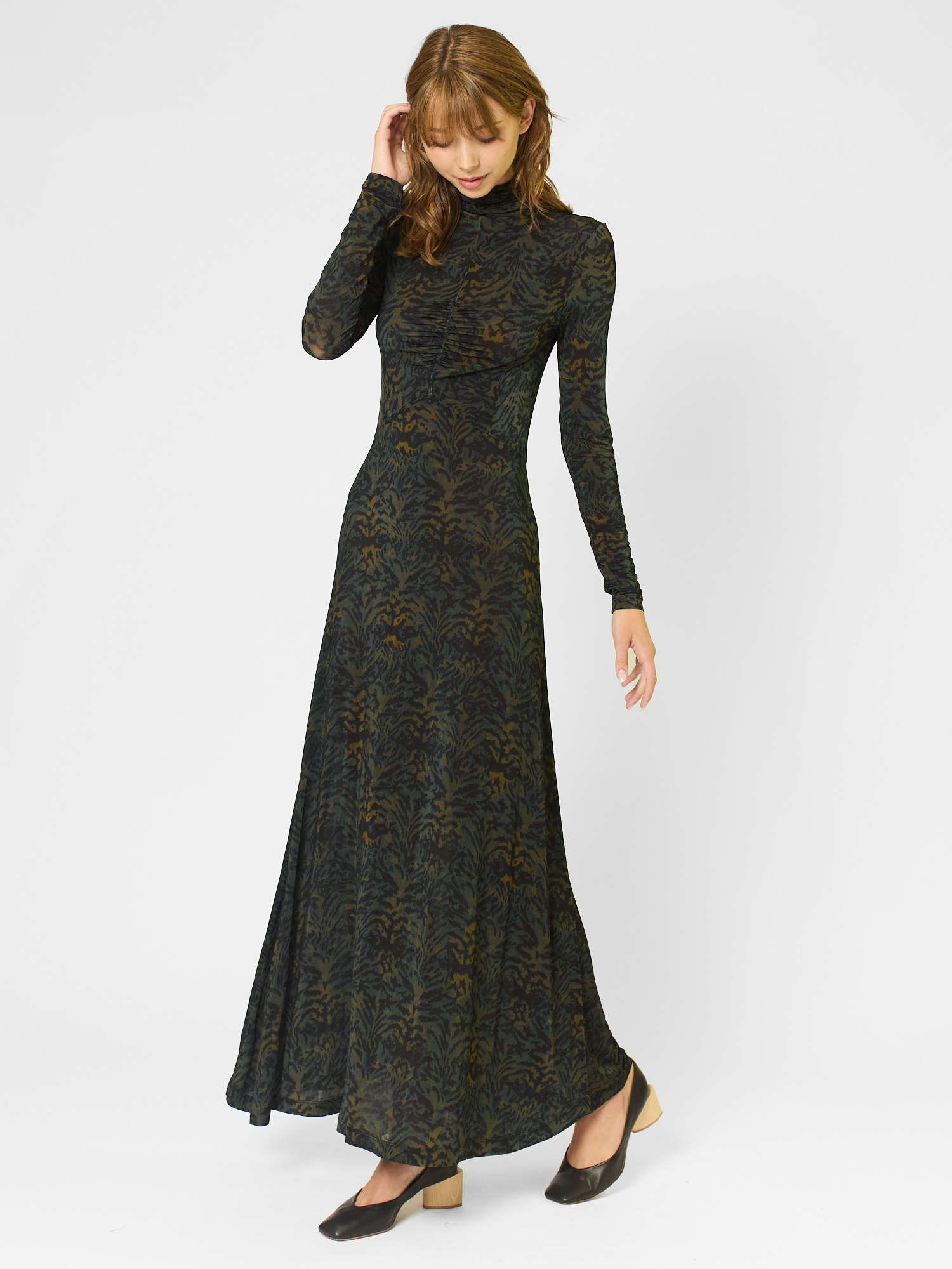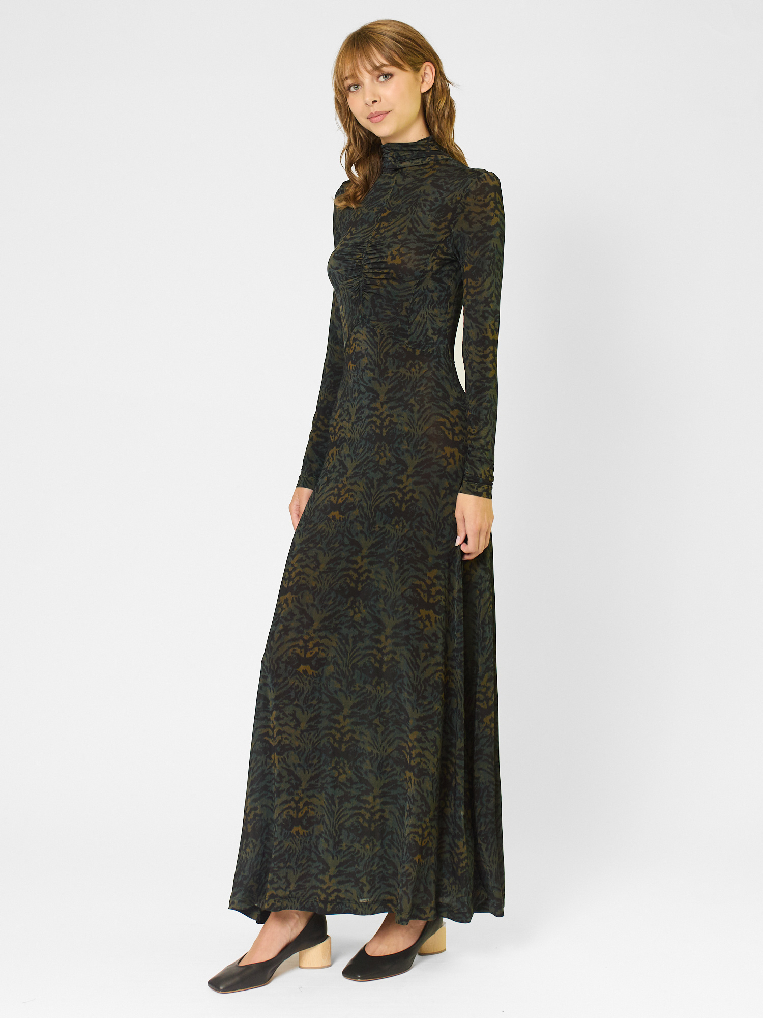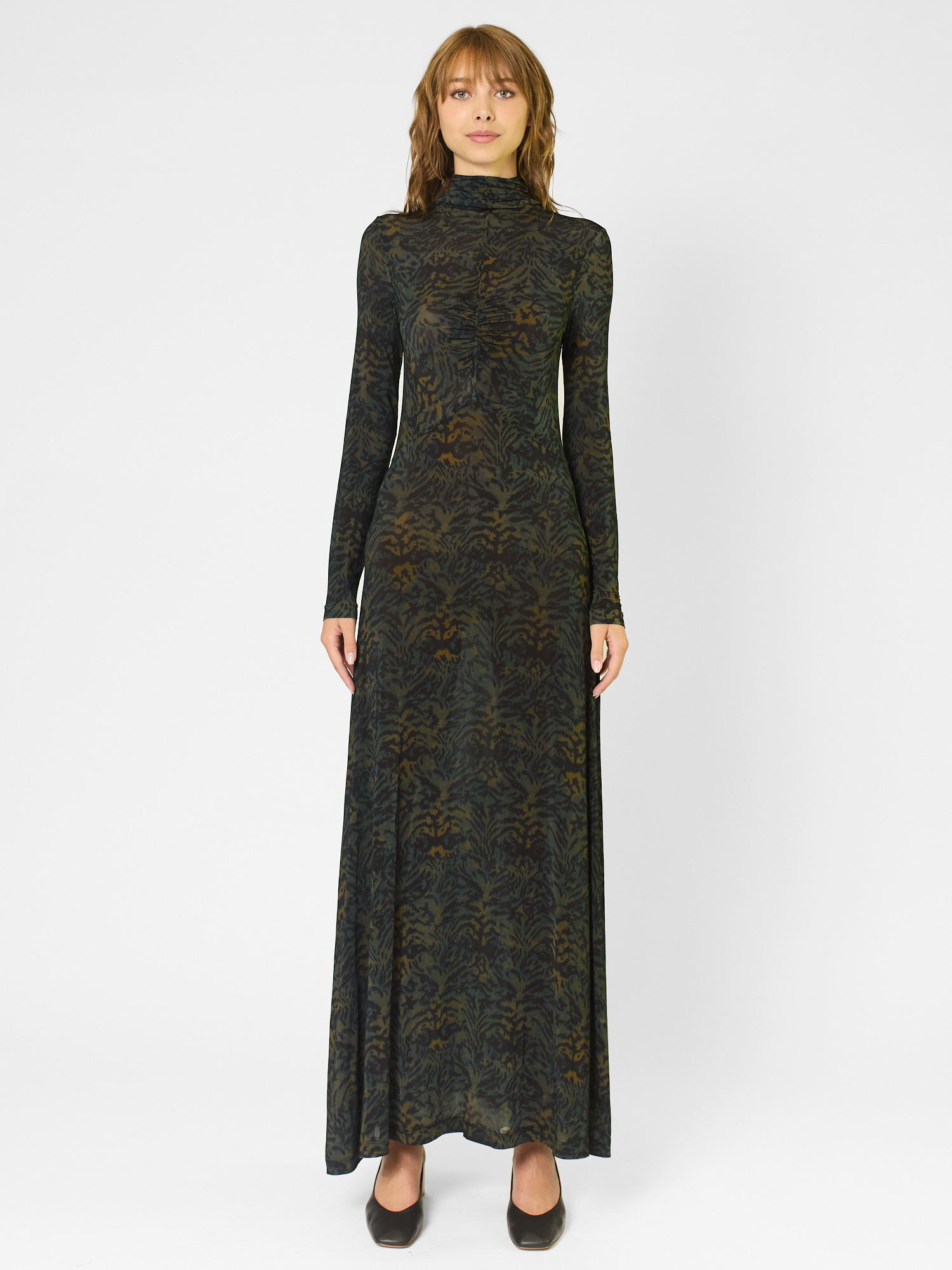 The multicolored silky pullover-style jersey dress features a ruched front that gently fits the body