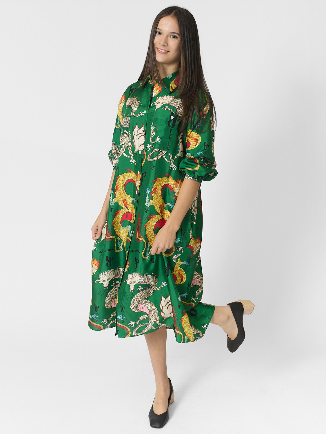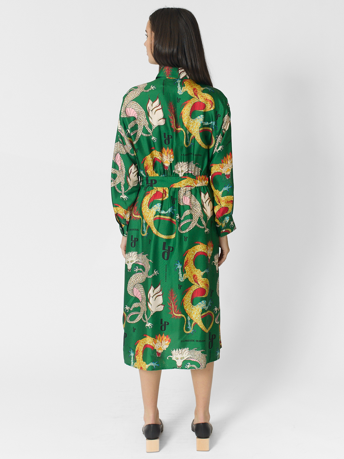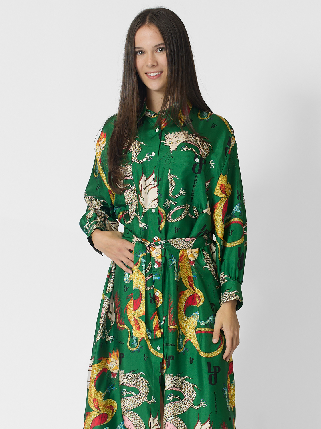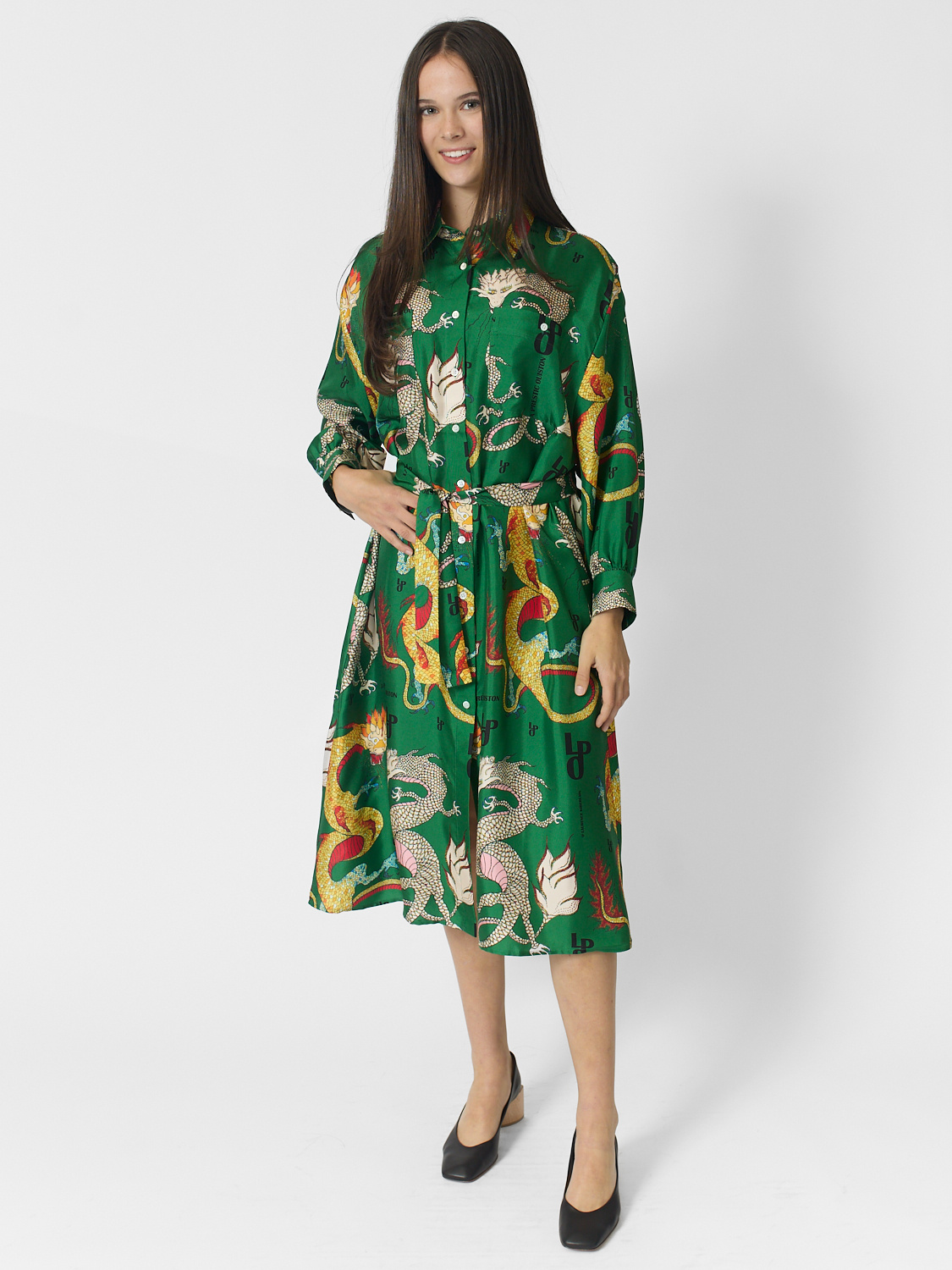 Button front midi dress, features long sleeves, side pockets in the seam, a waistband at the back to fix the belt, and mother-of-pearl buttons