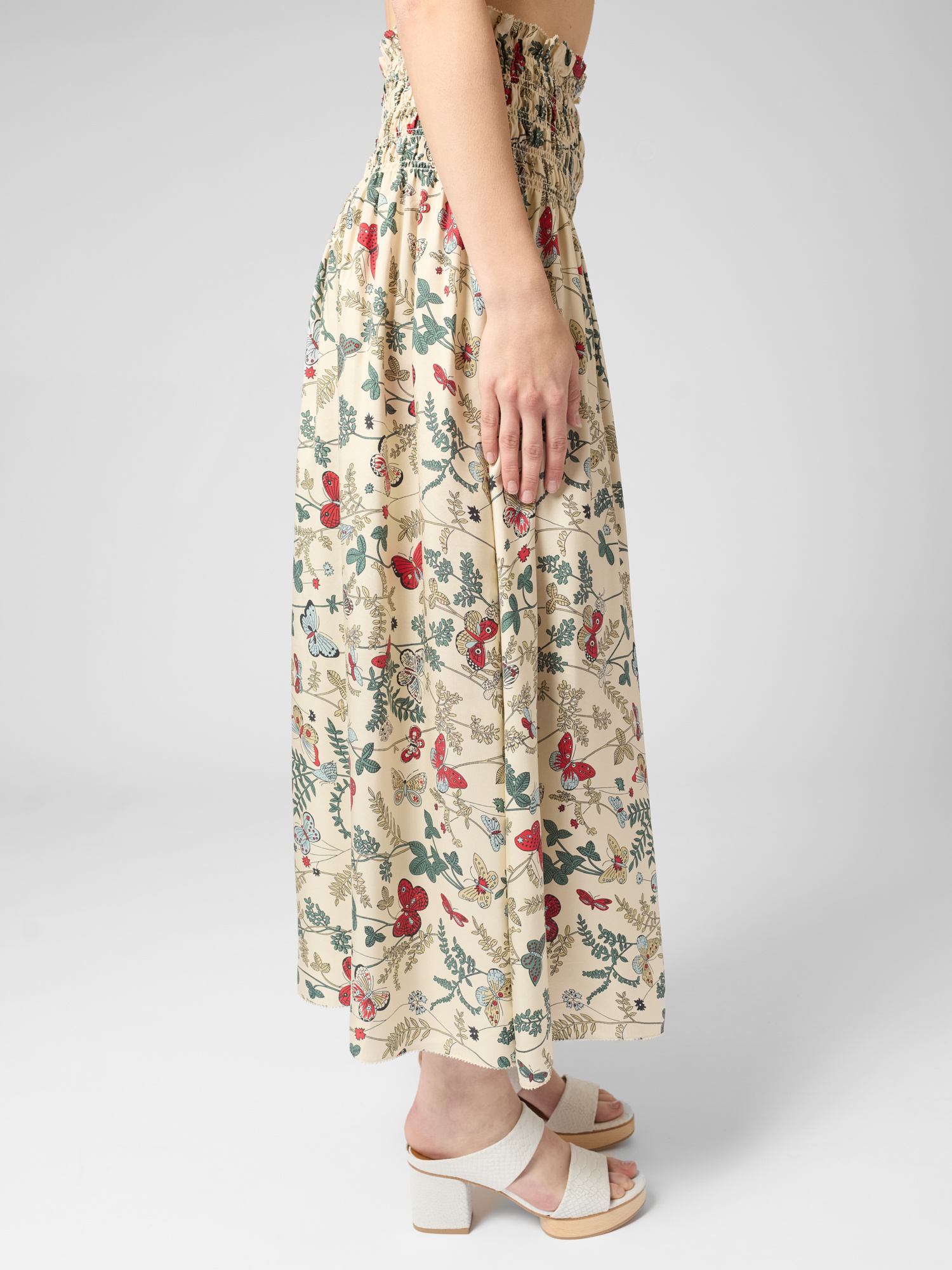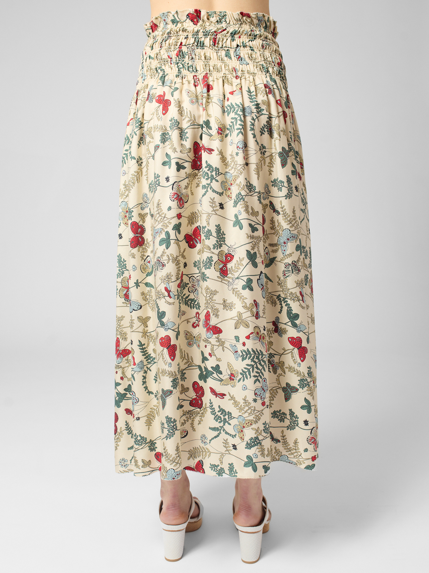 Easy pull-on silk skirt with a smocked waistband featuring rows of channeled elastic and a delicate picot-edge ruffle.