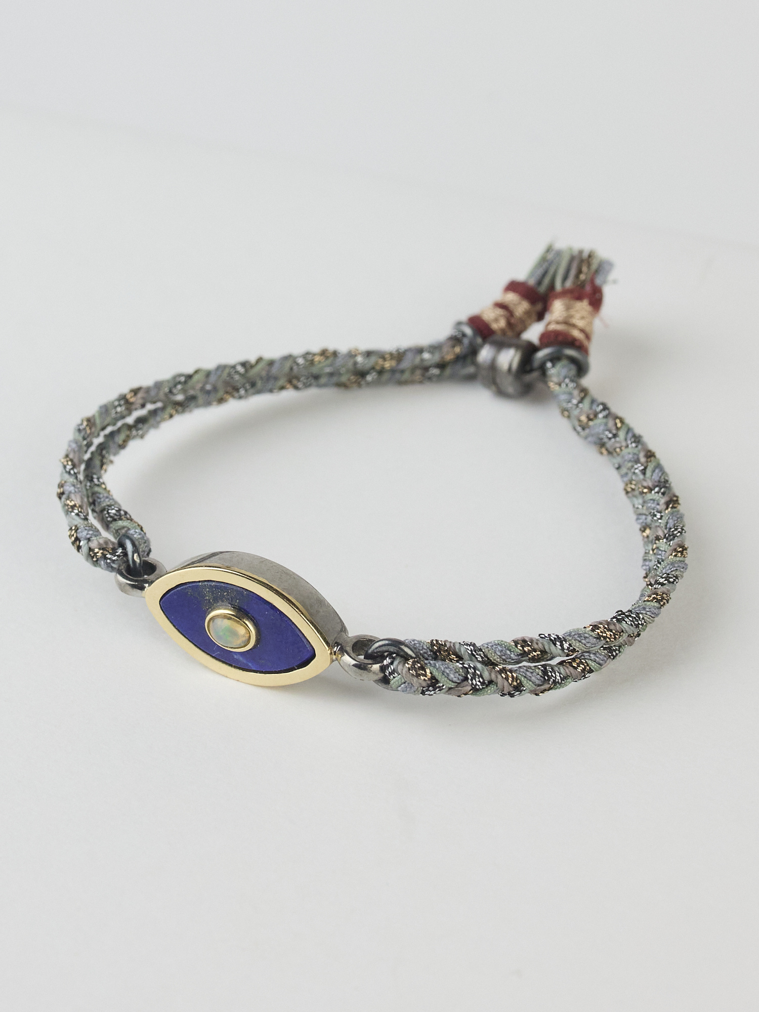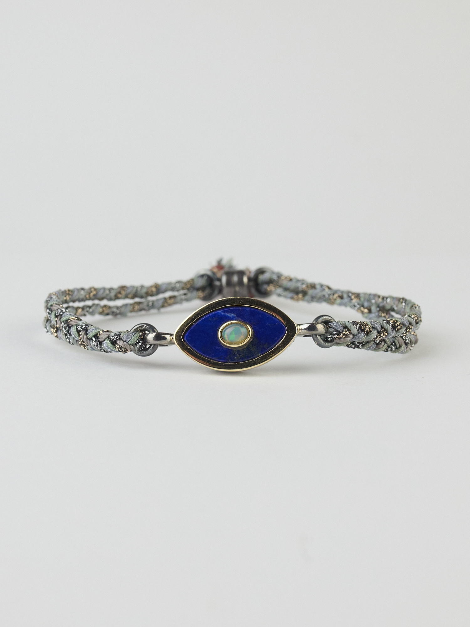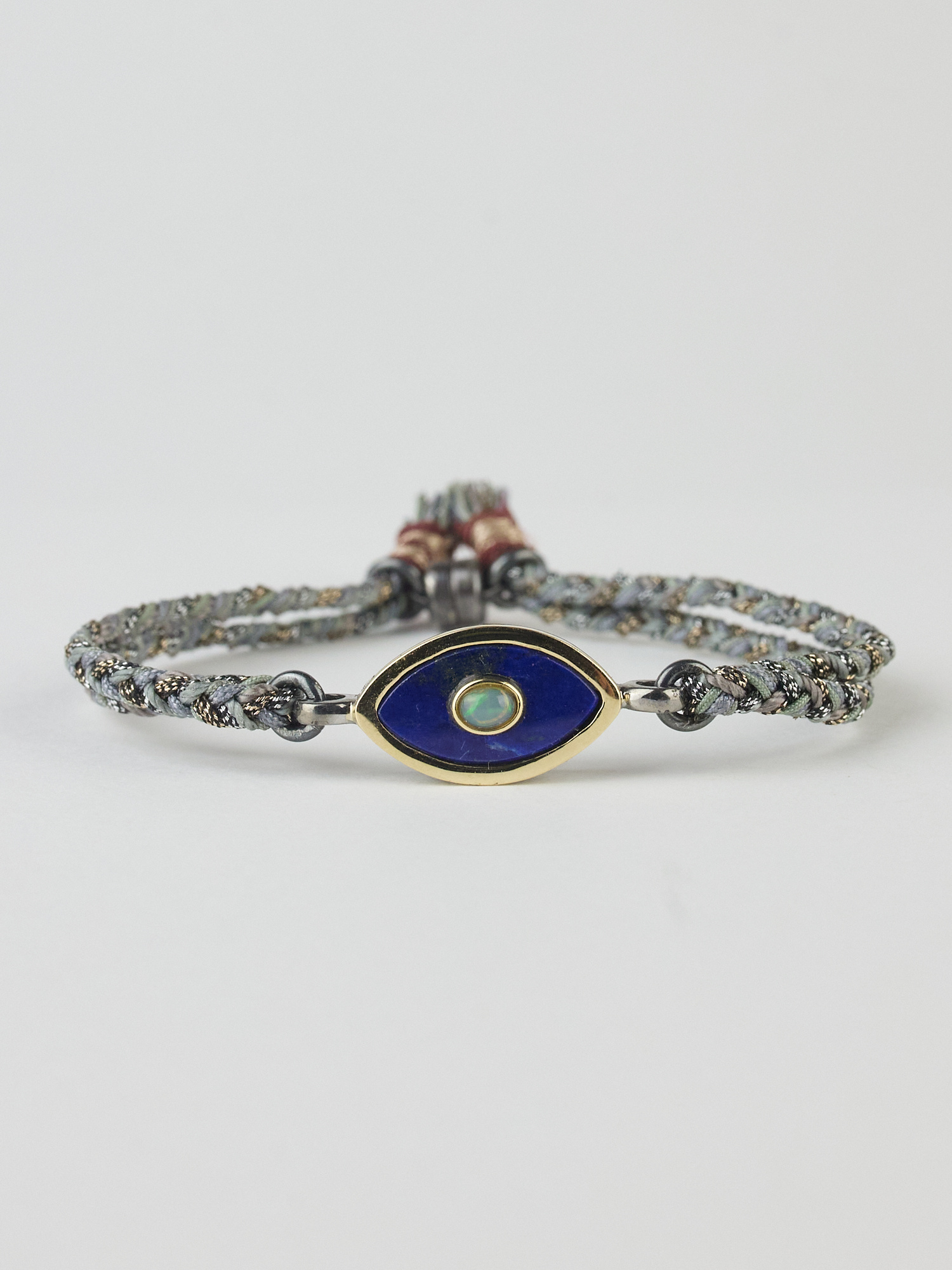 A gold and silver bracelet with a slide knot, designed as an evil eye centerpiece with Lapis and Opal inserted