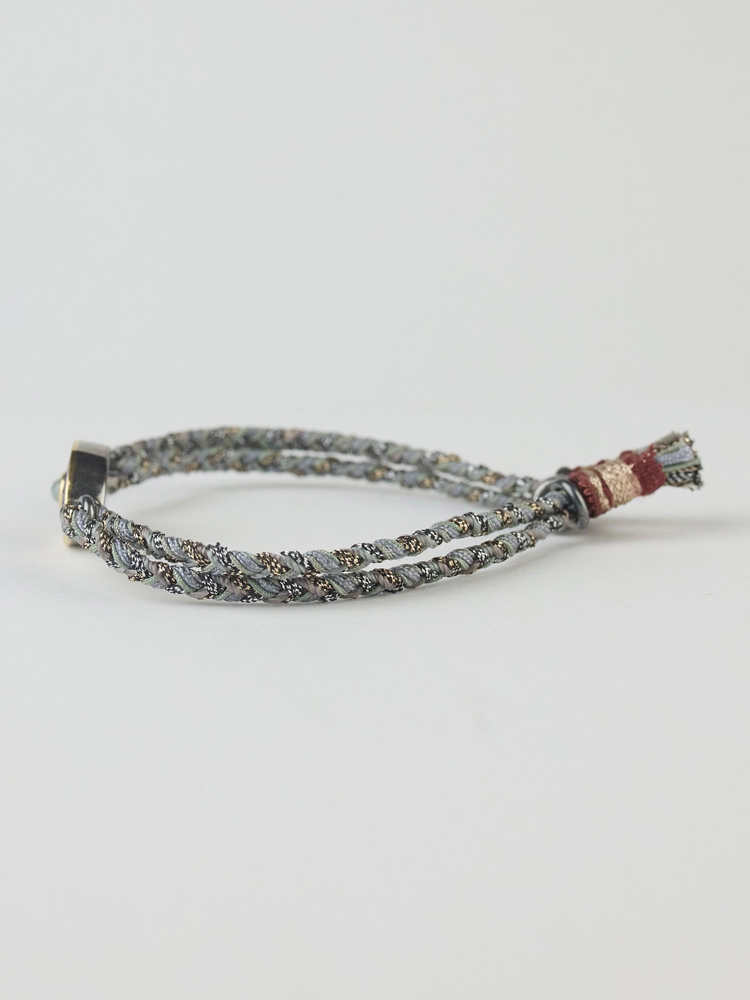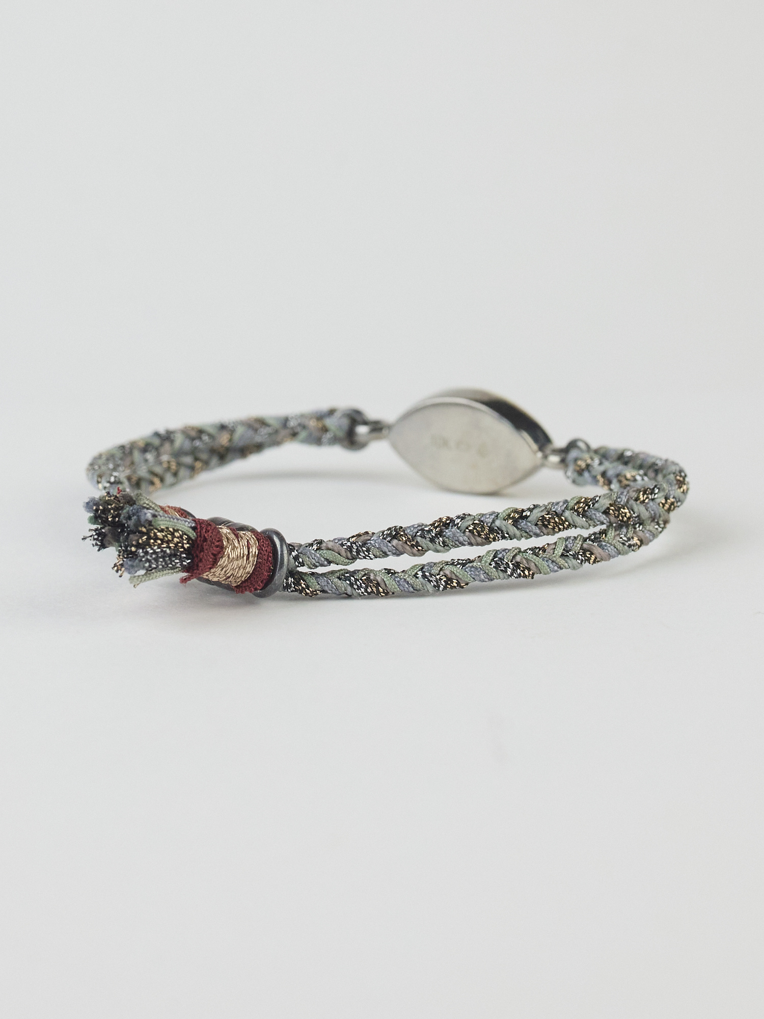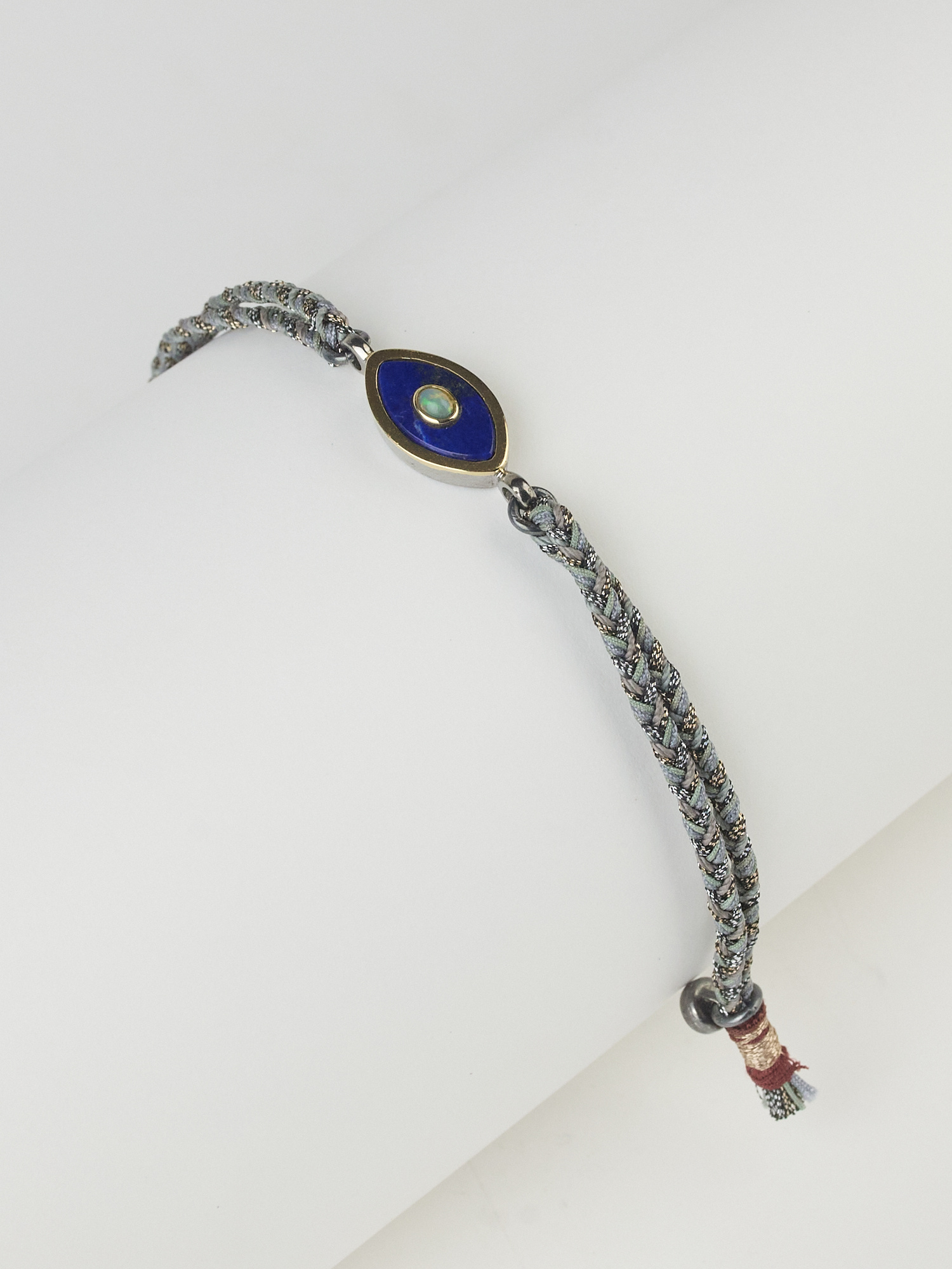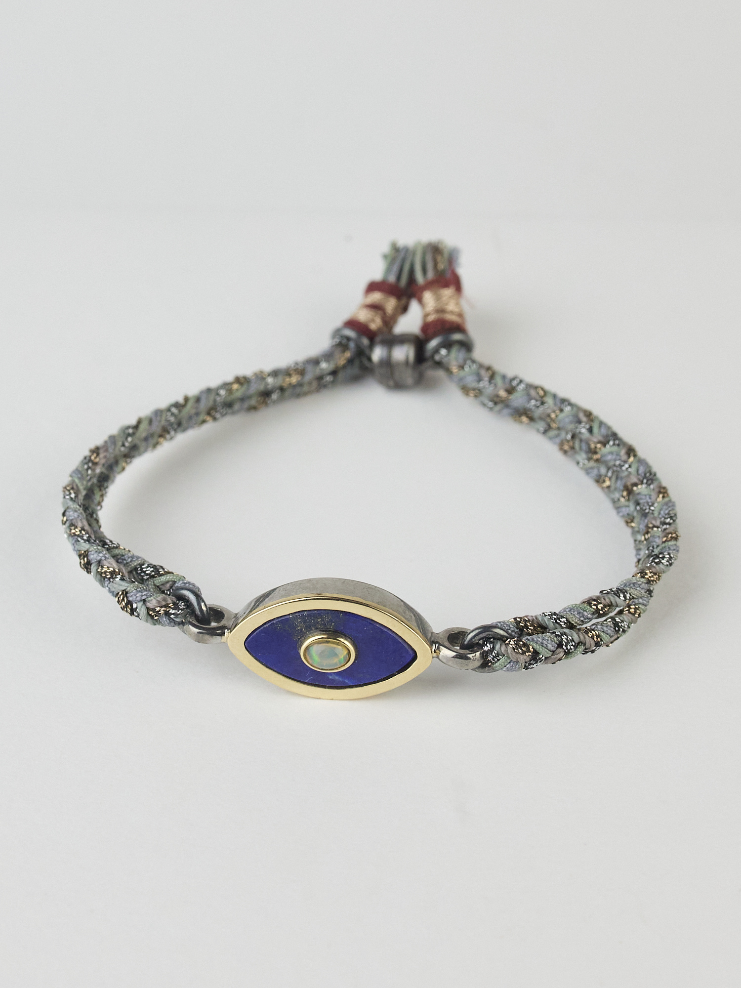 A gold and silver bracelet with a slide knot, designed as an evil eye centerpiece with Lapis and Opal inserted