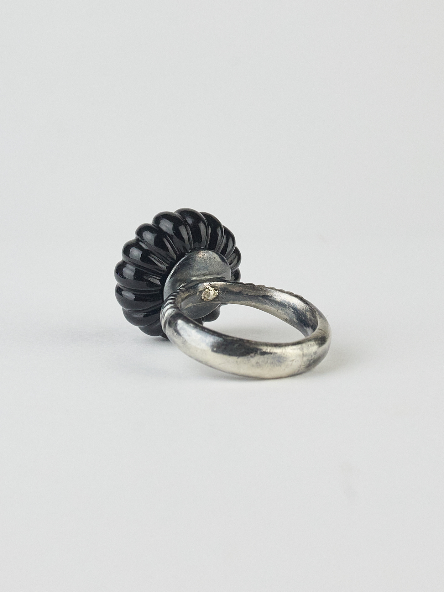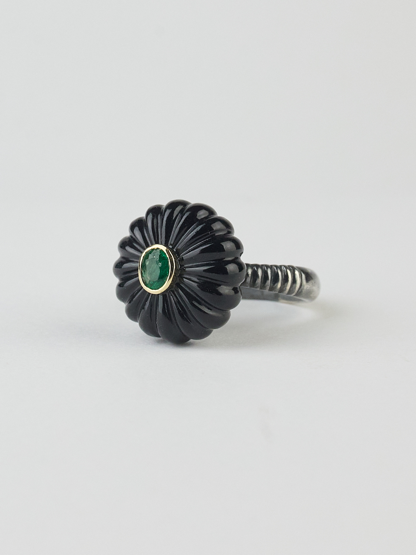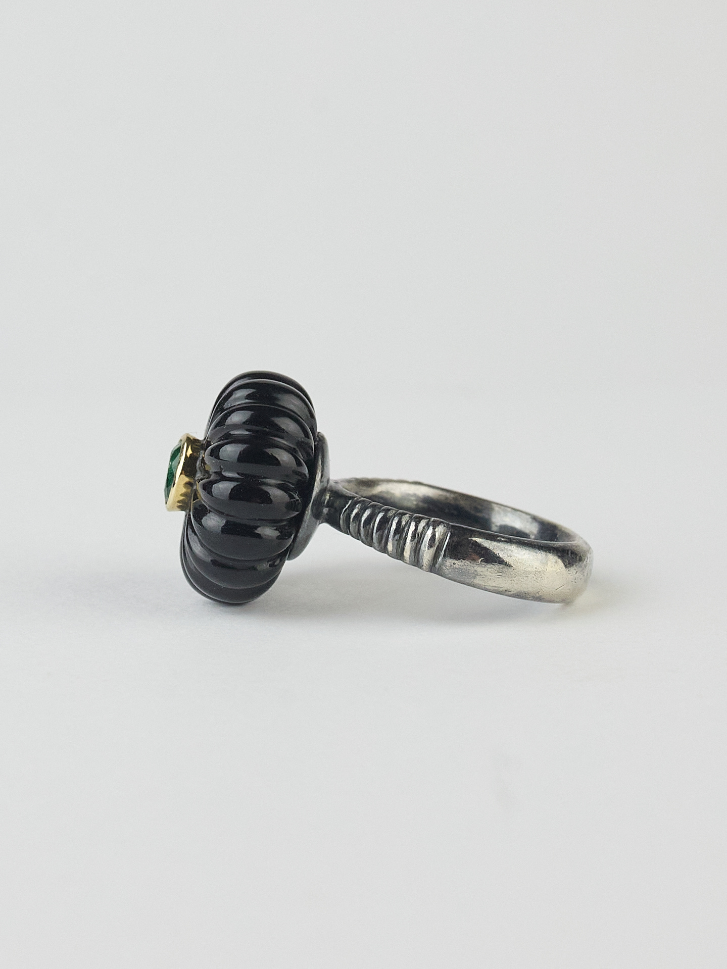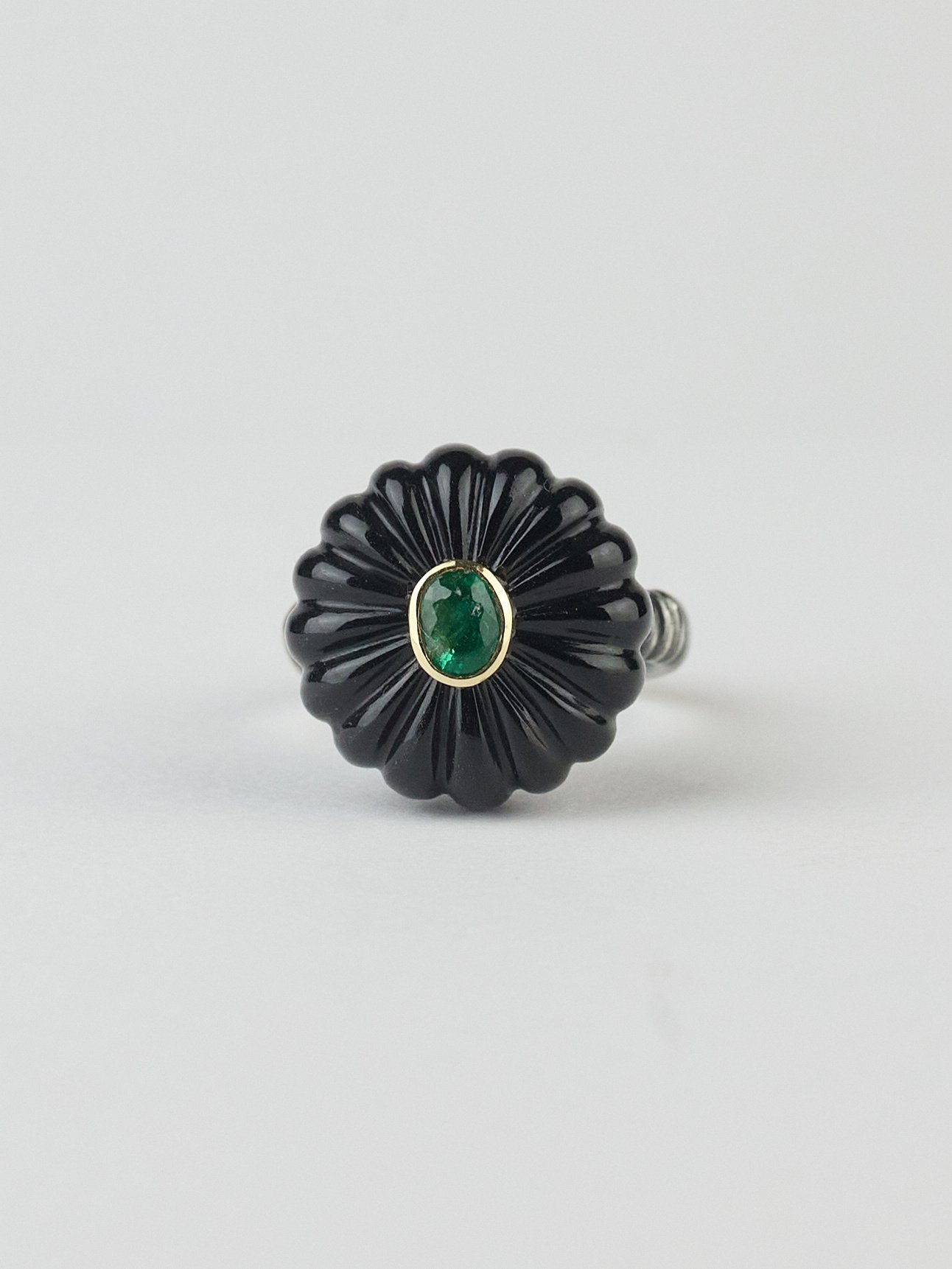 A gold and silver onex ring with an emerald