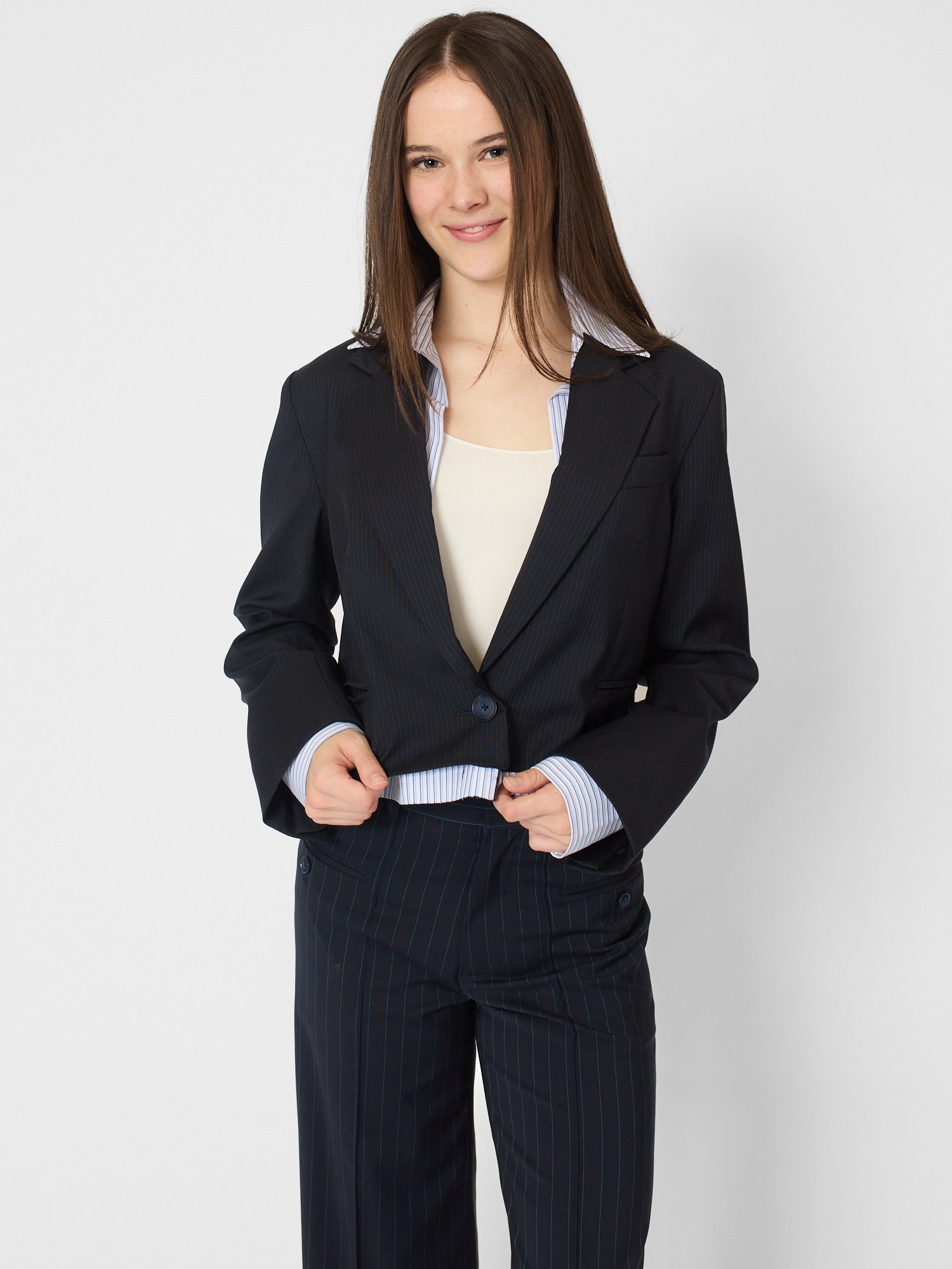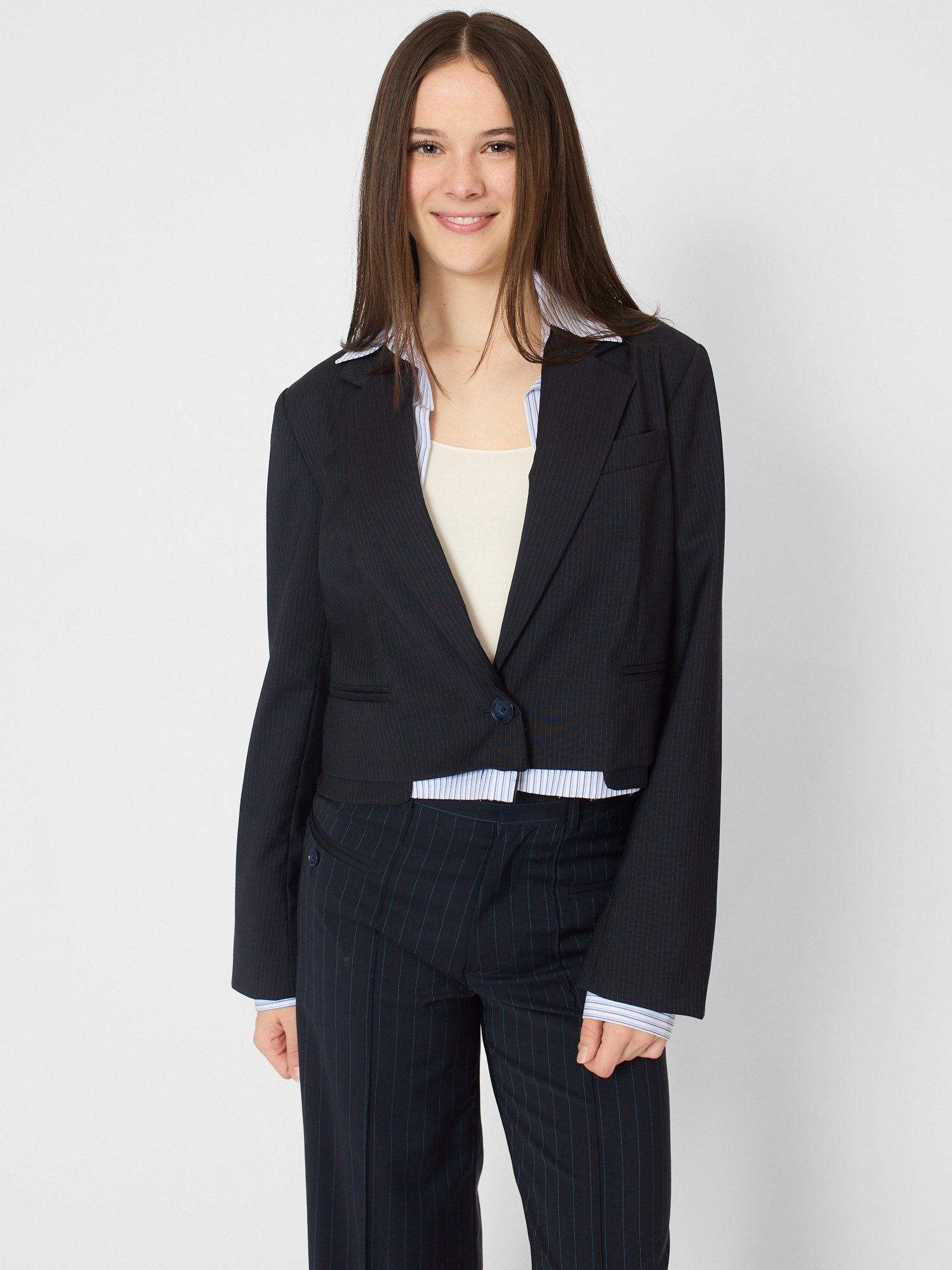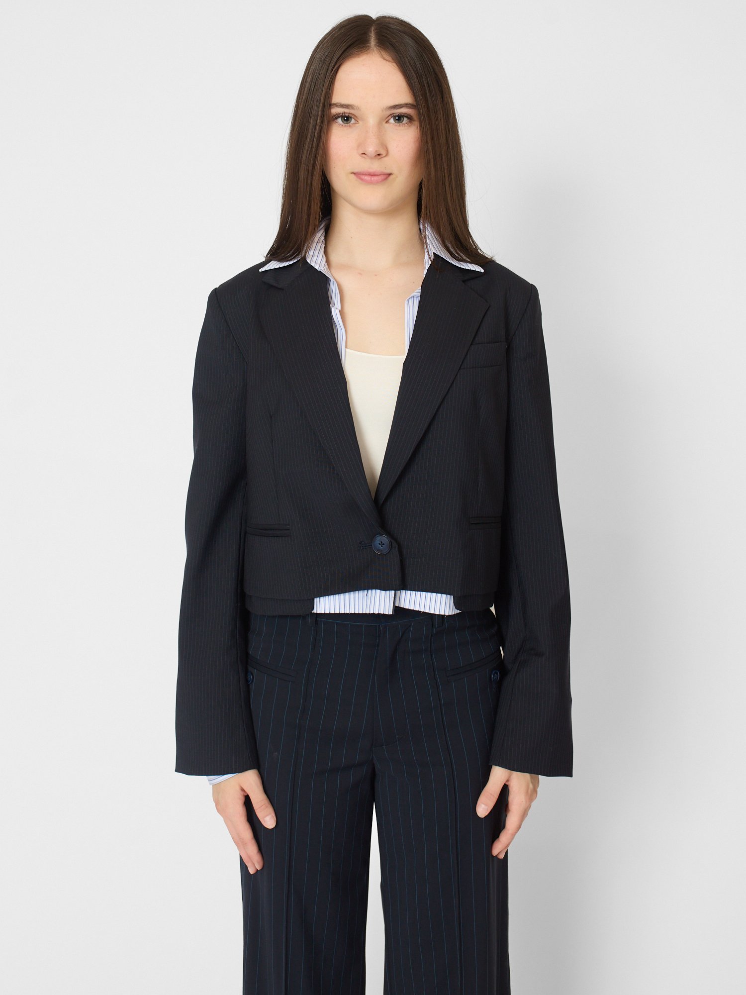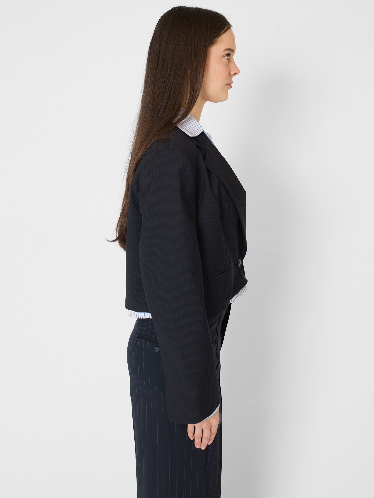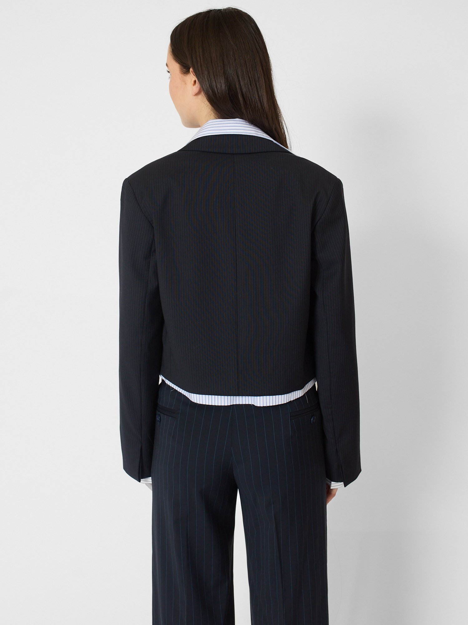 The cropped tailored blazer has a crisp, detachable cotton poplin underlayer that mimics the look of a layered shirt.
