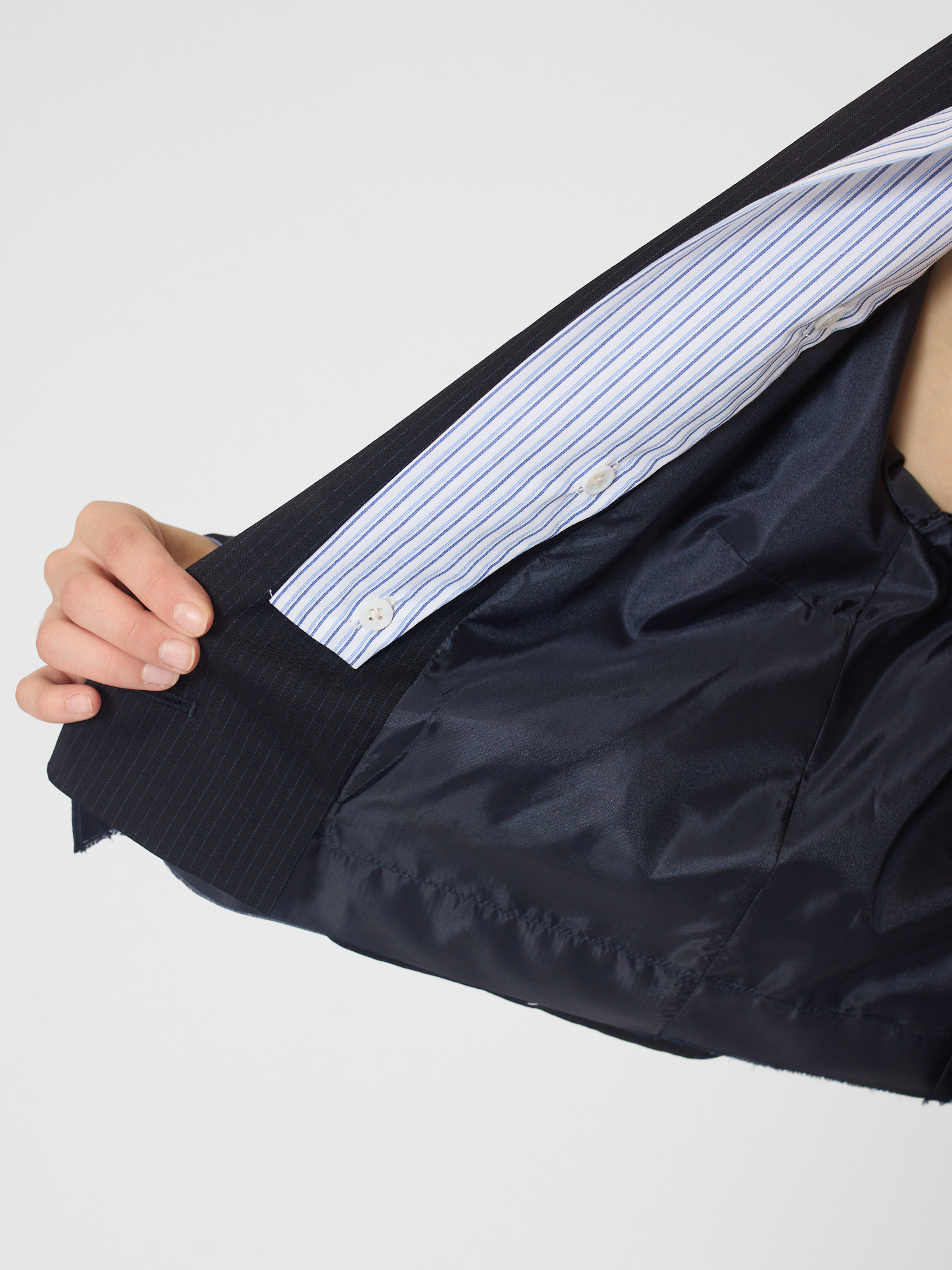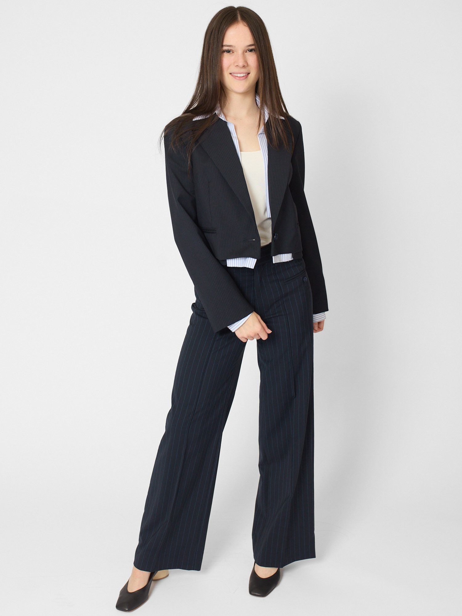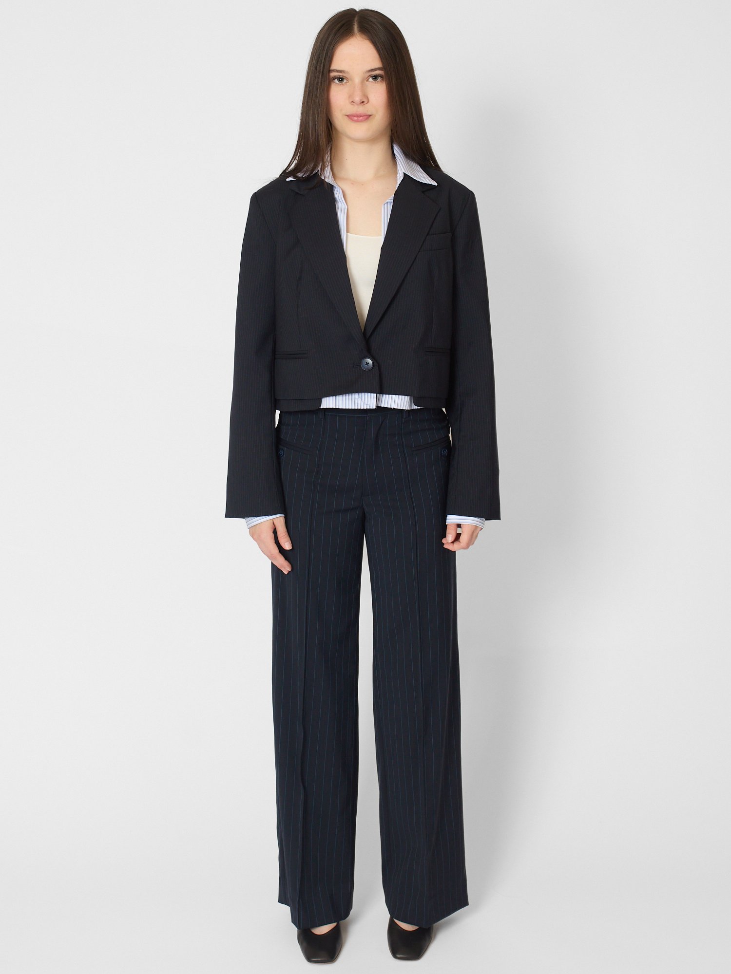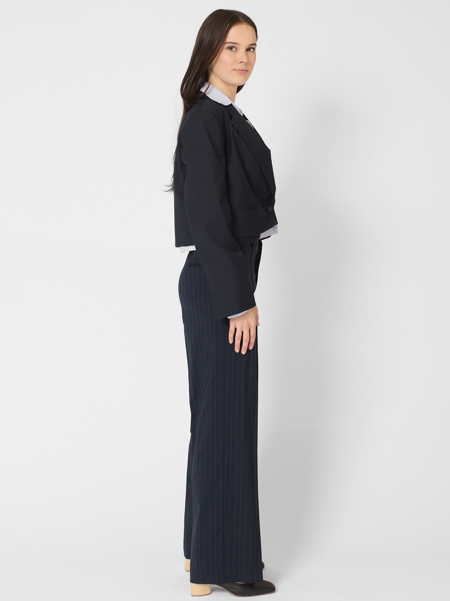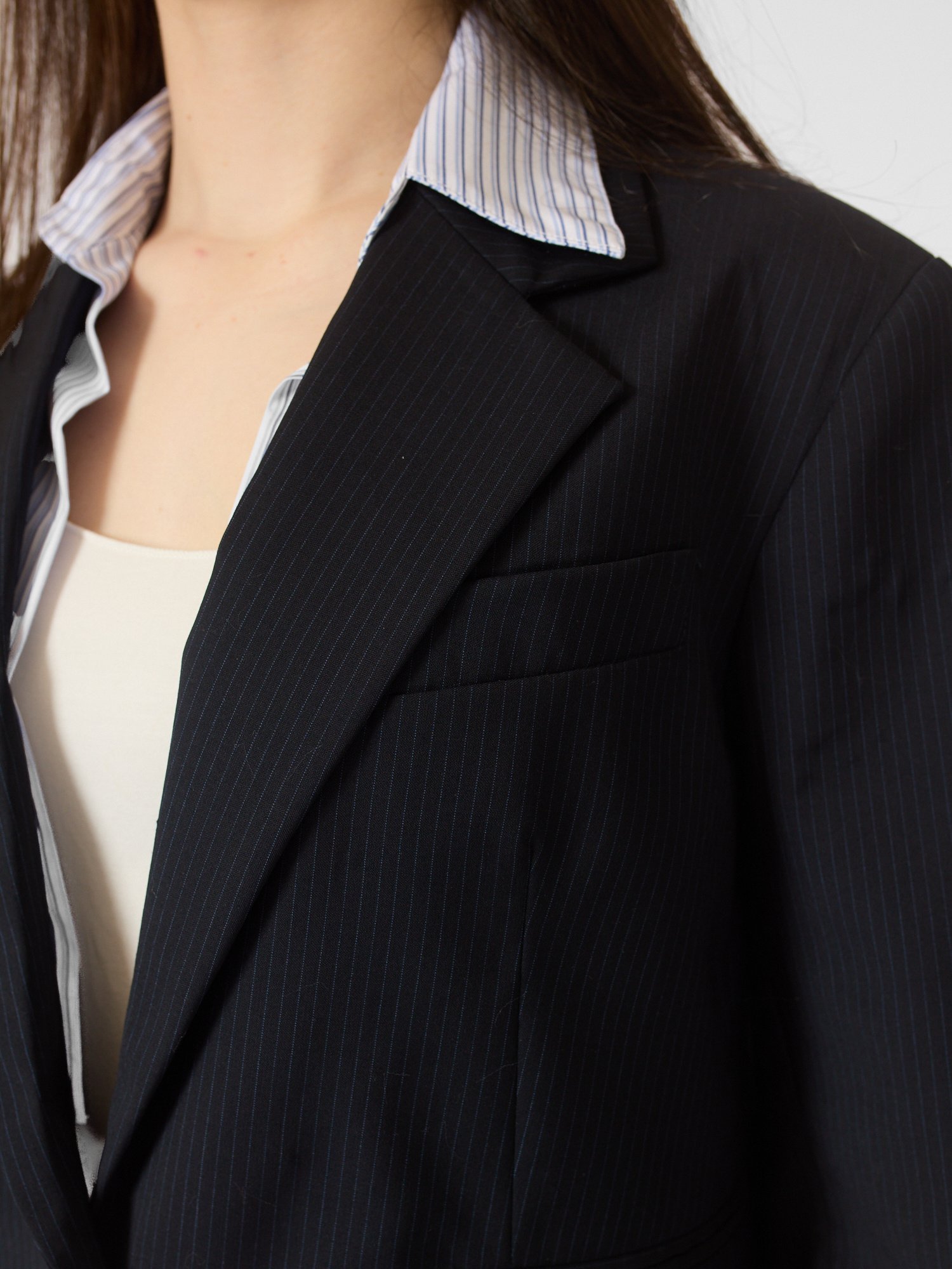 The cropped tailored blazer has a crisp, detachable cotton poplin underlayer that mimics the look of a layered shirt.