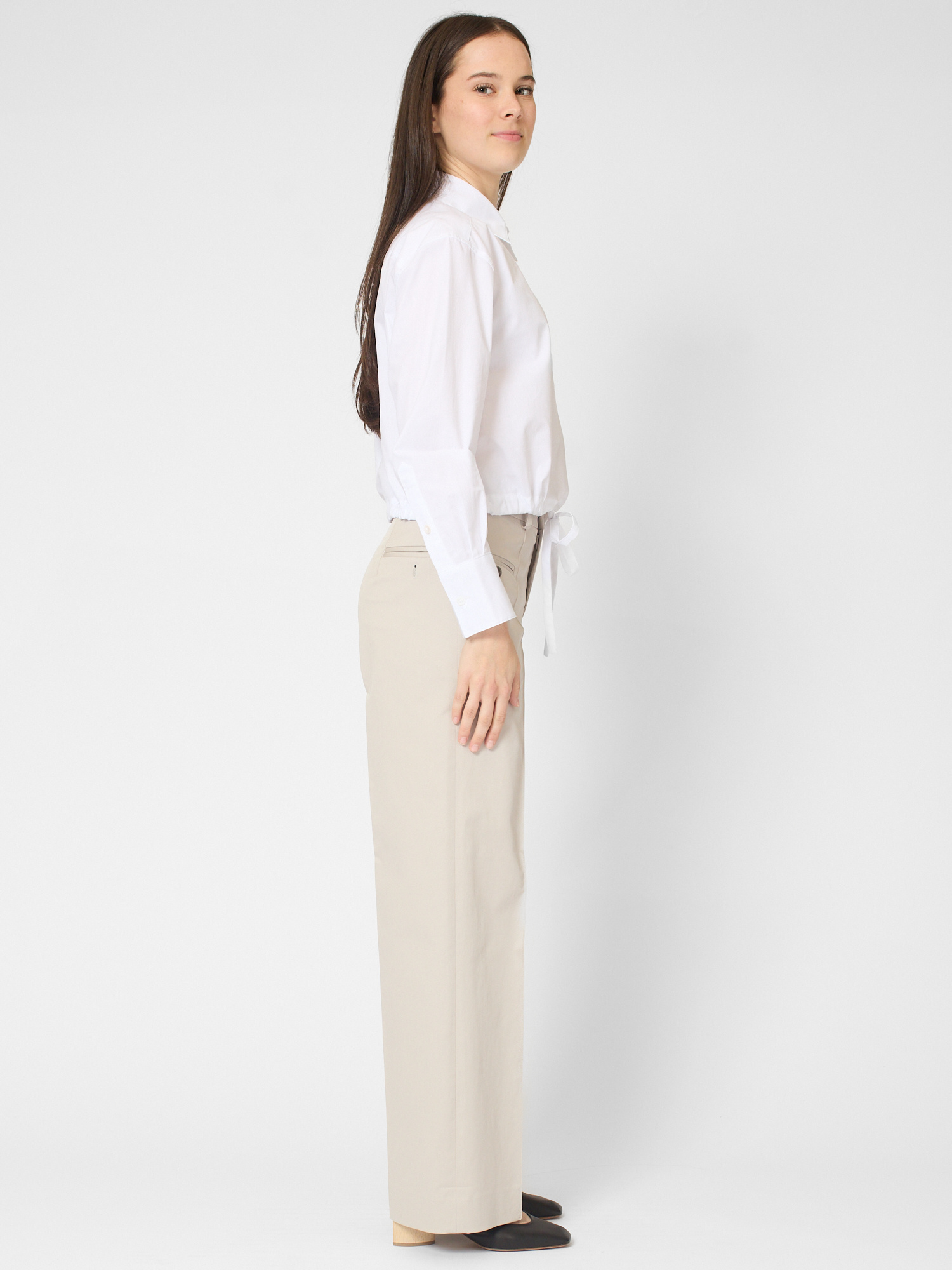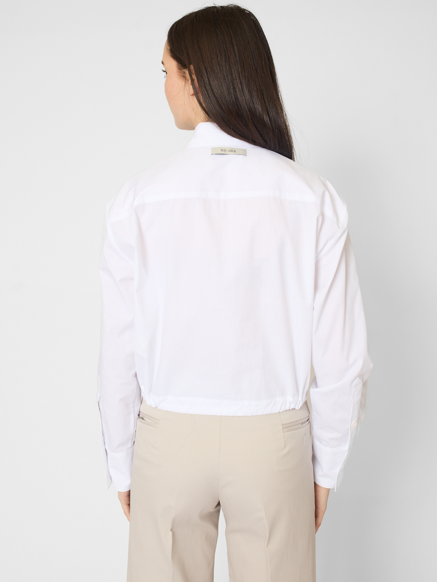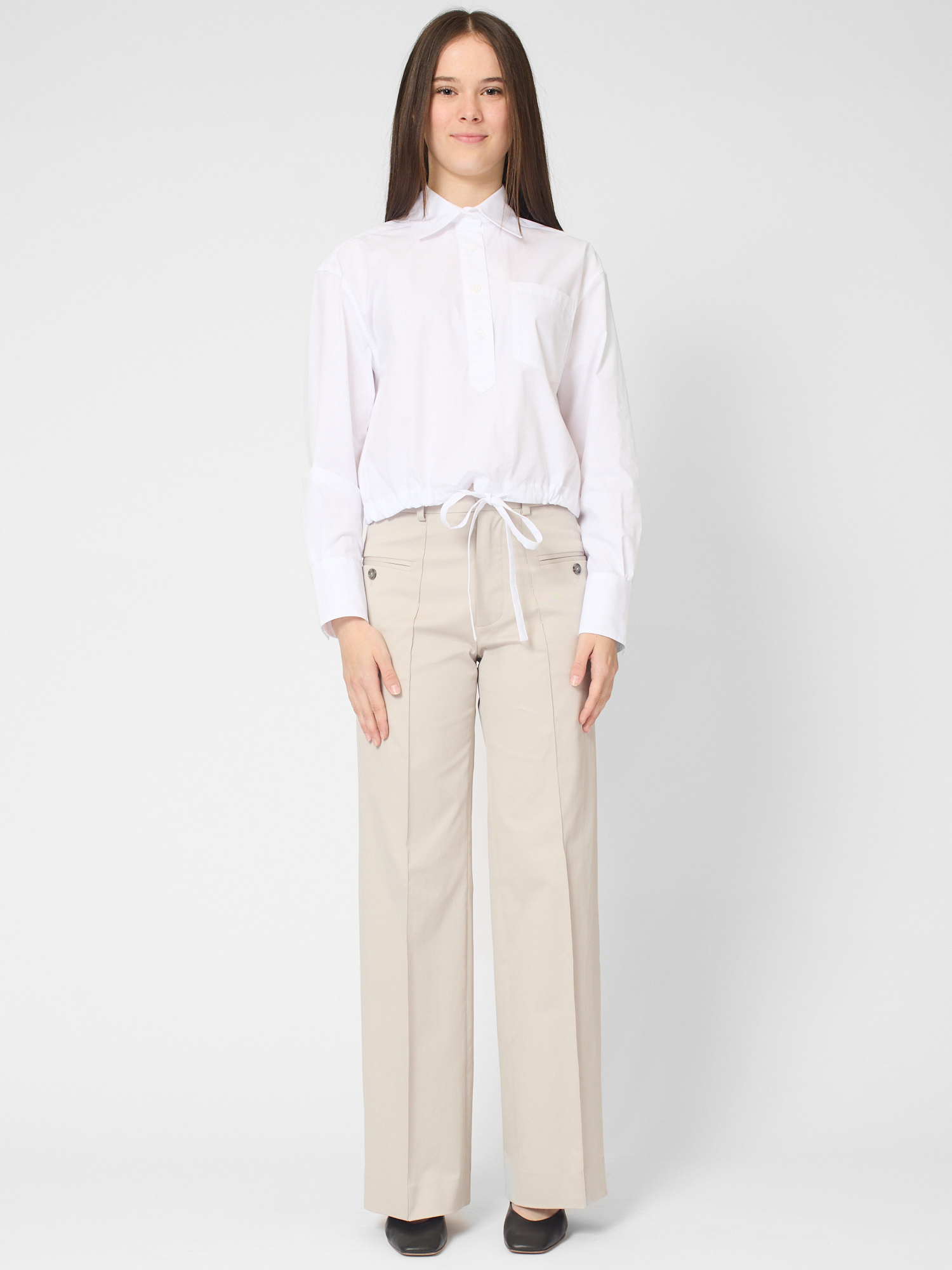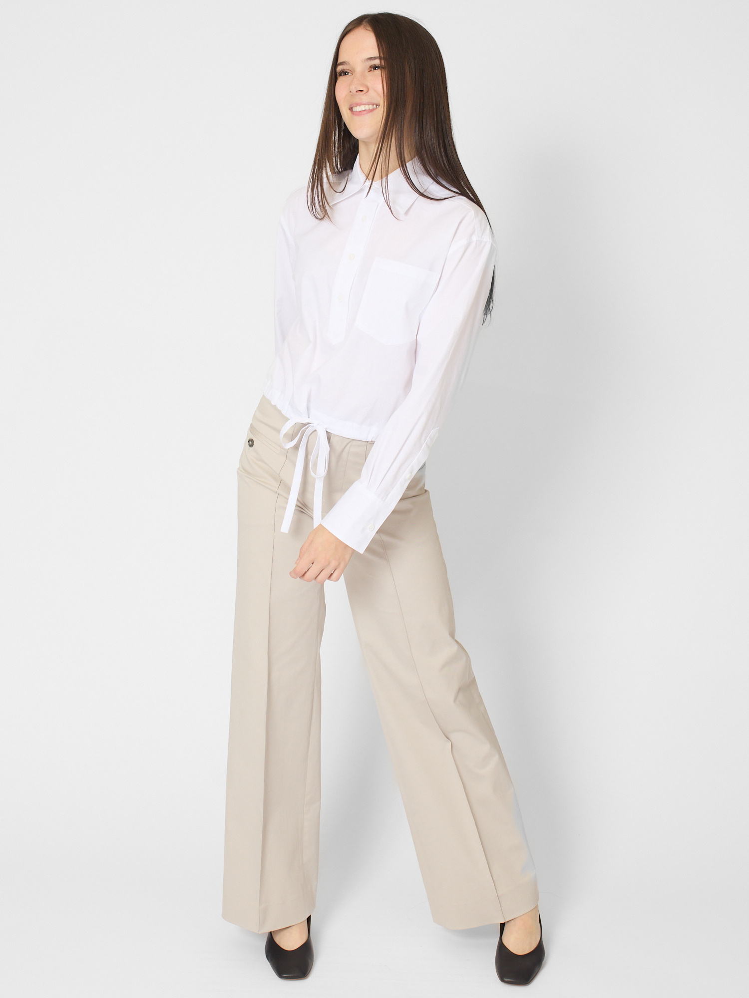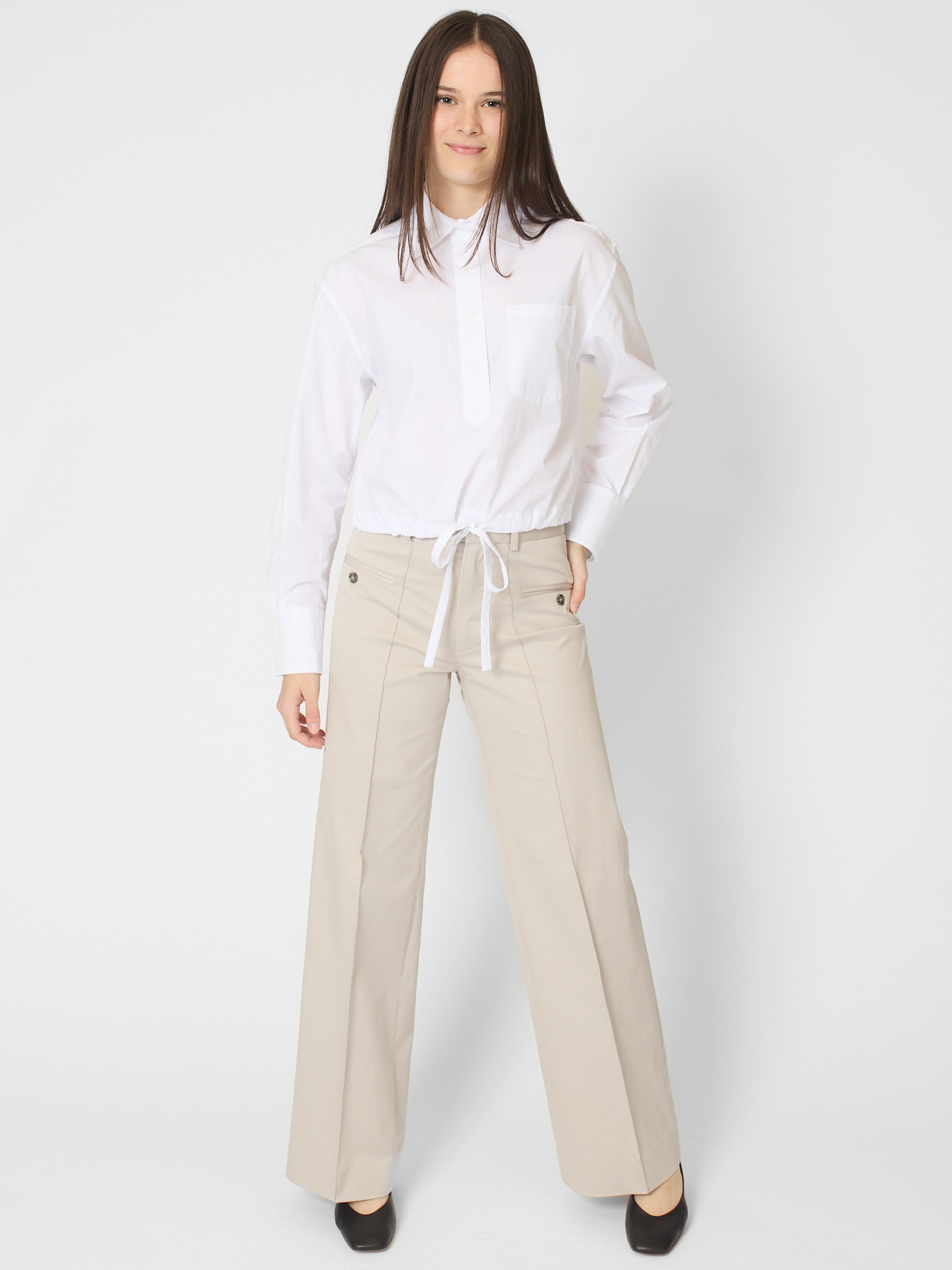 Henley poplin shirt is defined by its functional drawstring hem, which allows for a customizable fit that balances structured cinched tailoring with relaxed volume