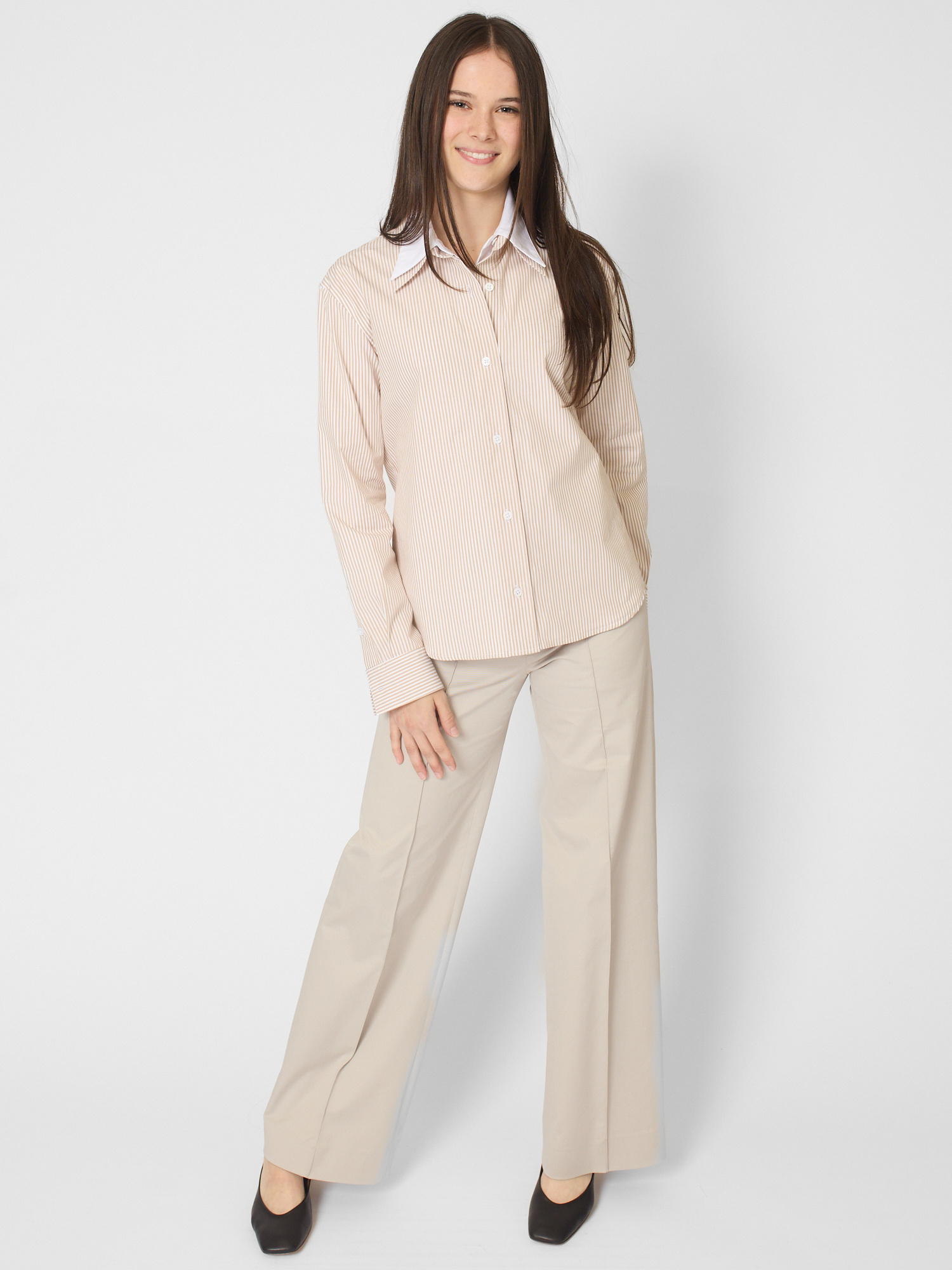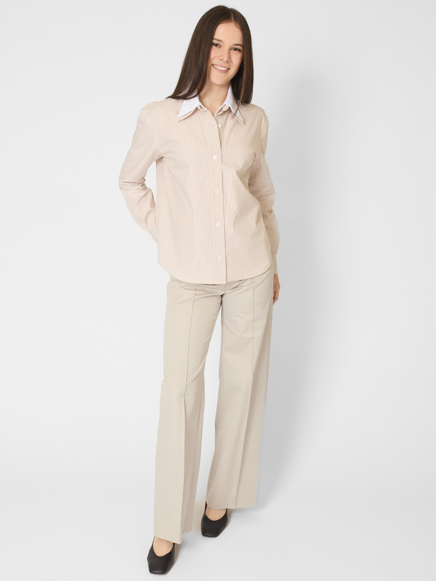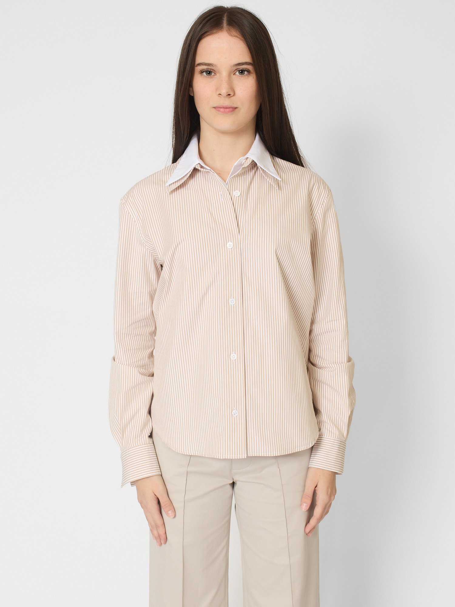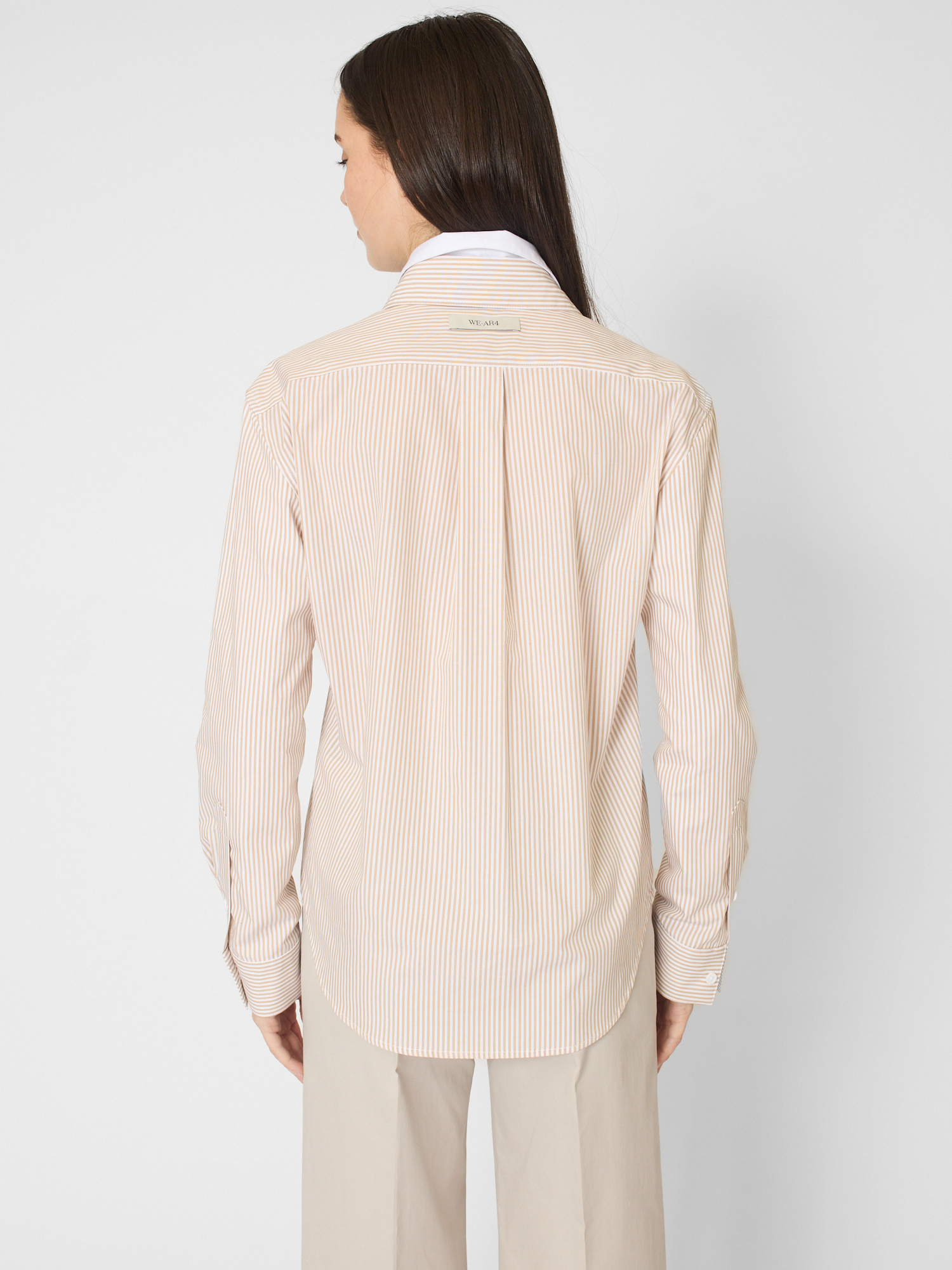 The design pairs a traditional pinstripe exterior with a crisp white inner layer in a two-in-one silhouette with double collars and cuffs