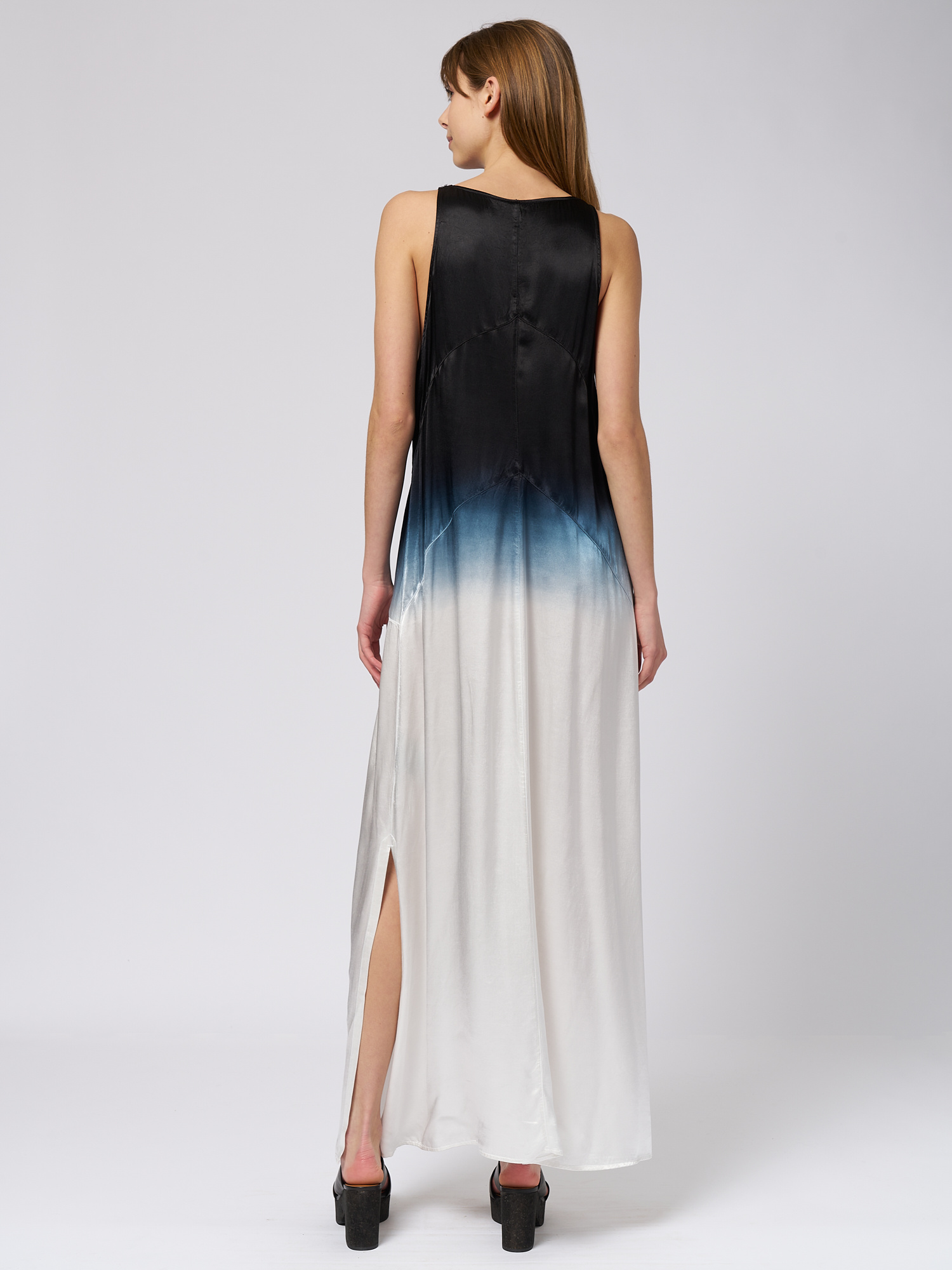 The Pebble satin dress features kangaroo pockets, curved horizontal bands in the back, and a deep v-neckline.