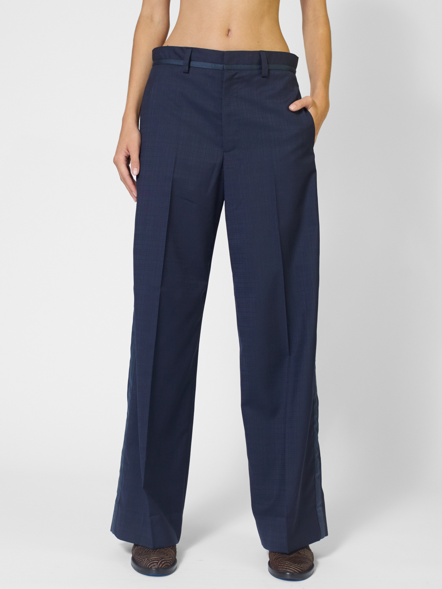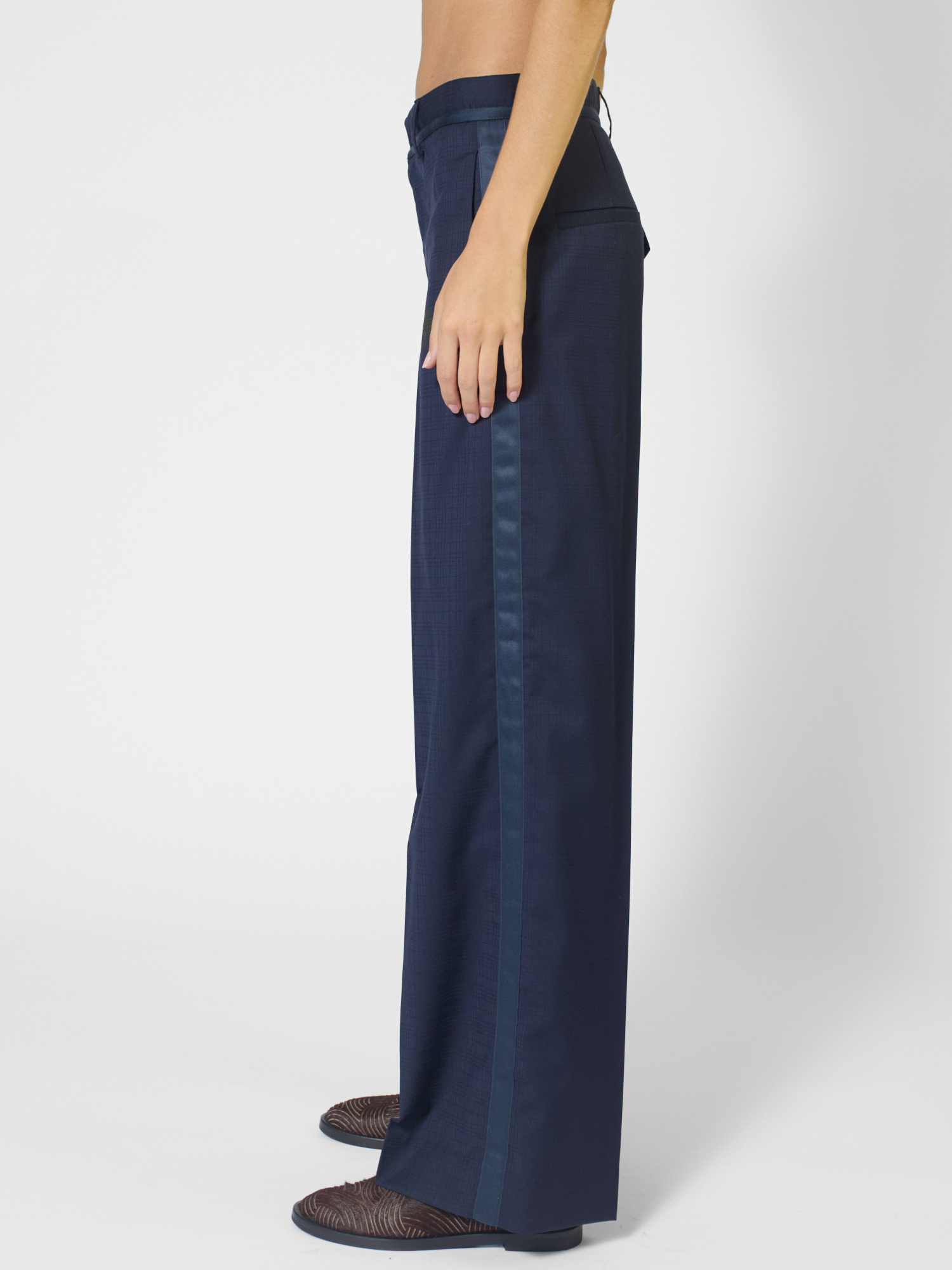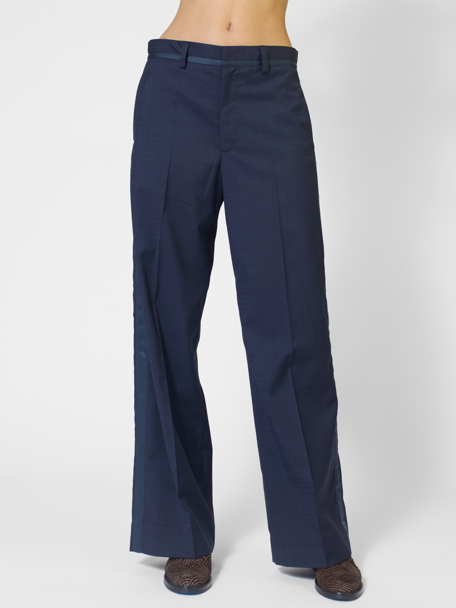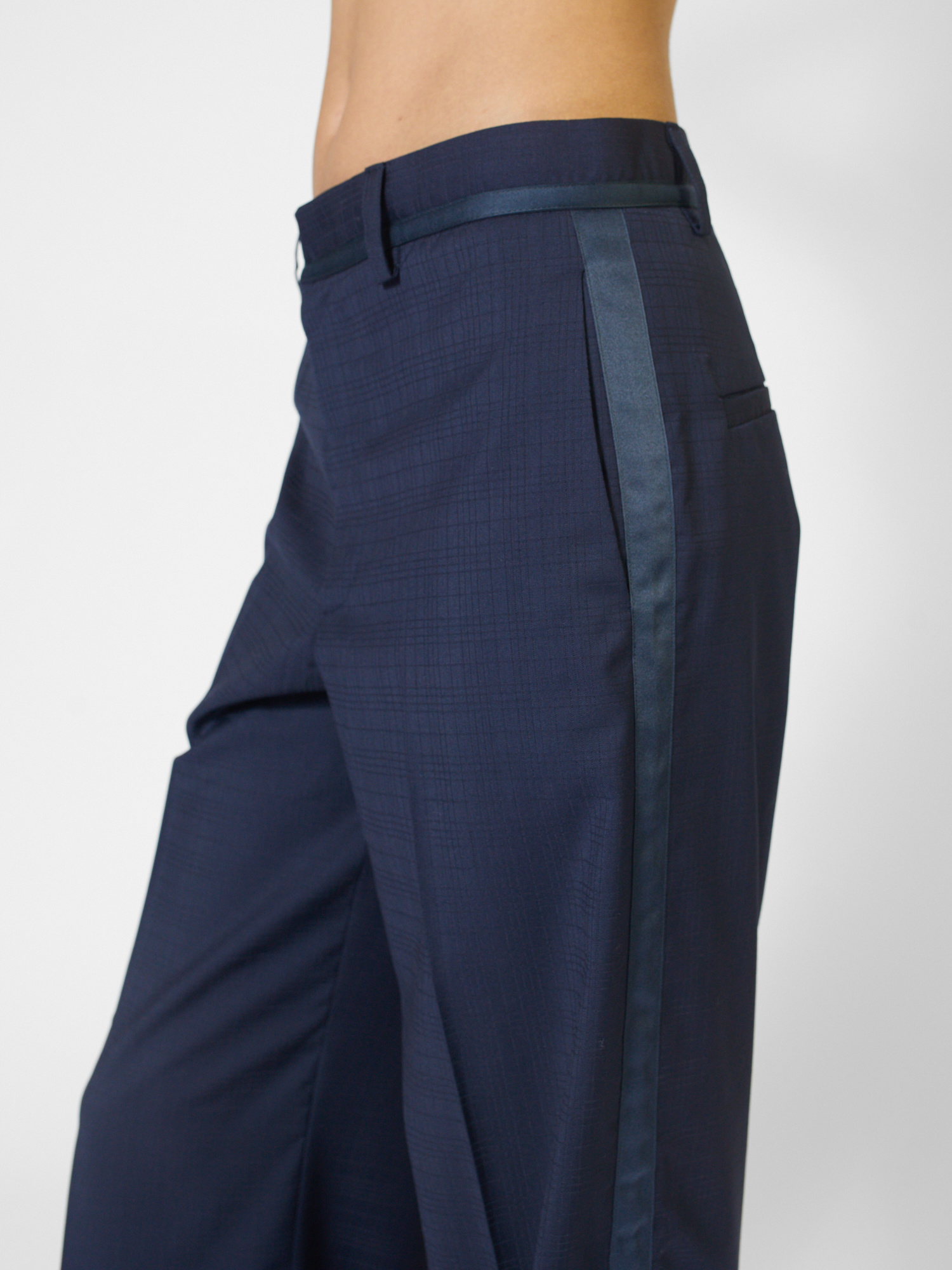 The menswear-inspired pant features a satin ribbon insert along the outside leg and at the waistband.