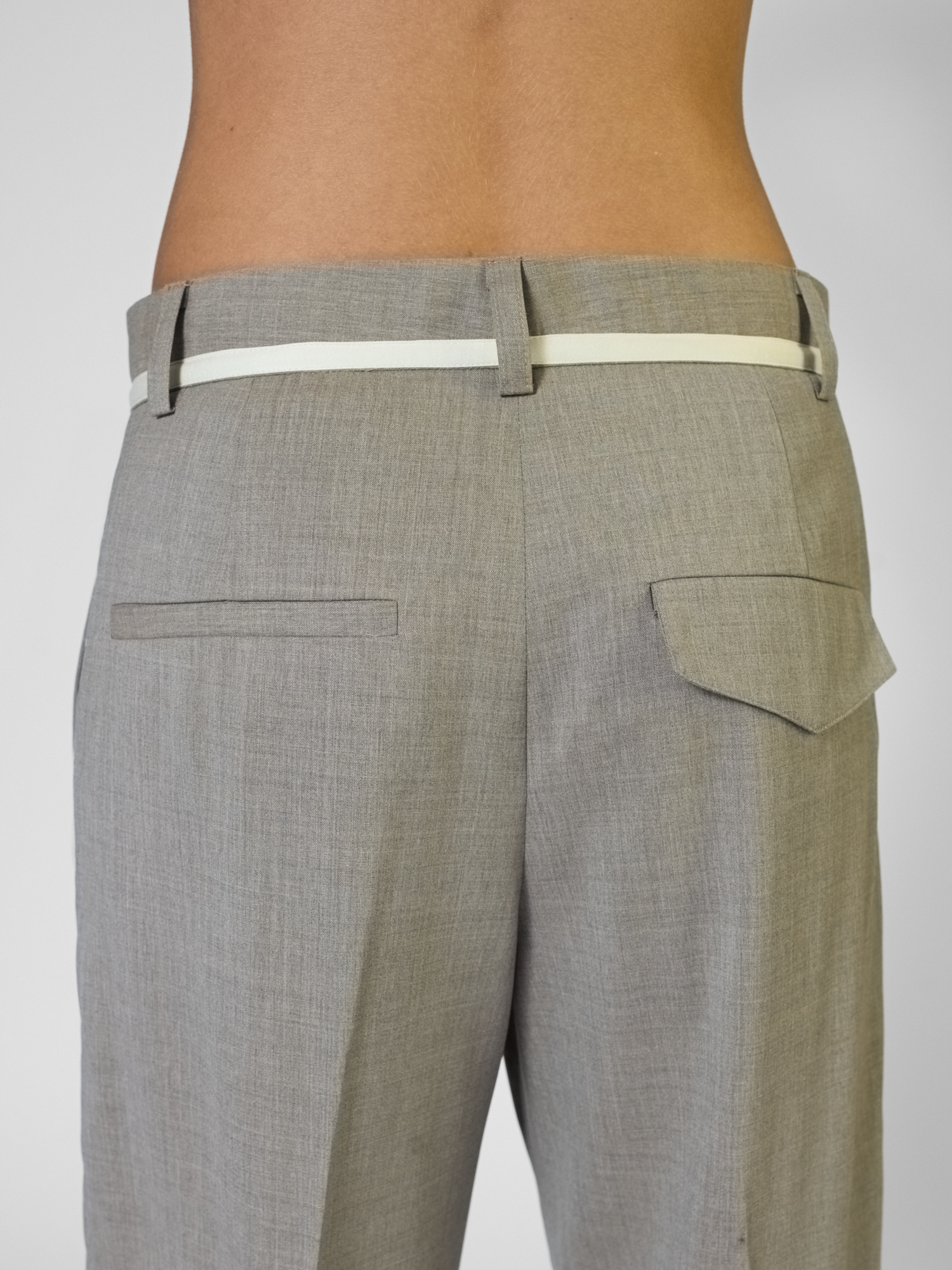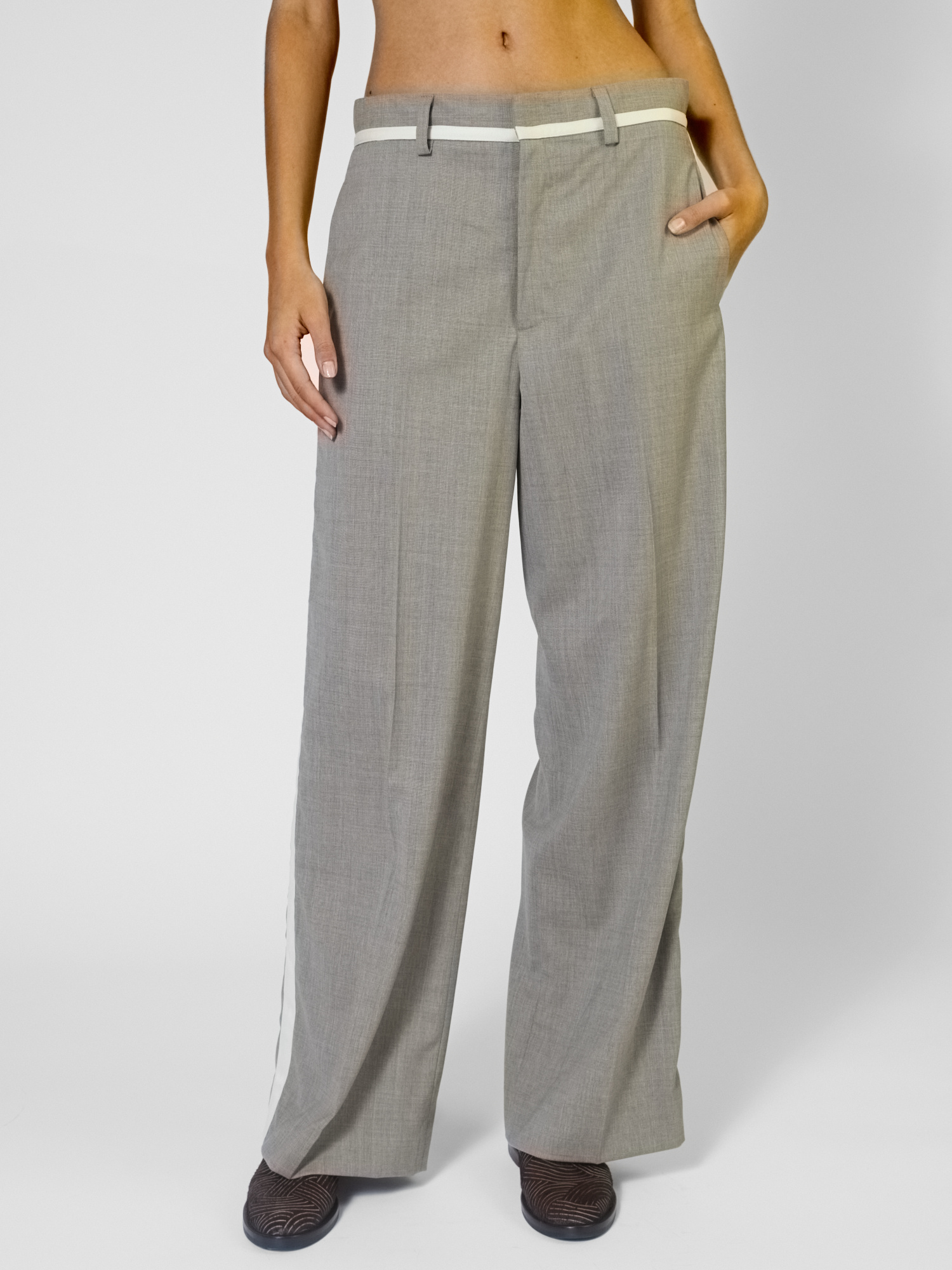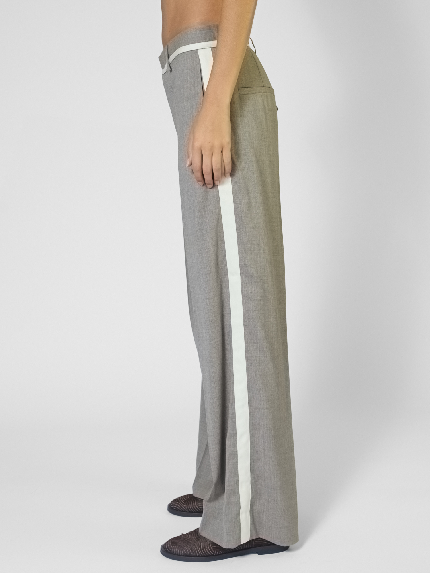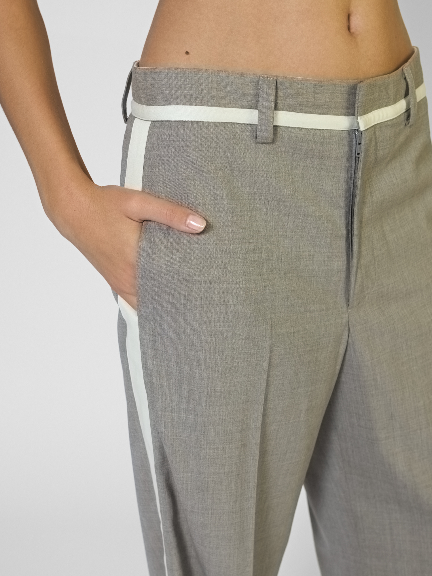 The menswear-inspired pant features a satin ribbon insert along the outside leg and at the waistband.